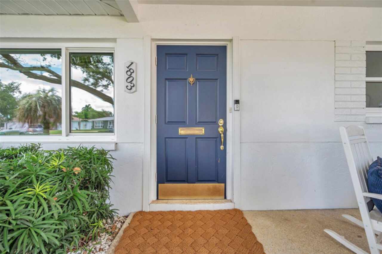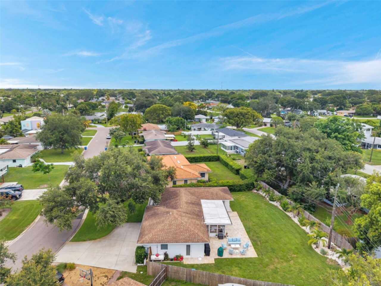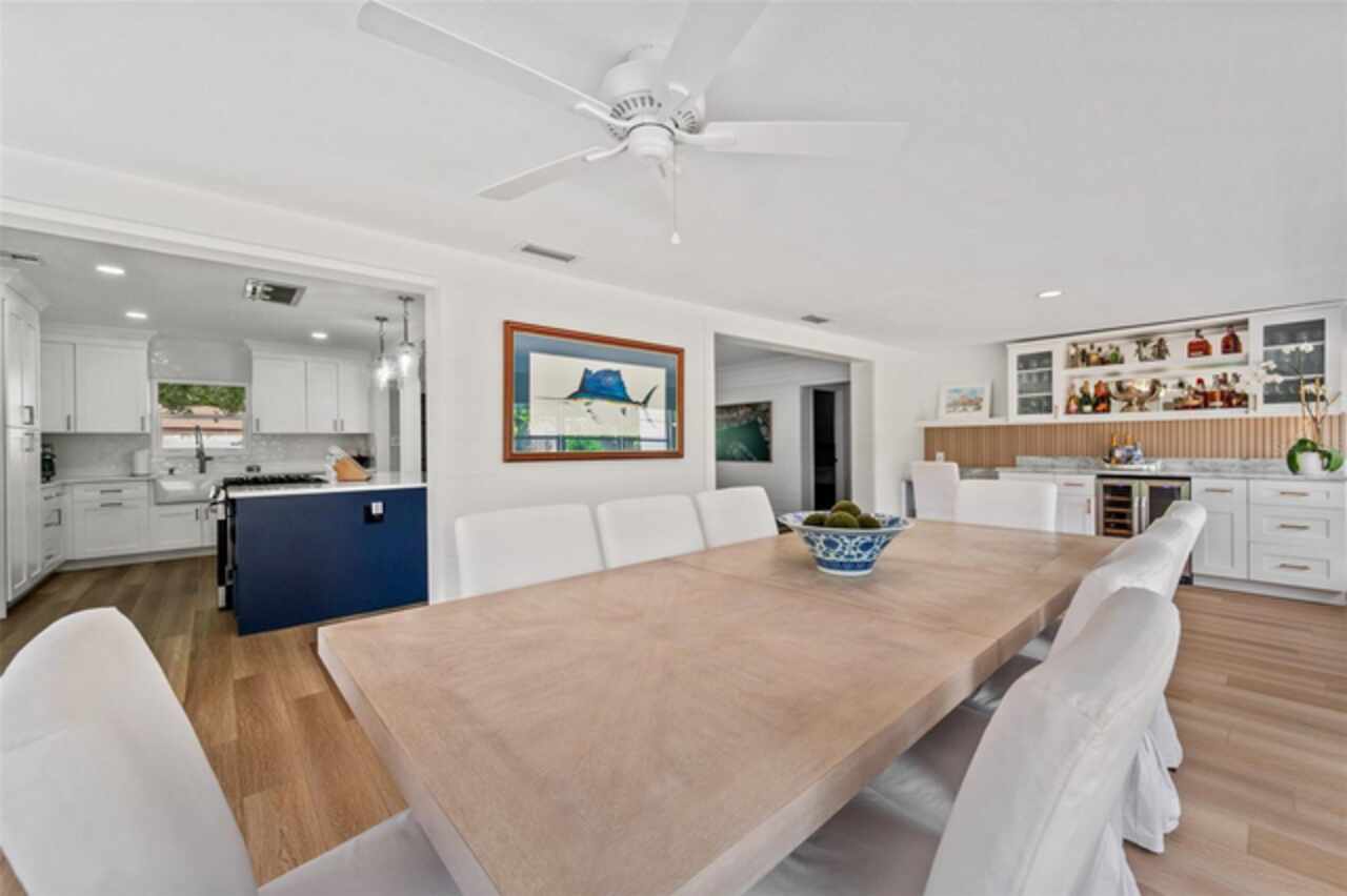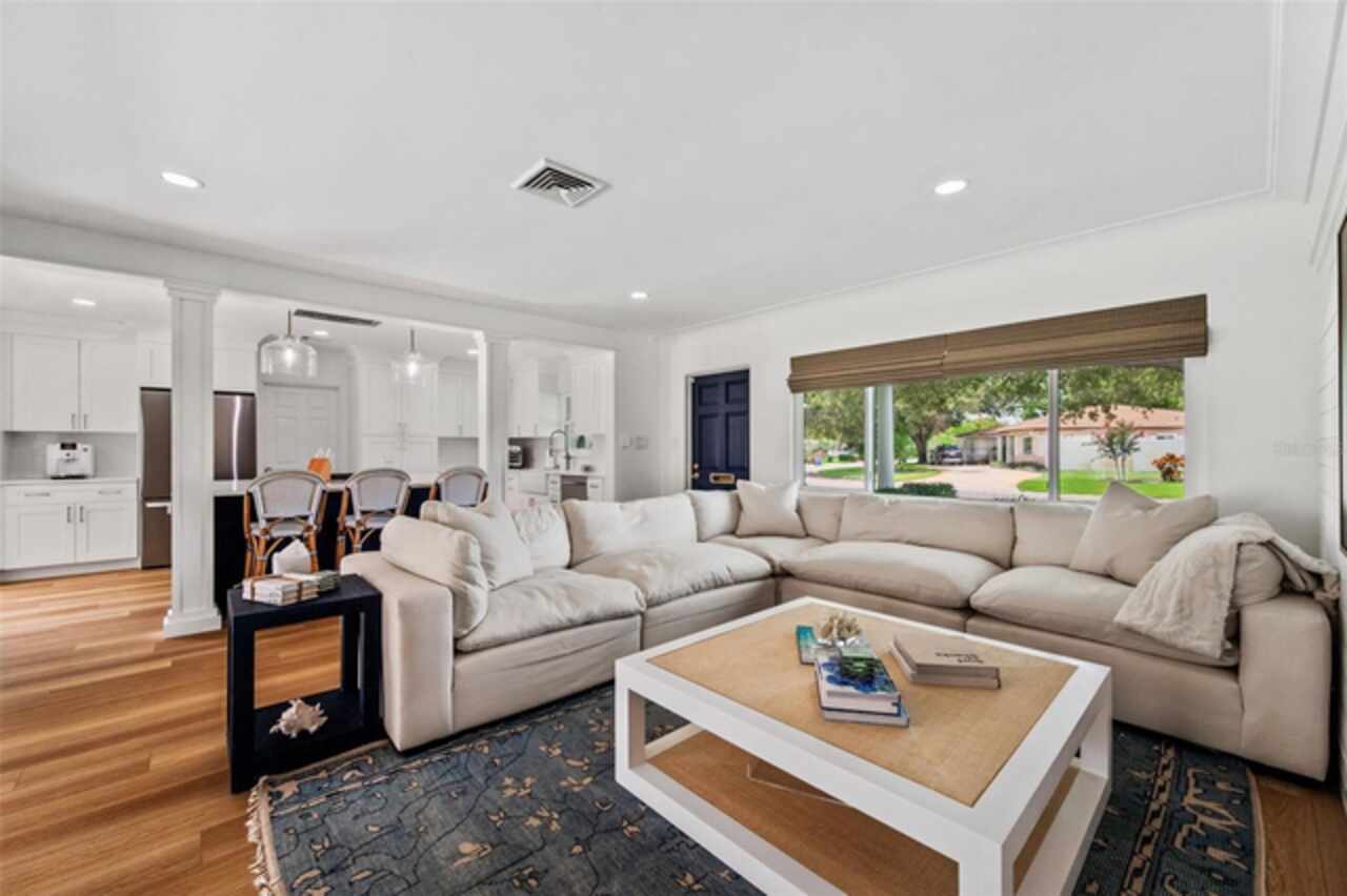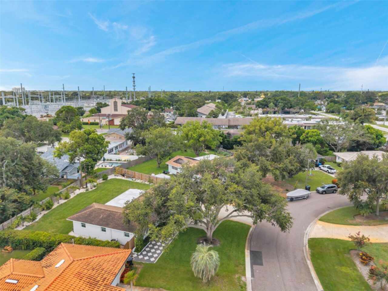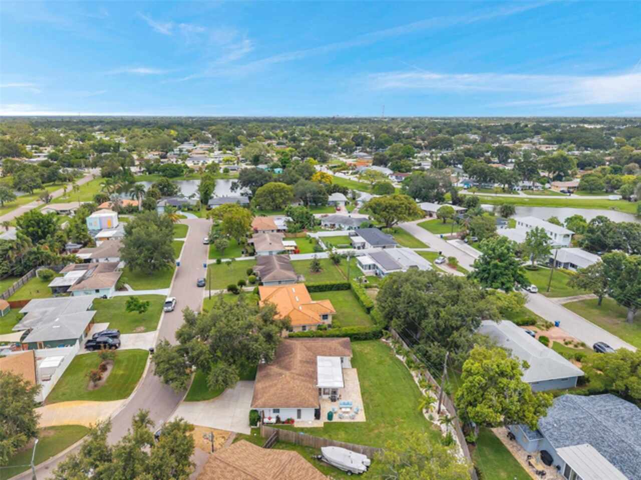 Welcome to this fully remodeled 2-bedroom, 2-bathroom block home with 1, 421 sq ft of living space, a 1-car garage, and timeless coastal charm. Situated high and dry on a quiet street with no flood zone concerns. A welcoming front porch and a large, beautiful shade tree add charm and curb appeal to the front yard. Step inside to an open-concept layout with soft coastal tones, recessed lighting, and luxury vinyl plank flooring throughout. The spacious living room features a shiplap accent wall, and the primary bedroom also includes a stylish shiplap feature for added character. The updated eat-in kitchen is a showstopper with a large center island, propane gas range, ceiling-mounted hood, apron-front farm sink, subway tile backsplash, granite countertops, shaker cabinetry, bar seating, and an undermount microwave. A sun-drenched bonus room at the rear offers formal dining or flex space, complete with a dry bar, wine cooler, and access to the expansive travertine tile patio and beautifully landscaped, fenced backyard with ample room for a pool. The main bathroom boasts a double vanity and large LED mirror. The garage includes the original second bathroom (not in heated sq ft), providing potential to convert into an owner’s suite. Additional highlights include impact-rated windows and doors, Tesla EV charger, and fresh interior/exterior paint. Just minutes to I-275, shopping, dining, beaches, and vibrant downtown St. Pete.