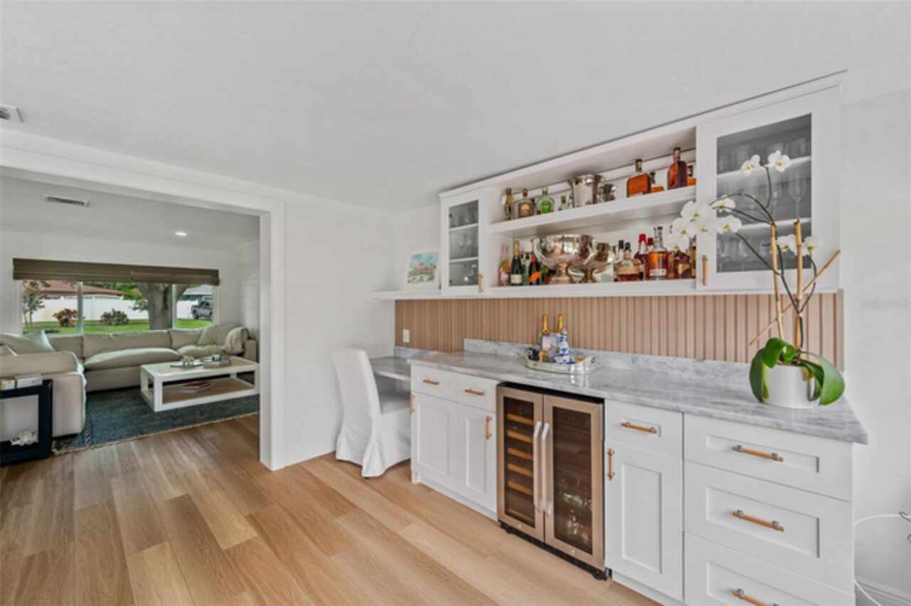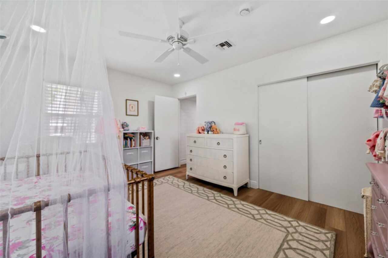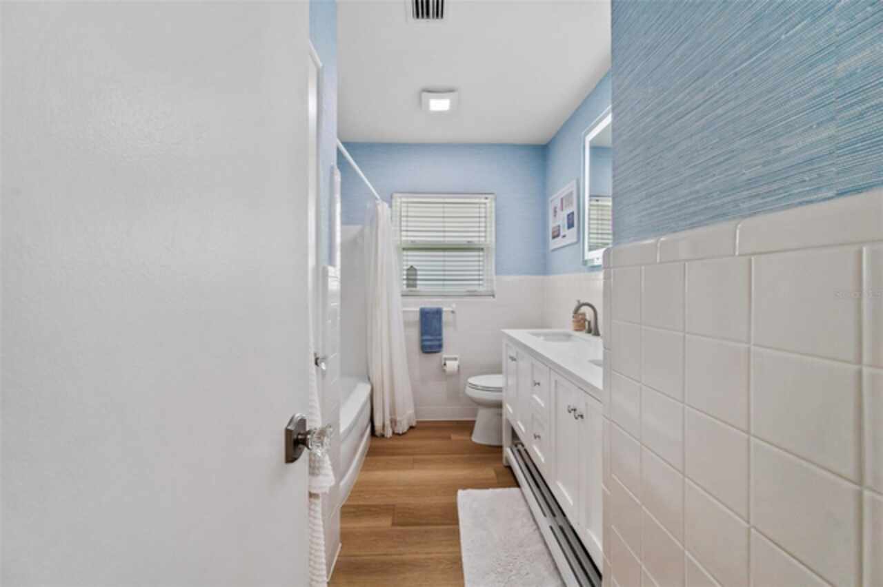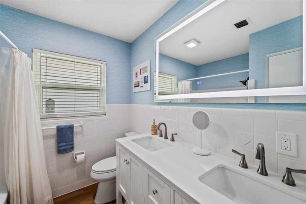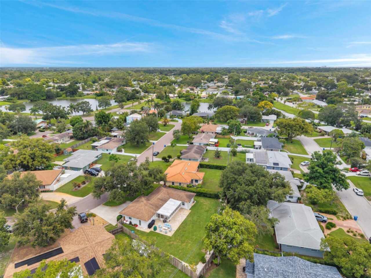 Welcome to this fully remodeled 2-bedroom, 2-bathroom block home with 1, 421 sq ft of living space, a 1-car garage, and timeless coastal charm. Situated high and dry on a quiet street with no flood zone concerns. A welcoming front porch and a large, beautiful shade tree add charm and curb appeal to the front yard. Step inside to an open-concept layout with soft coastal tones, recessed lighting, and luxury vinyl plank flooring throughout. The spacious living room features a shiplap accent wall, and the primary bedroom also includes a stylish shiplap feature for added character. The updated eat-in kitchen is a showstopper with a large center island, propane gas range, ceiling-mounted hood, apron-front farm sink, subway tile backsplash, granite countertops, shaker cabinetry, bar seating, and an undermount microwave. A sun-drenched bonus room at the rear offers formal dining or flex space, complete with a dry bar, wine cooler, and access to the expansive travertine tile patio and beautifully landscaped, fenced backyard with ample room for a pool. The main bathroom boasts a double vanity and large LED mirror. The garage includes the original second bathroom (not in heated sq ft), providing potential to convert into an owner’s suite. Additional highlights include impact-rated windows and doors, Tesla EV charger, and fresh interior/exterior paint. Just minutes to I-275, shopping, dining, beaches, and vibrant downtown St. Pete.