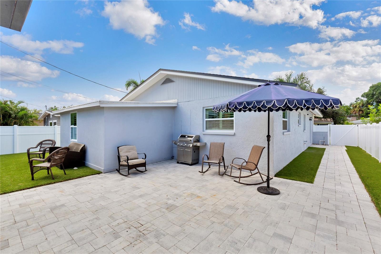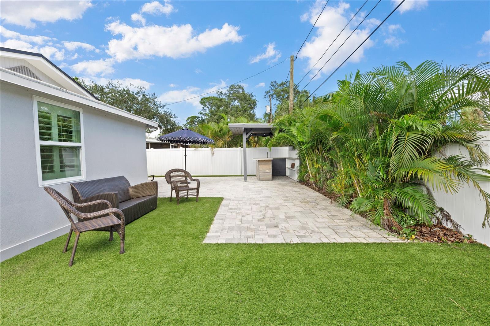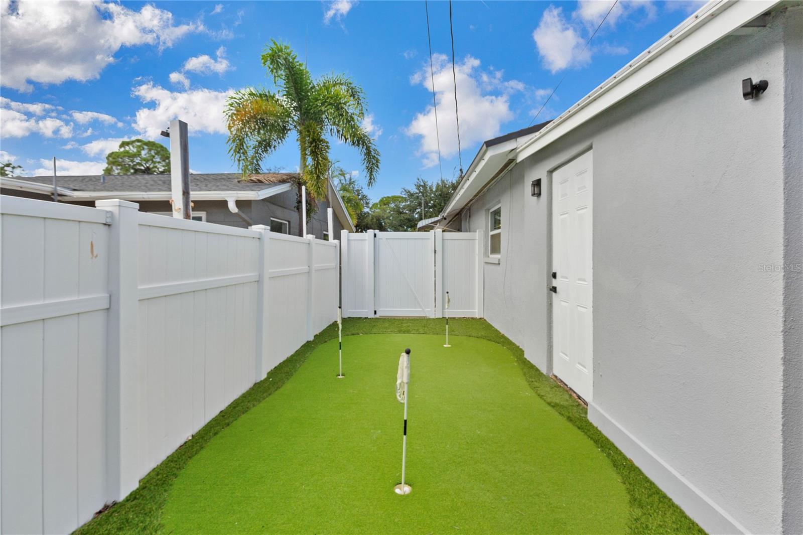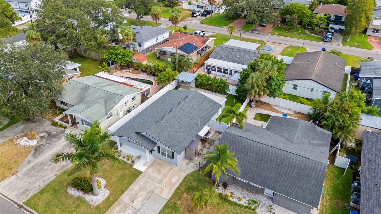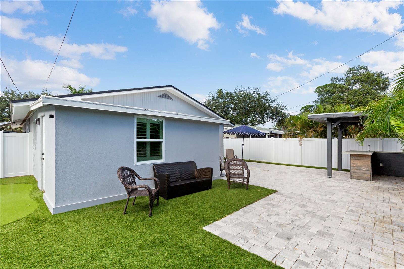 Welcome to Shore Acres, one of St. Petersburg’s most desirable neighborhoods, located less than 5 miles from vibrant Downtown St. Petersburg, where you’ll find acclaimed restaurants, waterfront parks, cultural venues, and shopping. This beautifully updated 3-bedroom, 2-bath residence offers a blend of modern comfort and coastal charm. Renovated in 2020, the home also features a 2022 roof, elevated 2022 HVAC system on a hurricane pad, and a brand-new 2024 tankless water heater. Inside, the open concept layout includes luxury vinyl plank flooring throughout the main living areas, a kitchen with quartz countertops and a waterfall edge peninsula that seats four, and marble tile finishes in both bathrooms. The split floor plan includes two spacious secondary bedrooms and a generous primary suite with a walk-in closet, space for a sitting area or office, and a well-appointed bathroom. A dedicated laundry room with shiplap accents adds convenience and charm. Outdoor living is equally inviting, with a private backyard designed for entertaining. Highlights include a covered bar with seating, a putting and chipping green, and multiple patio areas. Vinyl fencing and irrigation complete the exterior. The property is located in Flood Zone AE. The City of St. Petersburg has allocated funds for a new pump station to improve water retention in the neighborhood, with construction expected in the coming years. Conveniently situated near Shore Acres Recreation Center, local parks, golf, boat ramps, and less than 25 minutes to St. Pete Beach and Tampa International Airport, this home offers both comfort and accessibility to all that Tampa Bay has to give.