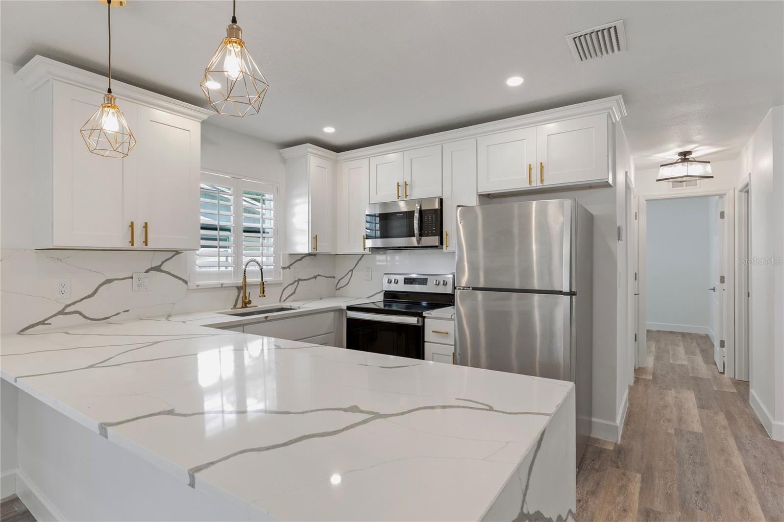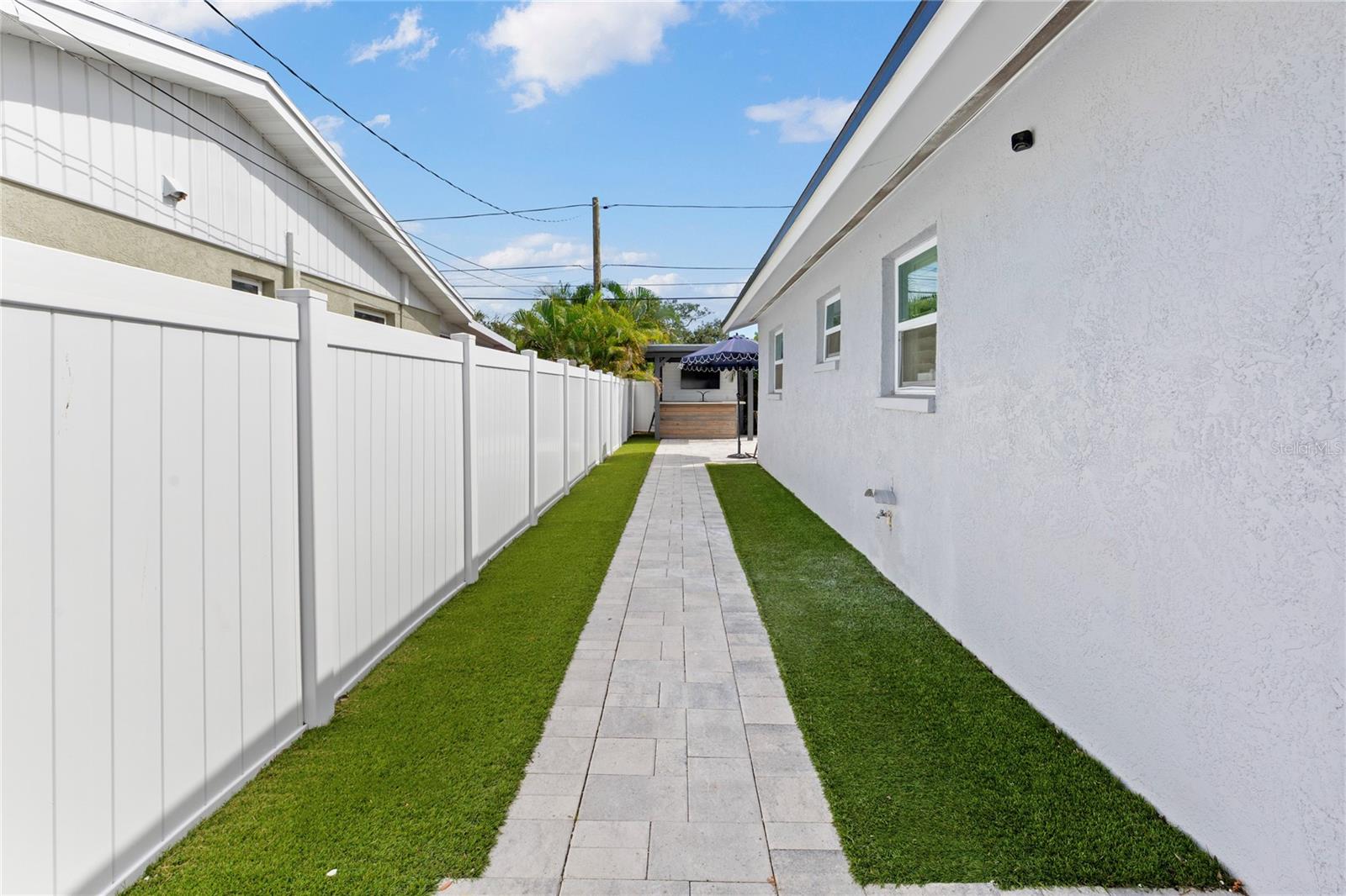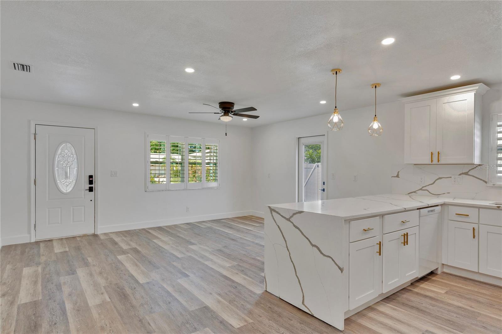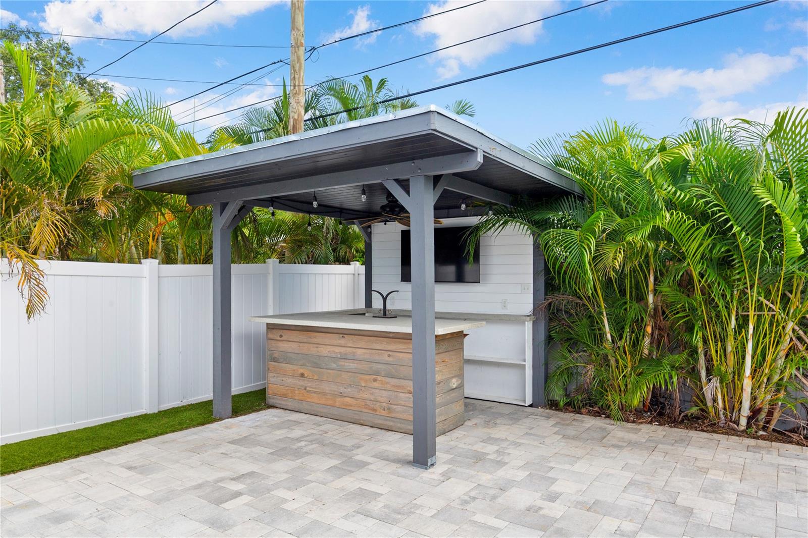 Welcome to Shore Acres, one of St. Petersburg’s most desirable neighborhoods, located less than 5 miles from vibrant Downtown St. Petersburg, where you’ll find acclaimed restaurants, waterfront parks, cultural venues, and shopping. This beautifully updated 3-bedroom, 2-bath residence offers a blend of modern comfort and coastal charm. Renovated in 2020, the home also features a 2022 roof, elevated 2022 HVAC system on a hurricane pad, and a brand-new 2024 tankless water heater. Inside, the open concept layout includes luxury vinyl plank flooring throughout the main living areas, a kitchen with quartz countertops and a waterfall edge peninsula that seats four, and marble tile finishes in both bathrooms. The split floor plan includes two spacious secondary bedrooms and a generous primary suite with a walk-in closet, space for a sitting area or office, and a well-appointed bathroom. A dedicated laundry room with shiplap accents adds convenience and charm. Outdoor living is equally inviting, with a private backyard designed for entertaining. Highlights include a covered bar with seating, a putting and chipping green, and multiple patio areas. Vinyl fencing and irrigation complete the exterior. The property is located in Flood Zone AE. The City of St. Petersburg has allocated funds for a new pump station to improve water retention in the neighborhood, with construction expected in the coming years. Conveniently situated near Shore Acres Recreation Center, local parks, golf, boat ramps, and less than 25 minutes to St. Pete Beach and Tampa International Airport, this home offers both comfort and accessibility to all that Tampa Bay has to give.