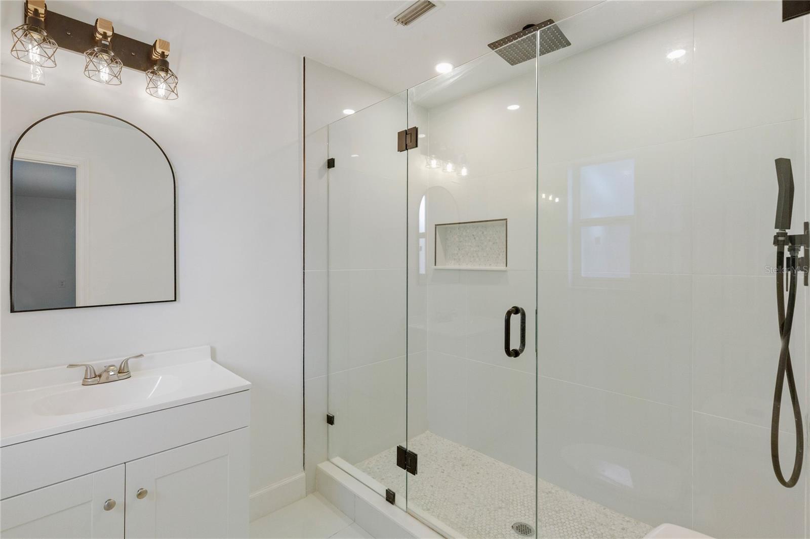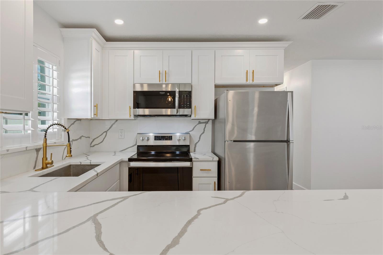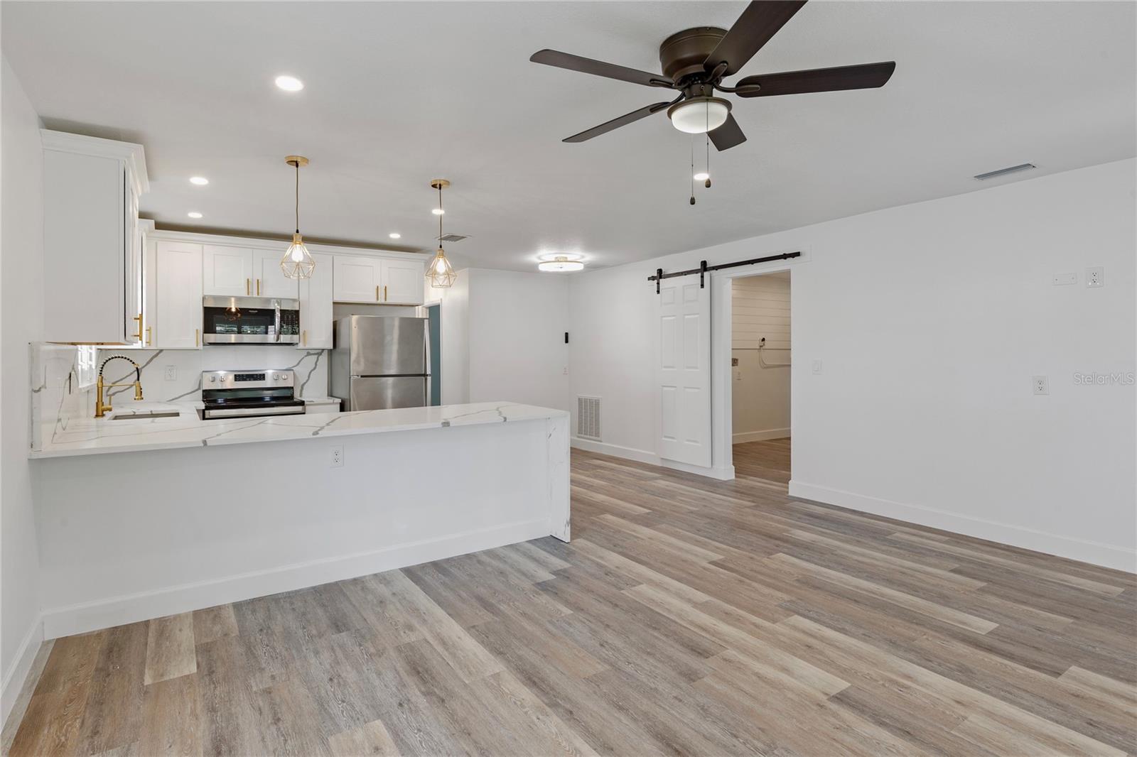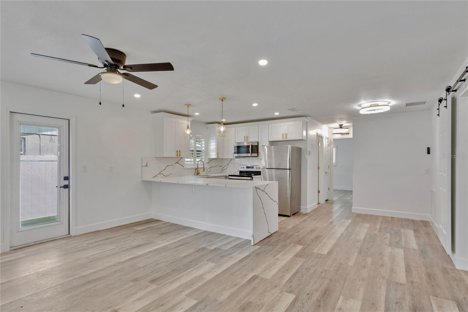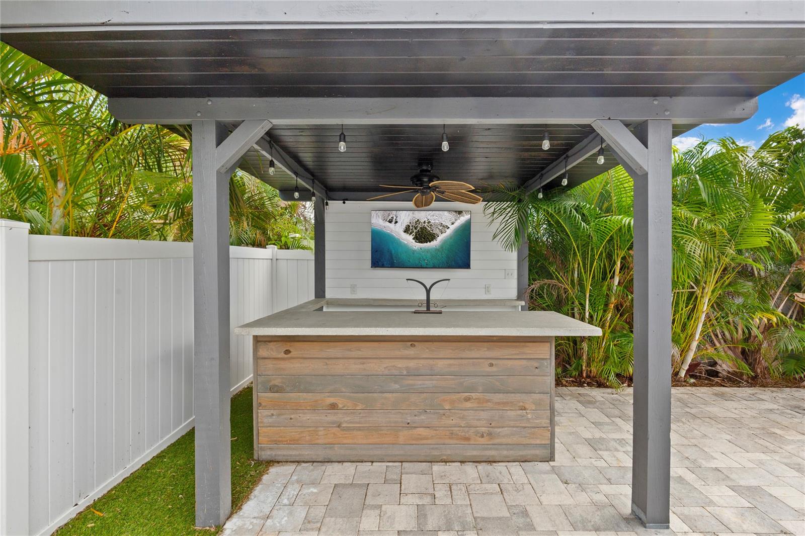 Welcome to Shore Acres, one of St. Petersburg’s most desirable neighborhoods, located less than 5 miles from vibrant Downtown St. Petersburg, where you’ll find acclaimed restaurants, waterfront parks, cultural venues, and shopping. This beautifully updated 3-bedroom, 2-bath residence offers a blend of modern comfort and coastal charm. Renovated in 2020, the home also features a 2022 roof, elevated 2022 HVAC system on a hurricane pad, and a brand-new 2024 tankless water heater. Inside, the open concept layout includes luxury vinyl plank flooring throughout the main living areas, a kitchen with quartz countertops and a waterfall edge peninsula that seats four, and marble tile finishes in both bathrooms. The split floor plan includes two spacious secondary bedrooms and a generous primary suite with a walk-in closet, space for a sitting area or office, and a well-appointed bathroom. A dedicated laundry room with shiplap accents adds convenience and charm. Outdoor living is equally inviting, with a private backyard designed for entertaining. Highlights include a covered bar with seating, a putting and chipping green, and multiple patio areas. Vinyl fencing and irrigation complete the exterior. The property is located in Flood Zone AE. The City of St. Petersburg has allocated funds for a new pump station to improve water retention in the neighborhood, with construction expected in the coming years. Conveniently situated near Shore Acres Recreation Center, local parks, golf, boat ramps, and less than 25 minutes to St. Pete Beach and Tampa International Airport, this home offers both comfort and accessibility to all that Tampa Bay has to give.