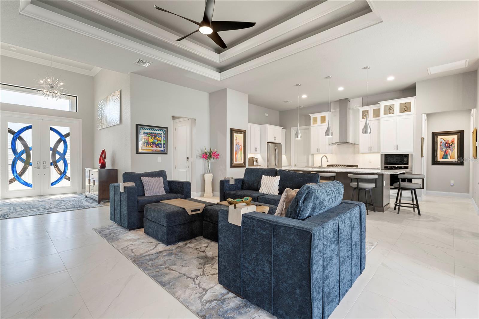 Built-in Features, Ceiling Fans(s), Crown Molding, High Ceilings, Open Floorplan, Split Bedroom, Stone Counters, Tray Ceiling(s), Walk-In Closet(s), Window Treatments