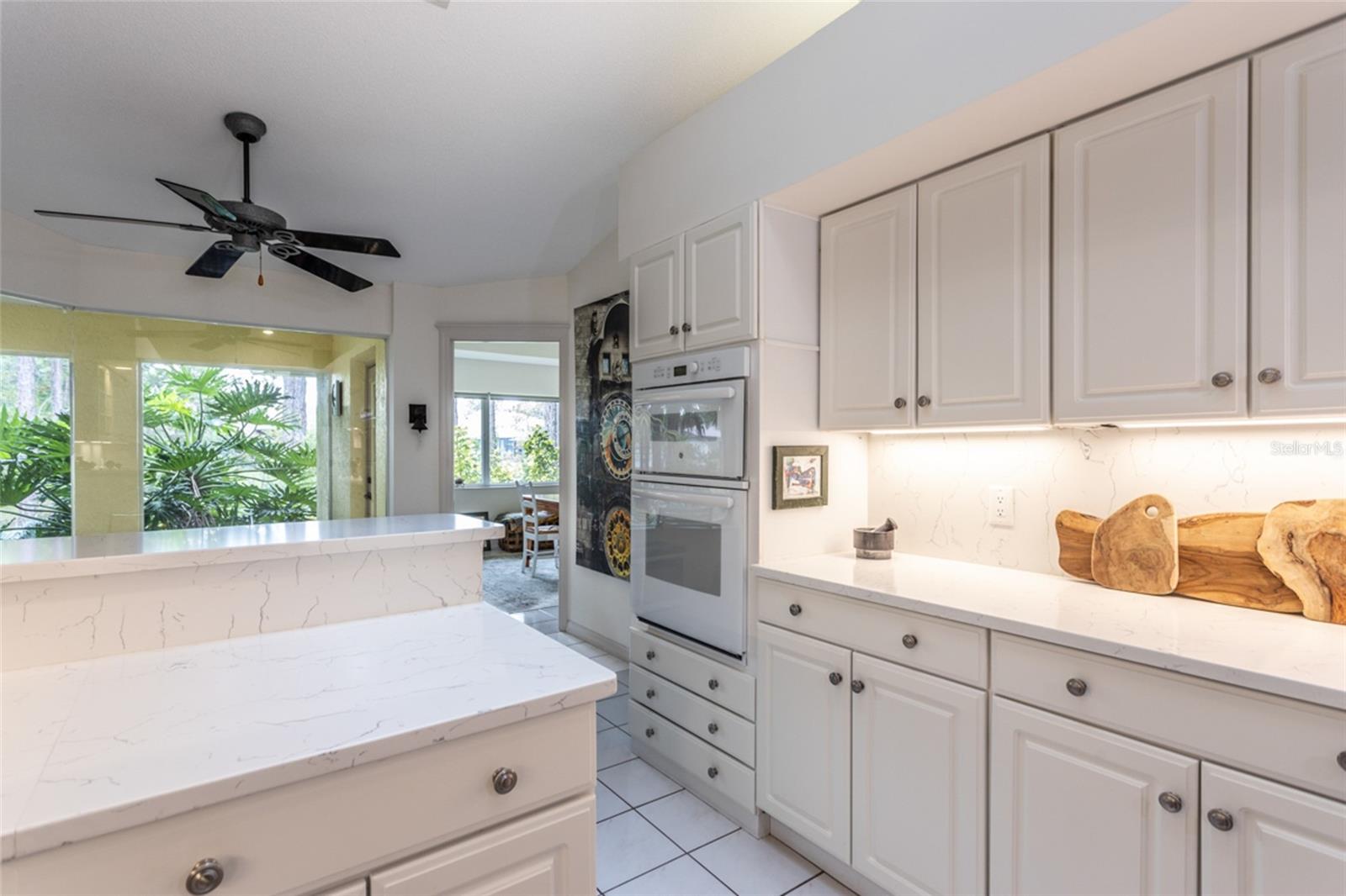 Ceiling Fans(s), Coffered Ceiling(s), Eat-in Kitchen, High Ceilings, L Dining, Primary Bedroom Main Floor, Split Bedroom, Stone Counters, Thermostat, Tray Ceiling(s), Vaulted Ceiling(s), Walk-In Closet(s)