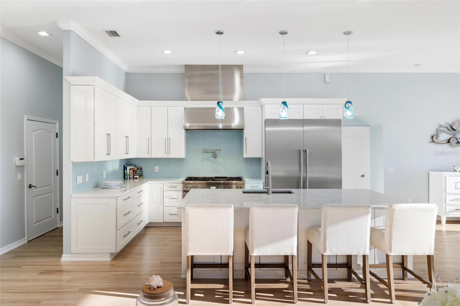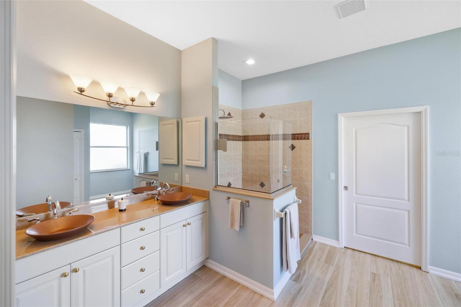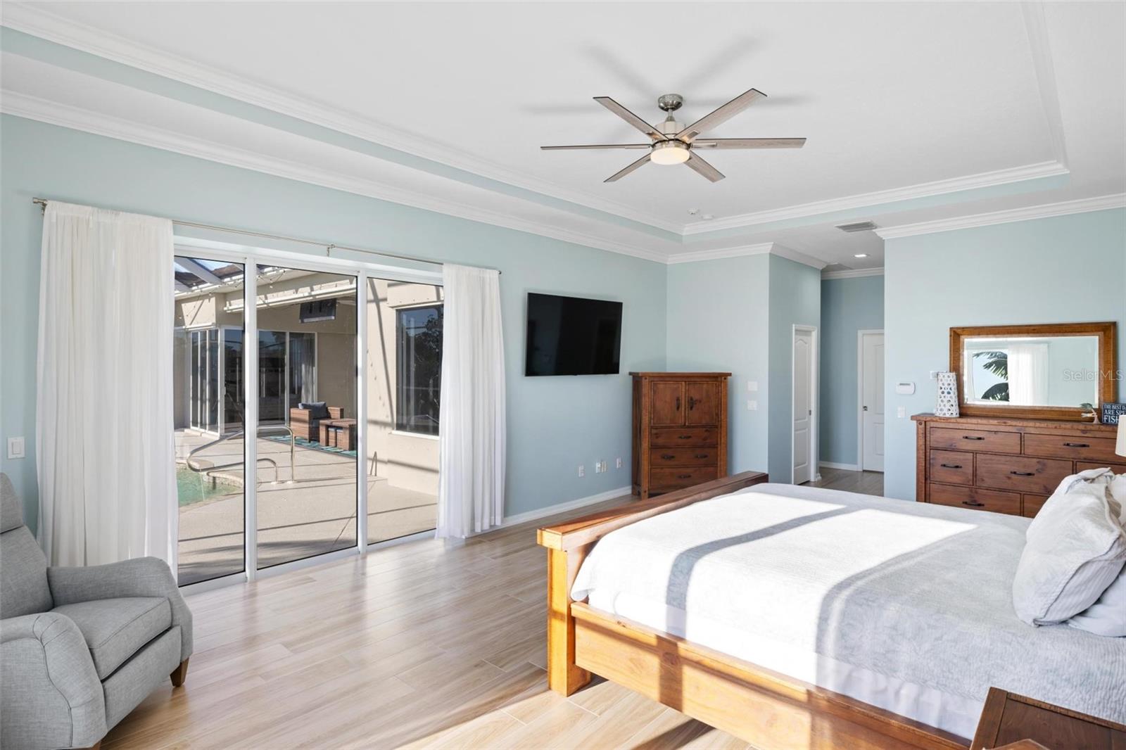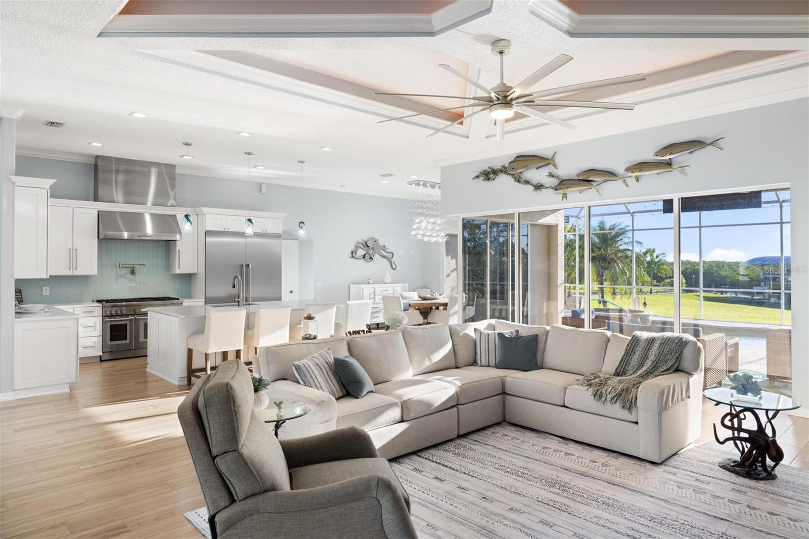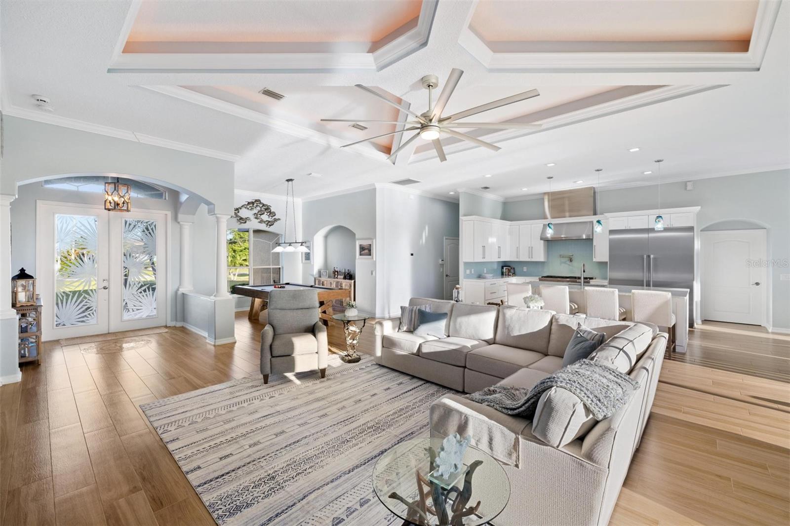 Ceiling Fans(s), Coffered Ceiling(s), Crown Molding, Eat-in Kitchen, High Ceilings, Open Floorplan, Solid Wood Cabinets, Split Bedroom, Stone Counters, Thermostat, Tray Ceiling(s), Walk-In Closet(s)