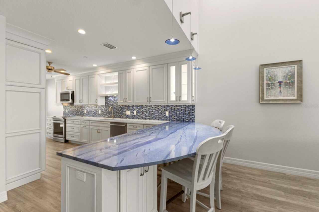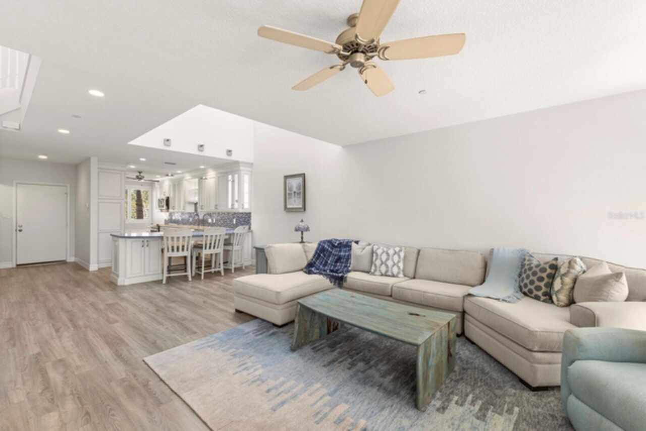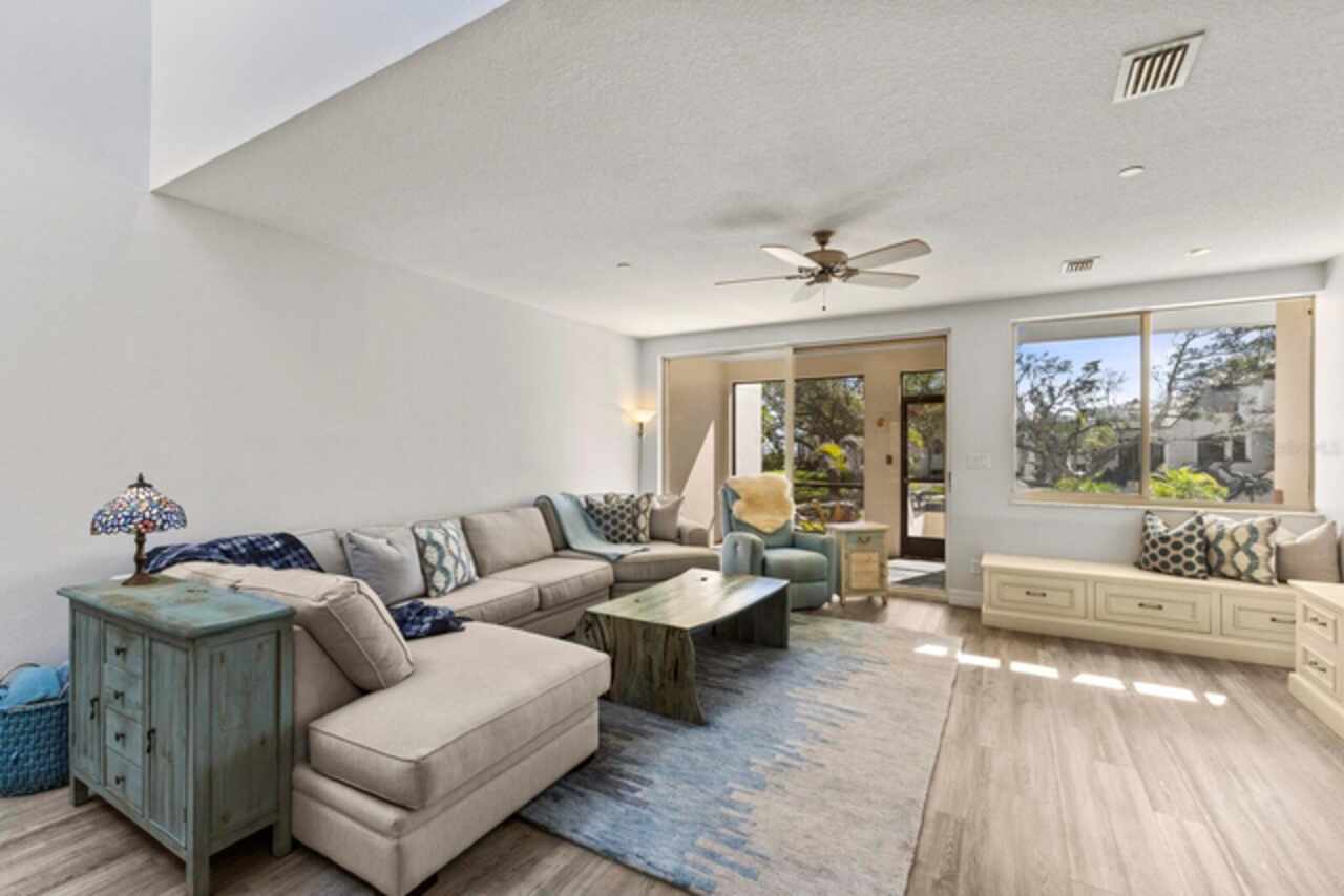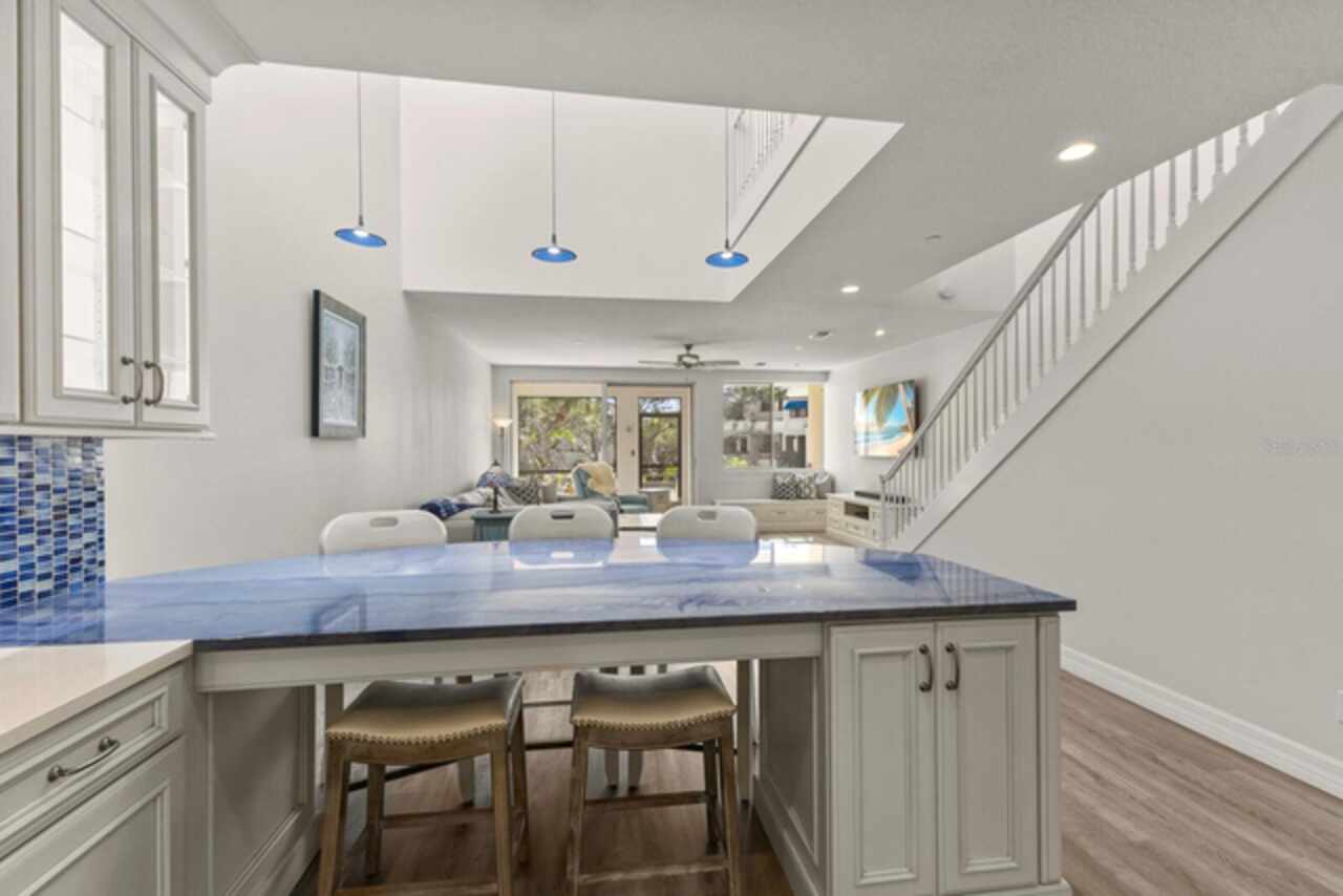 REDUCED PRICE! Are you looking for a RESORT home with spacious rooms, fine finishes, vaulted ceilings and the convenience of a condo community with bay and beach access? Look no further. Luxury and style await in this beautifully updated townhouse, located behind the gates of the exclusive Bay Isles resort. With 1, 590 sq. ft. of meticulously designed and finished indoor living space plus another 1, 100 sq. ft. of screened lanai, storage and garage space, this resort home provides the ultimate in luxe living, comfort and convenience. Upon entering this home, you're greeted by an open concept great room and designer kitchen, vaulted ceilings, a conveniently placed guest bathroom, and views over the very private community pool. You'll never want to leave! The gourmet kitchen is a chef’s dream, featuring gleaming granite countertops including a striking azure blue granite breakfast bar, custom mosaic glass tile backsplash, solid wood cabinetry, and stainless JennAir appliances. Easy to maintain luxury vinyl plank floors flow throughout, adding sophistication and durability. Soaring cathedral ceilings and abundant natural light enhance the light, bright, spacious feel of this home and the private screened lanai offers a serene retreat with access to lushly landscaped grounds and the resort style pool. The oversized primary suite boasts vaulted ceilings, a walk-in closet, and an elegant ensuite bath with natural stone and custom tile shower. The second bedroom also has a vaulted ceiling plus walk-in closet and beautifully finished adjacent bathroom. The ground-level garage has extra depth enabling covered parking for two cars plus there's a separate room that can be flexibly used for storage, a home gym, or a wine cellar. As a Bay Isles resident, you'll enjoy exclusive access to resident-only amenities including a private clubhouse, fitness center, heated pool and spa, tennis courts, and the private Bay Isles Beach Club. This resort home is just minutes from the vibrant dining, shopping, and cultural scene of St. Armands Circle and downtown Sarasota. See this home today and enjoy the best of Longboat Key living.