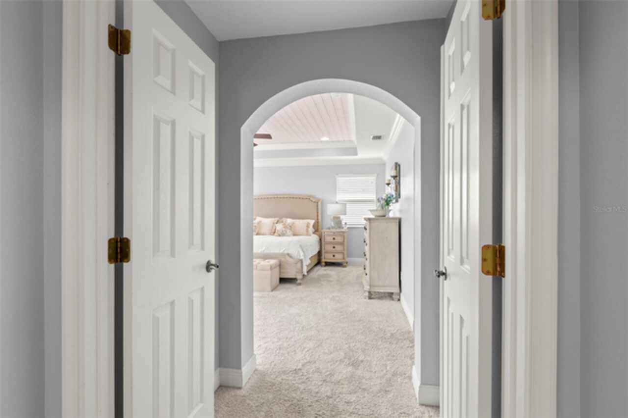 Ceiling Fans(s), Crown Molding, Eat-in Kitchen, Kitchen/Family Room Combo, PrimaryBedroom Upstairs, Solid Surface Counters, Solid Wood Cabinets, Stone Counters, Thermostat, Tray Ceiling(s), Walk-In Closet(s)