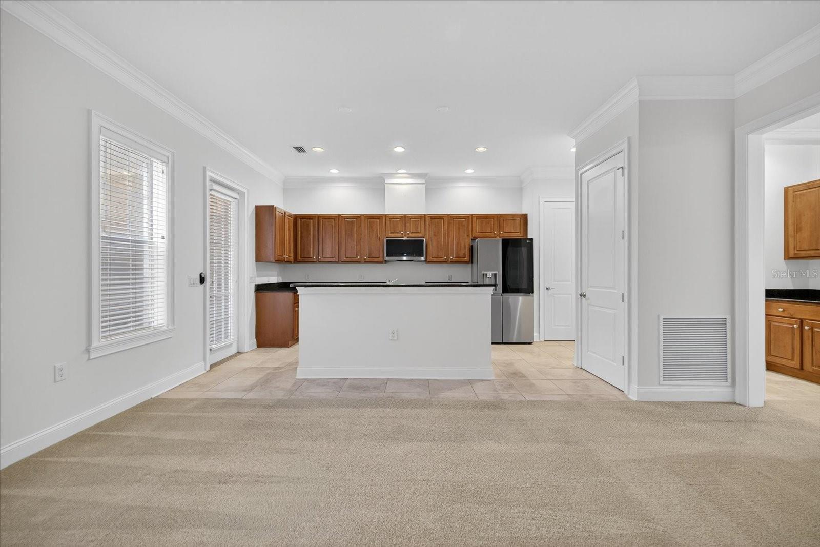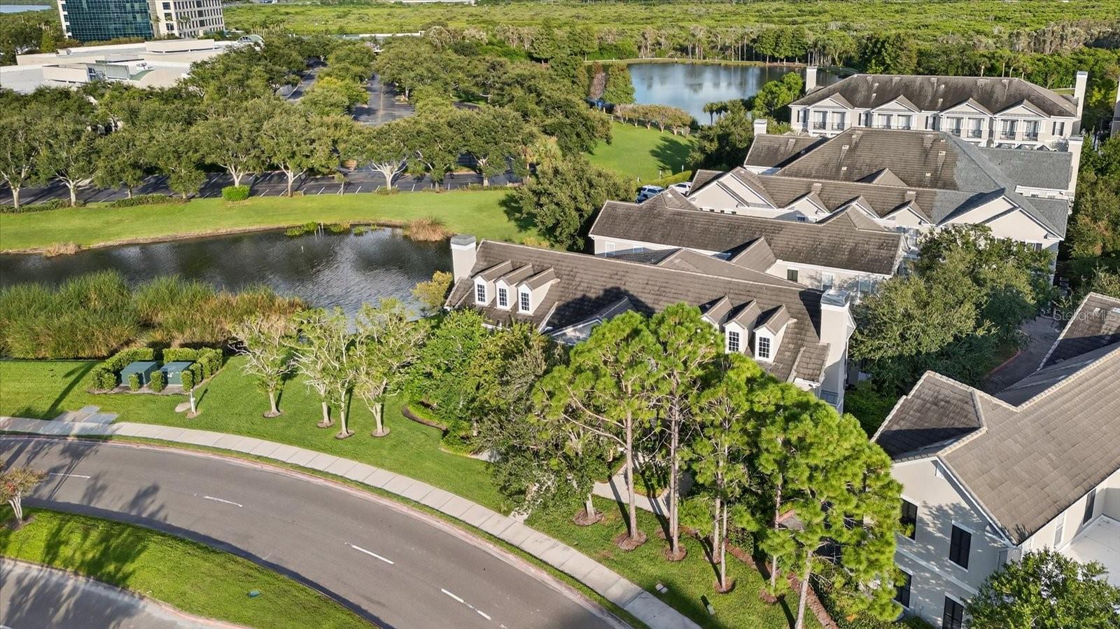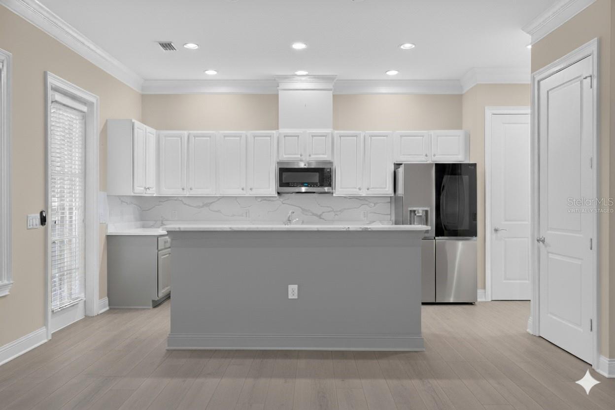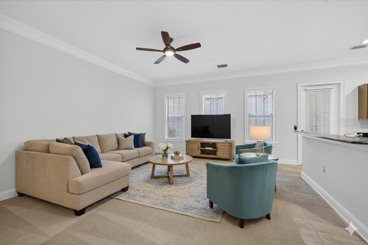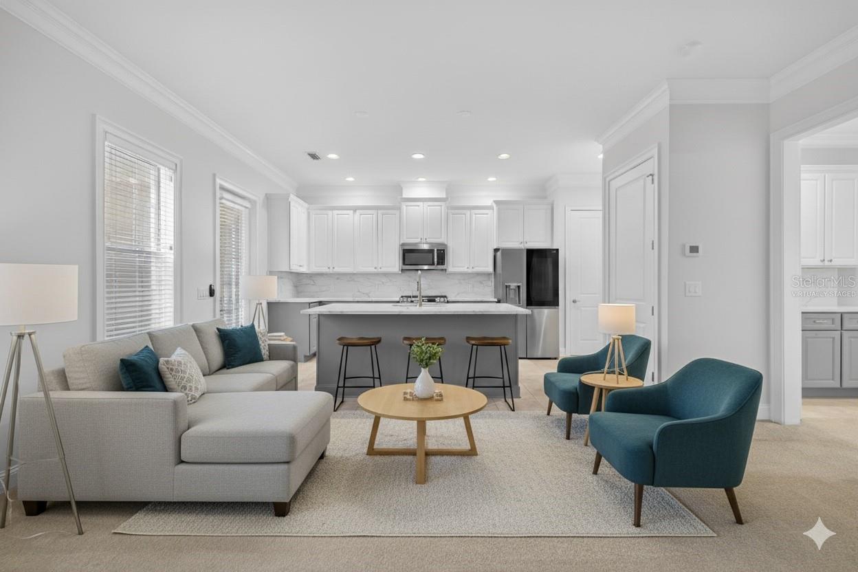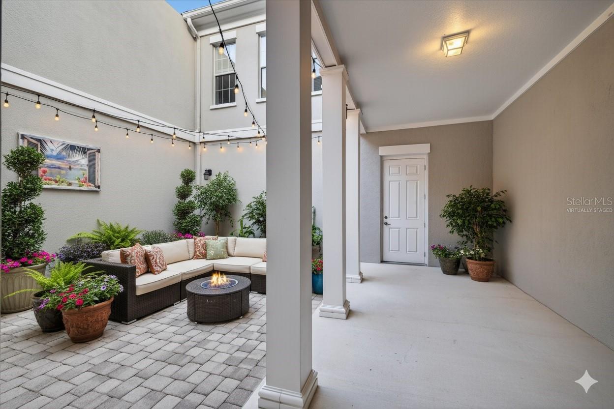 One or more photo(s) has been virtually staged. Nestled in Back Bay at Carillon Park, this oversized 4 Bedroom, 3.5 bath townhome presents a rare opportunity for luxury living. From the moment you approach the extended, welcoming front porch, you sense this home is special. Step inside and be greeted by a grand entryway where a statement staircase ascends before you. The formal living and dining area immediately captivates with its majestic high ceilings, elegant crown molding, and stately pillars. Bathed in natural light from large windows overlooking the parkway, this enticing space is designed for memorable gatherings, flowing seamlessly from living to dining, and serviced by a chic butler’s pantry. The heart of the home is the versatile kitchen connected to the family room with high ceilings and plenty of natural light. The kitchen features newer stainless steel appliances (2022) including a refrigerator with an instant-access door and a touch-activated light panel. Organization is effortless with a spacious pantry and generous cabinet space. The layout opens to the family room, ensuring the cook is always part of the conversation and can enjoy views of the private central courtyard. This is a spacious and comfortable area, wired for built in speakers. Here, you can easily slide open the large windows connected to the courtyard to invite a fresh, natural breeze. The quiet, paved courtyard is the home's hidden gem, a secluded sanctuary for alfresco dining, morning coffee, or grilling under the stars, all while infusing the surrounding rooms with abundant natural light. Upstairs, the private quarters are spacious and inviting. The primary suite boasts high ceilings and French doors that open to a romantic breezeway. This unique architectural feature connects to the in-law suite and overlooks the tranquil courtyard below. The en-suite bathroom is a spa-like haven with an extra-large layout, a separate soaking tub and shower, and includes a massive walk-in closet. Two additional generous bedrooms, complete with built-in closets and access to a charming shared upstairs balcony, provide perfect accommodations for family or a dedicated office space. A large laundry closet completes the upstairs space. The property’s most unique feature is the updated in-law suite. With its own private ground-level access, en-suite full bathroom (newly built in 2024), kitchenette area, and dedicated split AC unit, this space offers limitless possibilities. Whether a private haven for guests, a sprawling game room, a secluded home office, or a creative studio, its high ceilings and dual-aspect windows create a bright and inspiring atmosphere. The convenience extends to a two-car garage with high ceilings for ample storage. And as part of a premier HOA community, residents enjoy exclusive access to a swimming pool, clubhouse, and a fully-equipped gym. Located just off Ulmerton Road, this home offers walkable ease to local establishments. Stroll to local bars and restaurants, the local Publix, the upscale Echelon City Center, the newly opened Top Golf Saint Pete, or enjoy the serene walking paths around Carillon Lake. With only one stoplight between your driveway and Tampa International Airport, travel is a breeze. Enjoy a short drive to the vibrant waterfront of Downtown St. Petersburg or a small commute to Downtown Tampa. Your central location in Pinellas County means the Gulf beaches and premier shopping are just a short drive away.