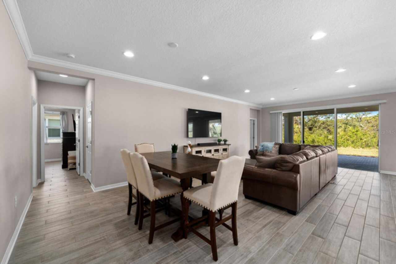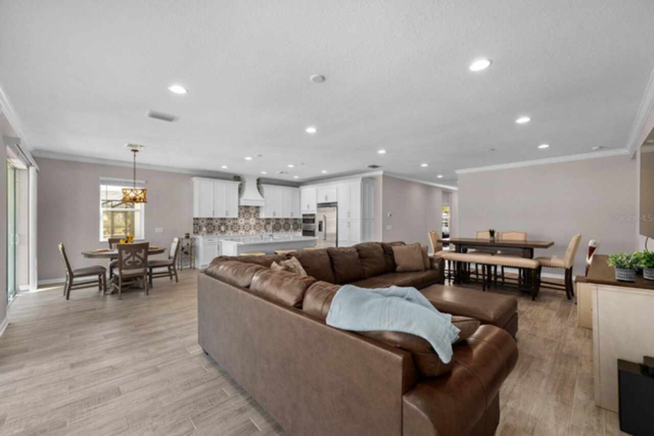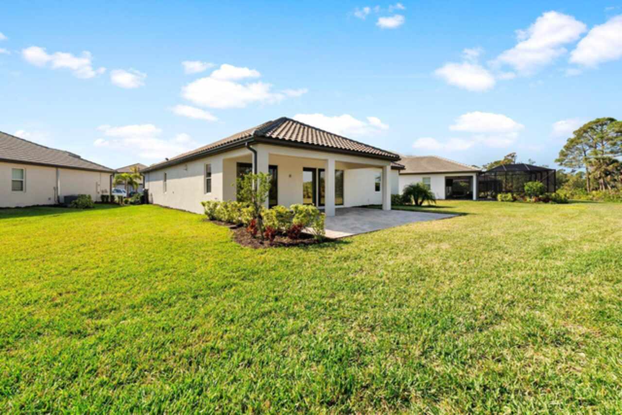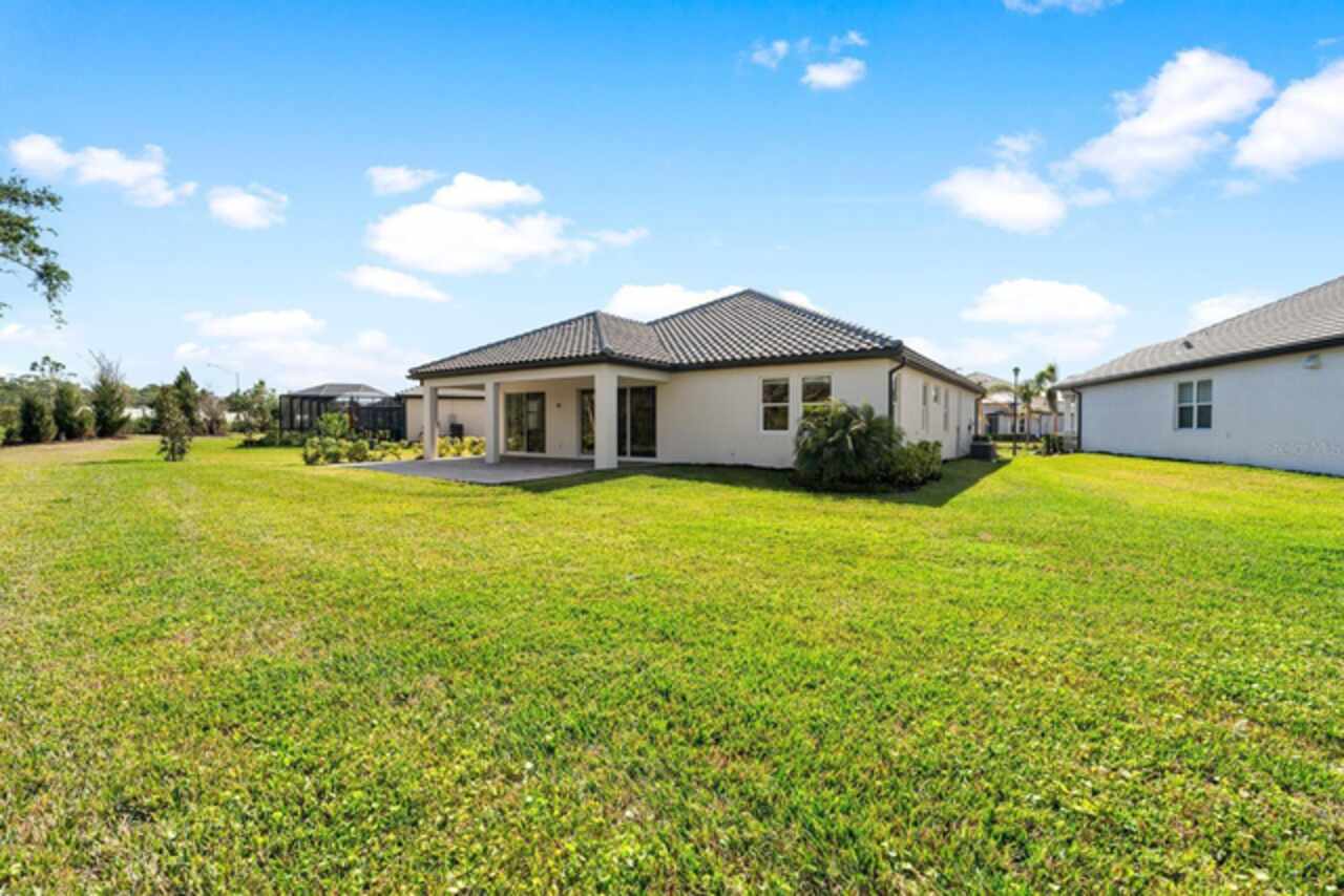 This immaculate 2022 built Crystal Model, Elevation B, by M I Homes is a stunning showcase of Tuscan and Mediterranean architecture, complete with a classic tile roof and exceptional attention to detail. Designed for both beauty and function, the home features a thoughtful, high quality layout and luxury upgrades throughout. Located in Flood Zone X, considered a no flood zone, and having never sustained storm damage, it offers peace of mind. Set off the neighborhood road and tucked behind an island of mature palm trees, this premium lot offers a rare sense of privacy and seclusion. With no rear neighbors, it is quietly nestled within the gorgeous Wellen Park neighborhood of Oasis, off the beaten path yet close to it all. The residence includes four generously sized bedrooms, three full bathrooms, and a spacious three car garage complemented by an oversized three lane driveway. Throughout the interior, upgraded tile flooring extends seamlessly from room to room with no carpeting or thresholds, enhancing the clean, modern aesthetic. The gourmet kitchen is a chef’s dream, featuring elegant white cabinetry, quartz countertops, and a sprawling 7.5 foot island. Custom features include built in pantry space, dedicated pots and pans drawers, and a hidden trash cabinet. A stylish white wood range hood adds a sophisticated focal point. Additional upgrades include a whole home water softener and reverse osmosis system for added comfort and quality. Crown molding and recessed lighting elevate the open concept kitchen and great room, creating a light, airy atmosphere perfect for everyday living or entertaining. Expansive sliding glass doors line the back wall, opening to an extended lanai and a beautifully paved 29 by 22 patio, ideal for outdoor gatherings or future pool installation. The 11, 522 square foot lot offers ample space and privacy, surrounded by lush palms. Located in the finished, gated, and maintenance free community of Oasis, comprised of approximately 140 single family homes, residents enjoy access to premium amenities including a resort style pool, clubhouse, and pickleball court. Oasis also features a private walking trail connecting to the adjacent gated neighborhood and directly to Blue Heron Dog Park, a 33 acre green space with two miles of trails and two separate off leash dog parks. Wellen Park is a vibrant, master planned community offering a lifestyle centered around connection, wellness, and recreation. Residents can enjoy shopping, dining, and entertainment at the Wellen Park Town Center or take in a game at CoolToday Park, the spring training home of the Atlanta Braves. The community also hosts a weekly farmers market, outdoor concerts, and miles of walking and biking trails winding through beautifully landscaped parks and green spaces. Oasis is ideally located within Wellen Park, just 10 miles from the Gulf Coast’s beautiful beaches and conveniently situated near Costco, Publix, Chase Bank, medical offices, and the State College of Florida’s Venice campus. This home also includes appliance manuals and surplus materials such as floor tile, backsplash tile, trim, roof tiles, and paint, along with smart garage and doorbell systems and a built in Taexx pest control system for added convenience.