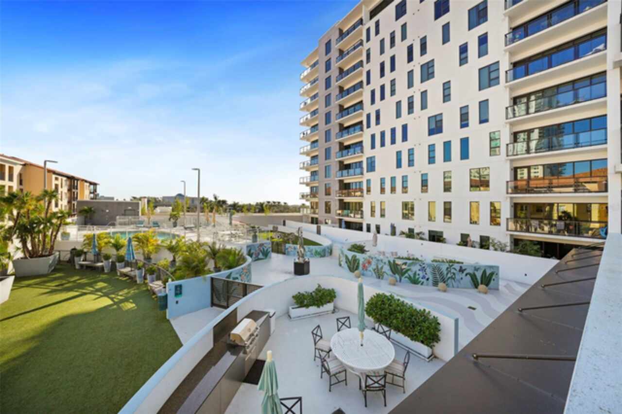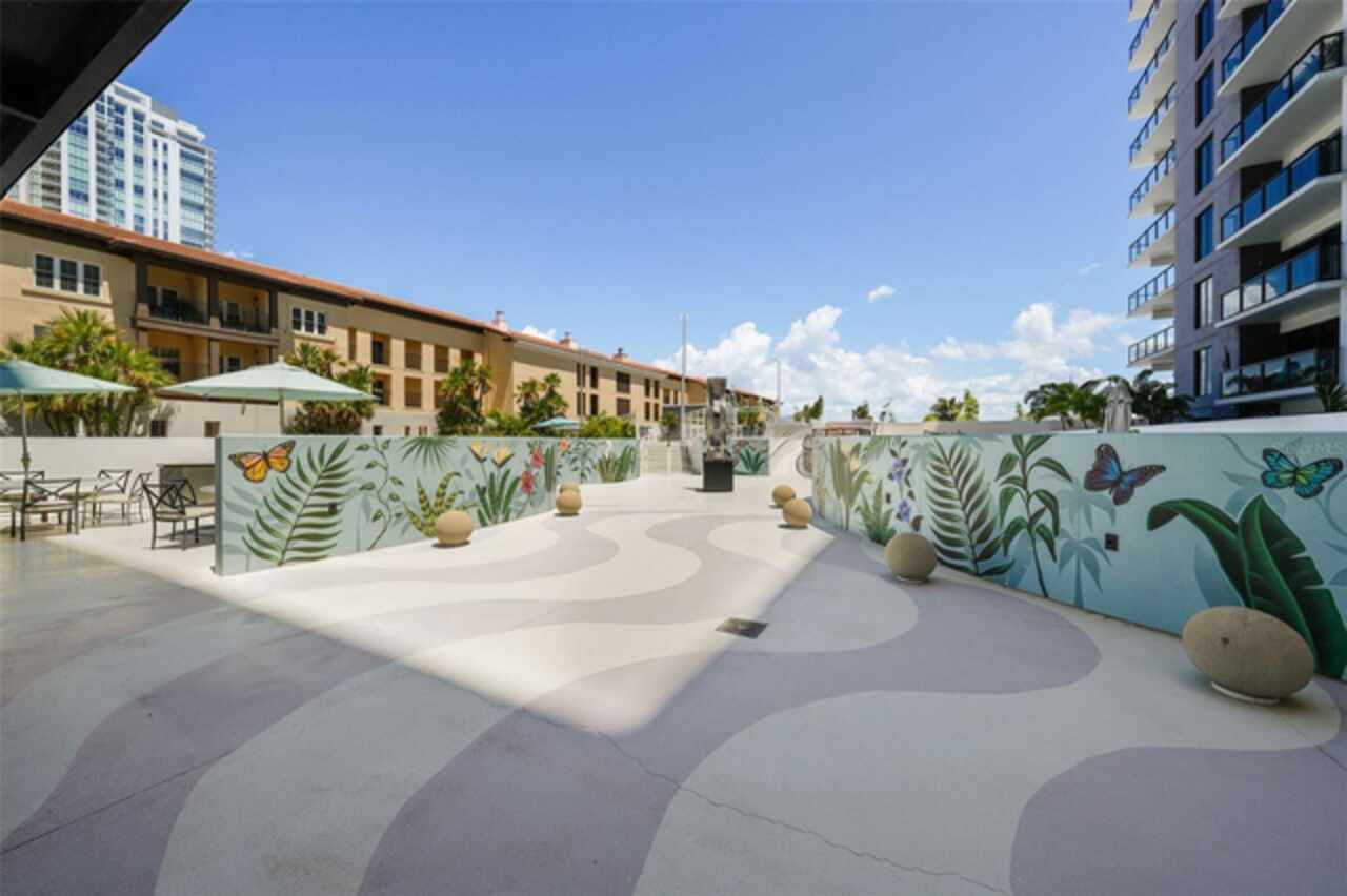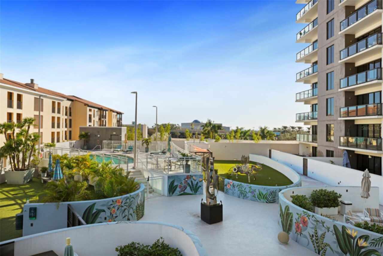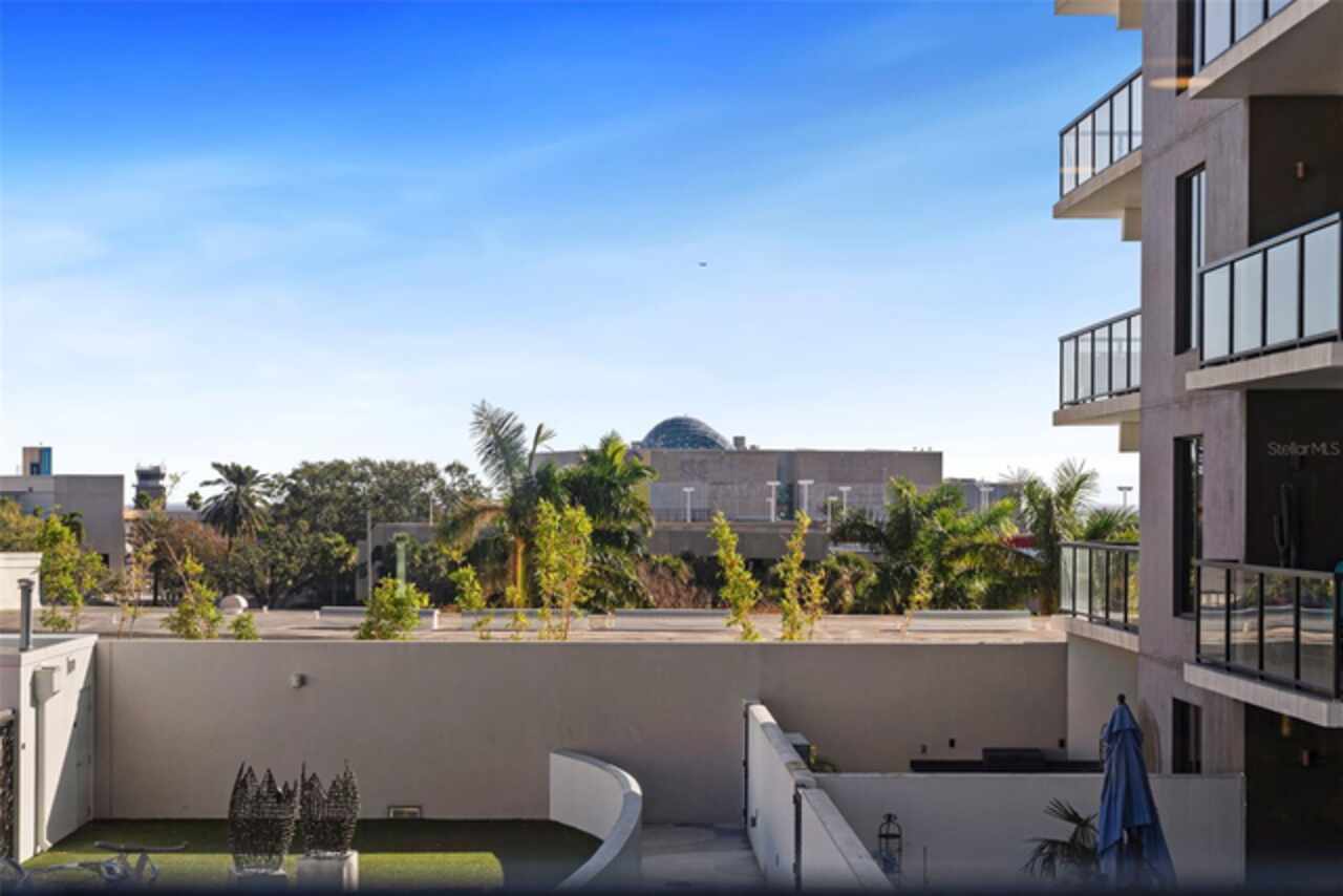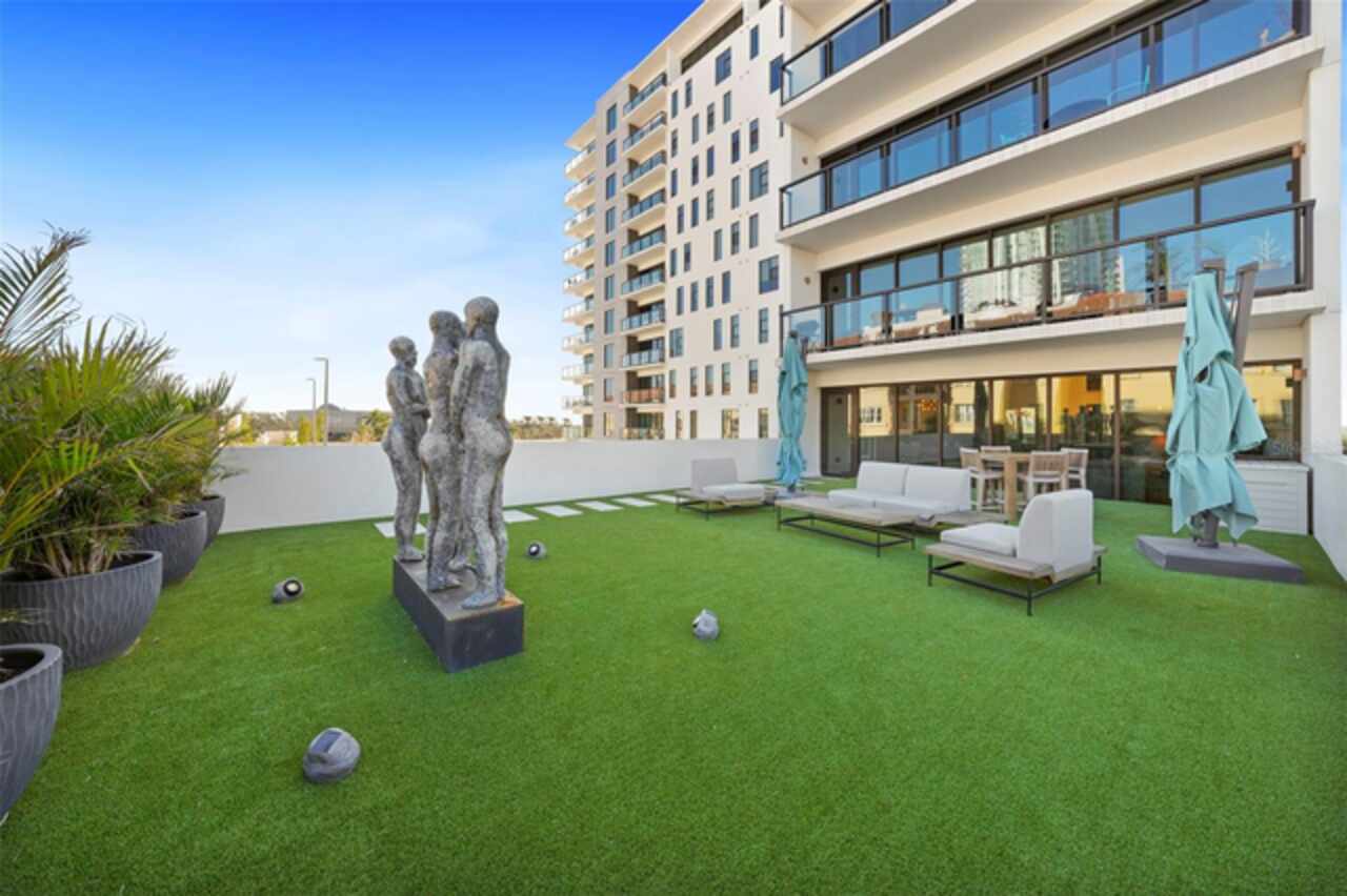 *** One of a Kind Condo *** This home offers a very special opportunity, the ease of metropolitan condo living with the feel of a gorgeous backyard. Truly one of a kind at the Salvador and perhaps in all of St Pete, this home offers a 1000+ SF terrace covered in artificial turf that's made with heat-reflective technology, providing a cool, maintenance free area for dining and relaxing outdoors. The terrace overlooks the 3rd floor amenities deck, downtown, the Dali museum, and Tampa Bay. An open floor plan with the Kitchen, Dining, and Living rooms all overlooking the terrace through floor to ceiling windows provide a most elegant space to entertain, in and out of doors. This condo sets out from the rest of the building and therefore has no adjacent units next to it, providing the ultimate in privacy. Engineered hardwood floors flow throughout the 1555sf of this home. A large, open, contemporary kitchen with Quartz countertops, Bosch appliances, Gas Range, and Wine Cooler has abundant natural light. The living room features a built-in entertainment center with an additional beverage cooler and motorized blinds. The primary bedroom with an oversized walk-in closet, is en-suite with a deep soak tub, dual sinks, and large shower. The guest bath has a tub/shower with shower door and both bedrooms have tall windows with blackout shades.The home has two parking spaces and a climate controlled storage unit. The Salvador, a LEEDS certified green 74 unit building has great amenities in a pool, spa, state-of-the-art fitness center, social room, grilling station, gated dog park with dog washing station, sculpture garden and outdoor fire pit area. Concierge and on-site management are convenient features for the owners. All located within easy access to all that downtown living offers and yet, located in a quiet part of town when you’re ready to wind down. Call for your private tour of this exquisite and unique home.