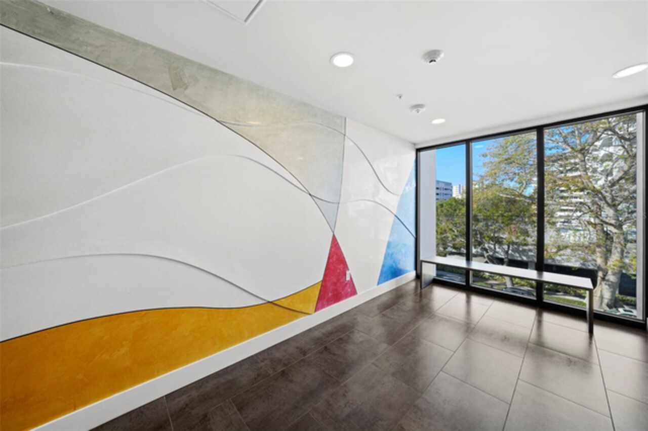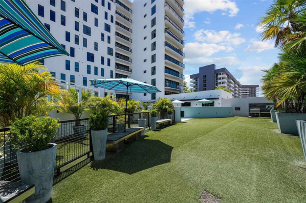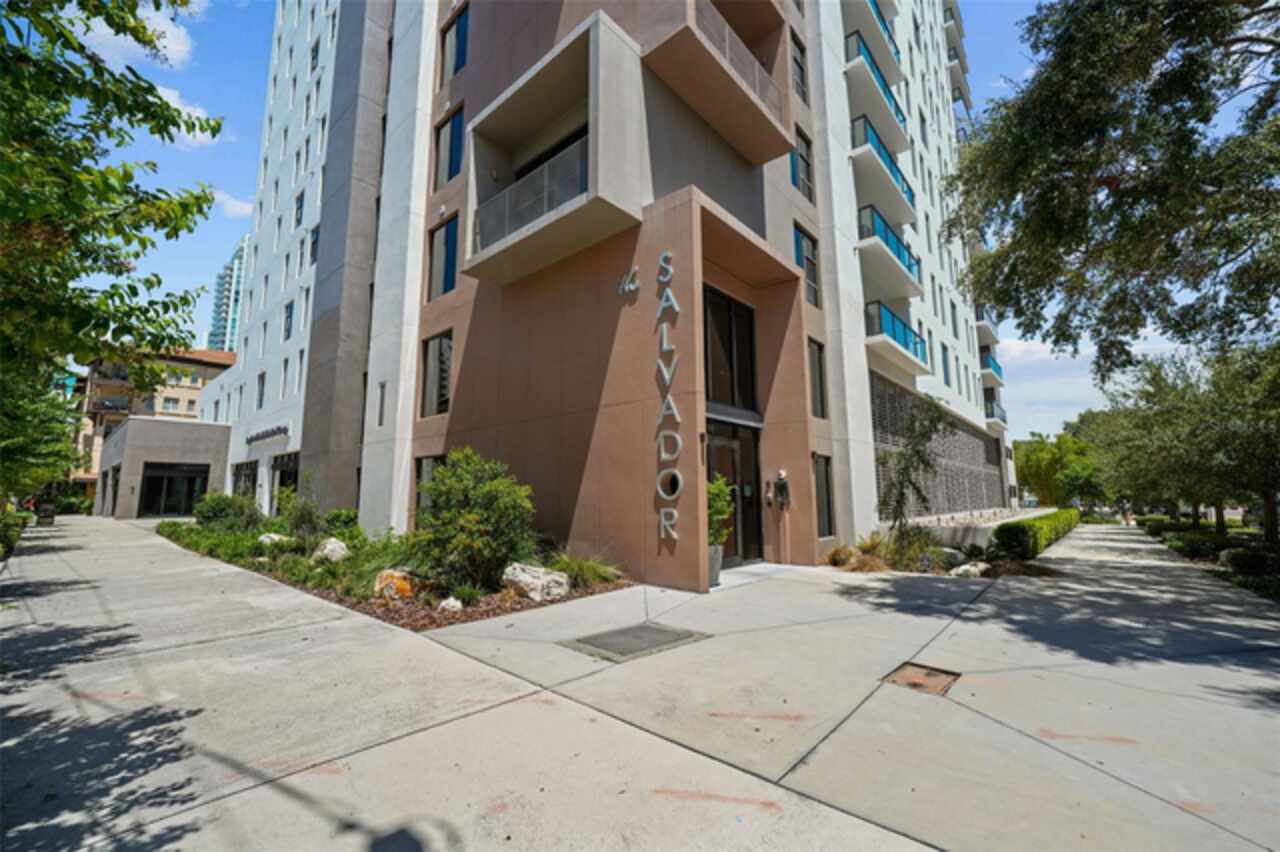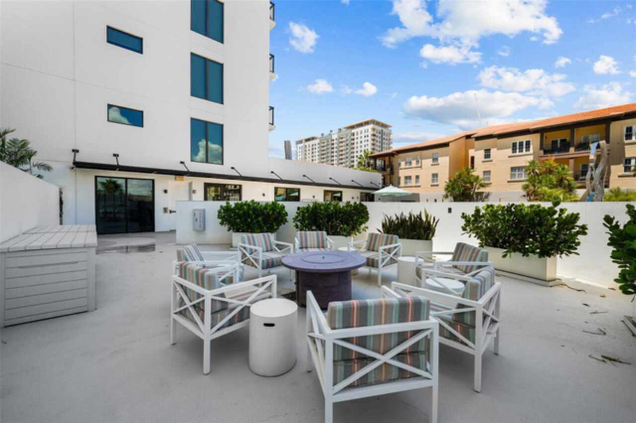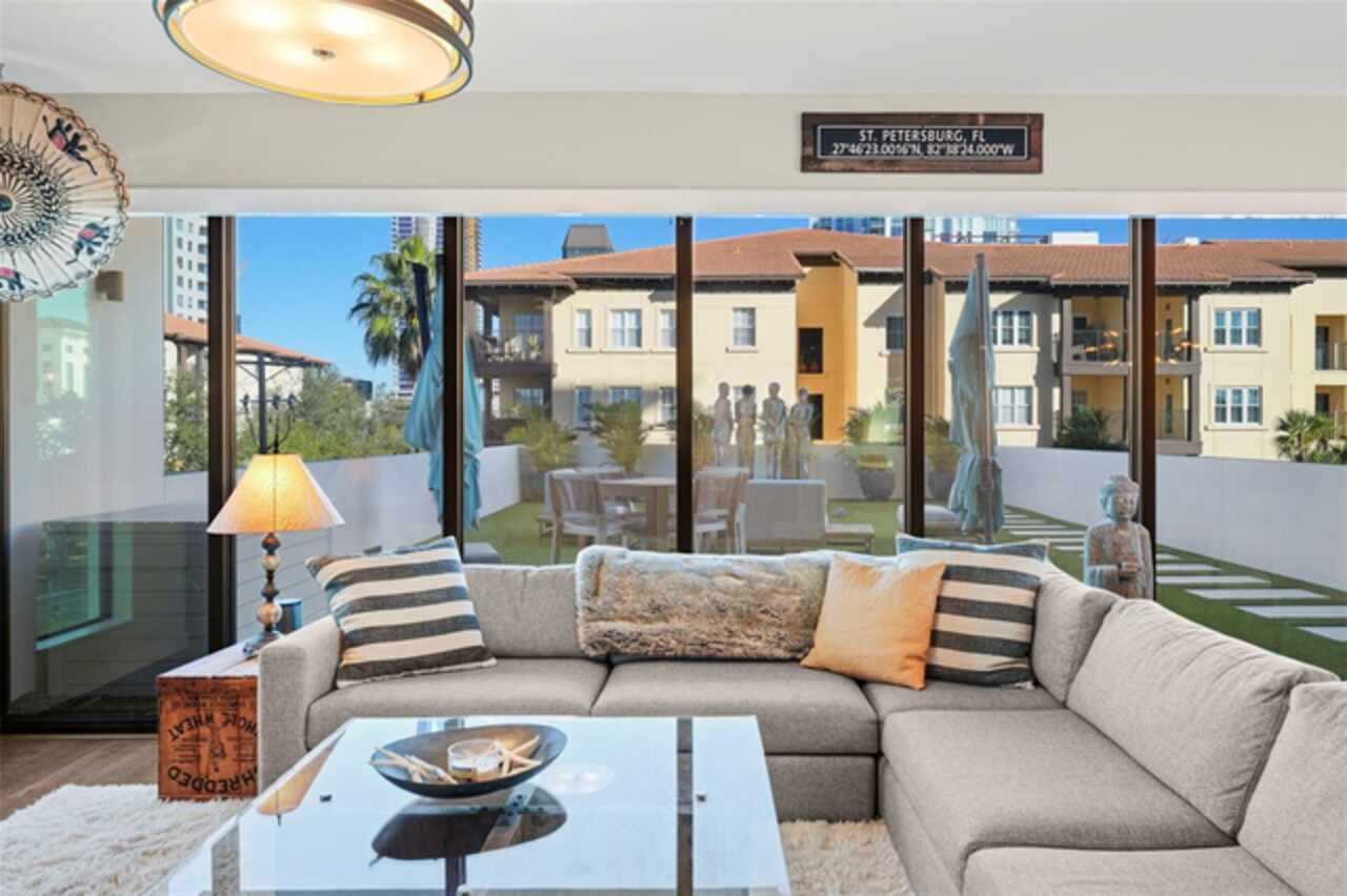 *** One of a Kind Condo *** This home offers a very special opportunity, the ease of metropolitan condo living with the feel of a gorgeous backyard. Truly one of a kind at the Salvador and perhaps in all of St Pete, this home offers a 1000+ SF terrace covered in artificial turf that's made with heat-reflective technology, providing a cool, maintenance free area for dining and relaxing outdoors. The terrace overlooks the 3rd floor amenities deck, downtown, the Dali museum, and Tampa Bay. An open floor plan with the Kitchen, Dining, and Living rooms all overlooking the terrace through floor to ceiling windows provide a most elegant space to entertain, in and out of doors. This condo sets out from the rest of the building and therefore has no adjacent units next to it, providing the ultimate in privacy. Engineered hardwood floors flow throughout the 1555sf of this home. A large, open, contemporary kitchen with Quartz countertops, Bosch appliances, Gas Range, and Wine Cooler has abundant natural light. The living room features a built-in entertainment center with an additional beverage cooler and motorized blinds. The primary bedroom with an oversized walk-in closet, is en-suite with a deep soak tub, dual sinks, and large shower. The guest bath has a tub/shower with shower door and both bedrooms have tall windows with blackout shades.The home has two parking spaces and a climate controlled storage unit. The Salvador, a LEEDS certified green 74 unit building has great amenities in a pool, spa, state-of-the-art fitness center, social room, grilling station, gated dog park with dog washing station, sculpture garden and outdoor fire pit area. Concierge and on-site management are convenient features for the owners. All located within easy access to all that downtown living offers and yet, located in a quiet part of town when you’re ready to wind down. Call for your private tour of this exquisite and unique home.