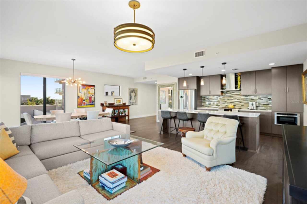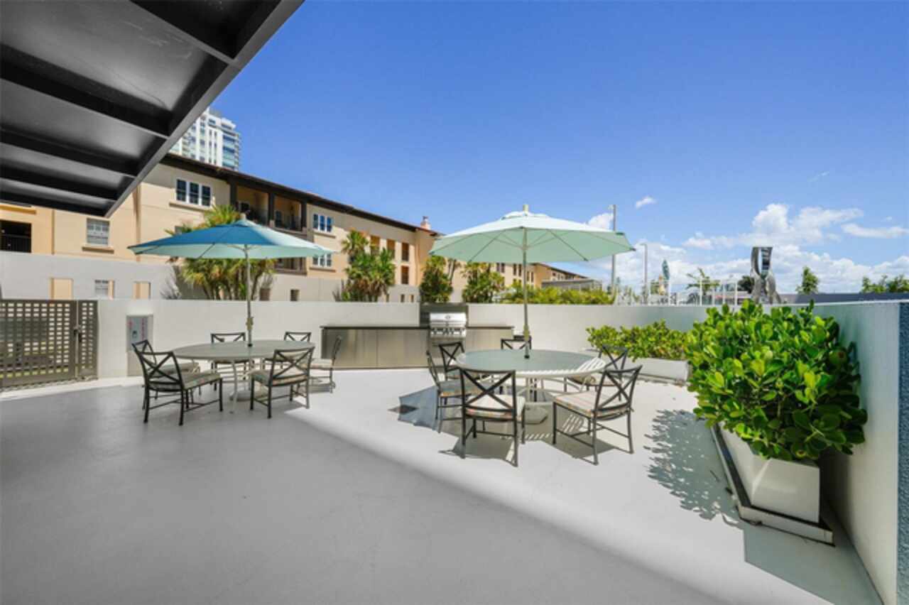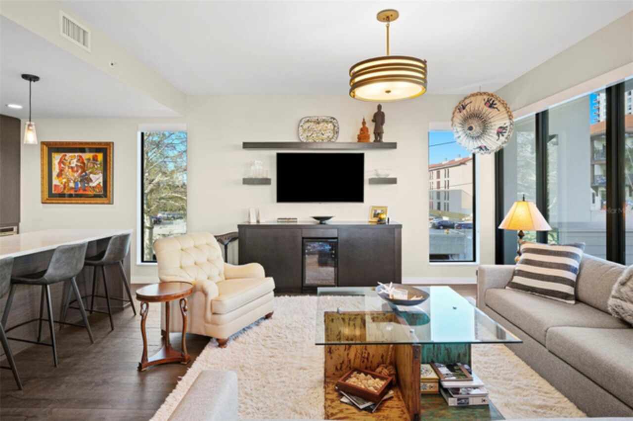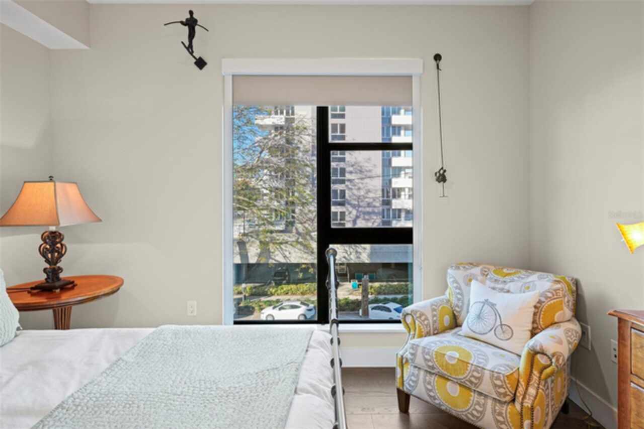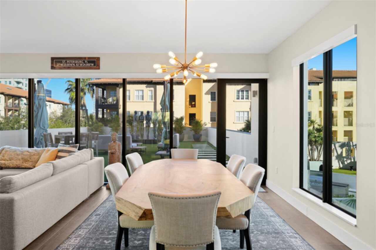 *** One of a Kind Condo *** This home offers a very special opportunity, the ease of metropolitan condo living with the feel of a gorgeous backyard. Truly one of a kind at the Salvador and perhaps in all of St Pete, this home offers a 1000+ SF terrace covered in artificial turf that's made with heat-reflective technology, providing a cool, maintenance free area for dining and relaxing outdoors. The terrace overlooks the 3rd floor amenities deck, downtown, the Dali museum, and Tampa Bay. An open floor plan with the Kitchen, Dining, and Living rooms all overlooking the terrace through floor to ceiling windows provide a most elegant space to entertain, in and out of doors. This condo sets out from the rest of the building and therefore has no adjacent units next to it, providing the ultimate in privacy. Engineered hardwood floors flow throughout the 1555sf of this home. A large, open, contemporary kitchen with Quartz countertops, Bosch appliances, Gas Range, and Wine Cooler has abundant natural light. The living room features a built-in entertainment center with an additional beverage cooler and motorized blinds. The primary bedroom with an oversized walk-in closet, is en-suite with a deep soak tub, dual sinks, and large shower. The guest bath has a tub/shower with shower door and both bedrooms have tall windows with blackout shades.The home has two parking spaces and a climate controlled storage unit. The Salvador, a LEEDS certified green 74 unit building has great amenities in a pool, spa, state-of-the-art fitness center, social room, grilling station, gated dog park with dog washing station, sculpture garden and outdoor fire pit area. Concierge and on-site management are convenient features for the owners. All located within easy access to all that downtown living offers and yet, located in a quiet part of town when you’re ready to wind down. Call for your private tour of this exquisite and unique home.