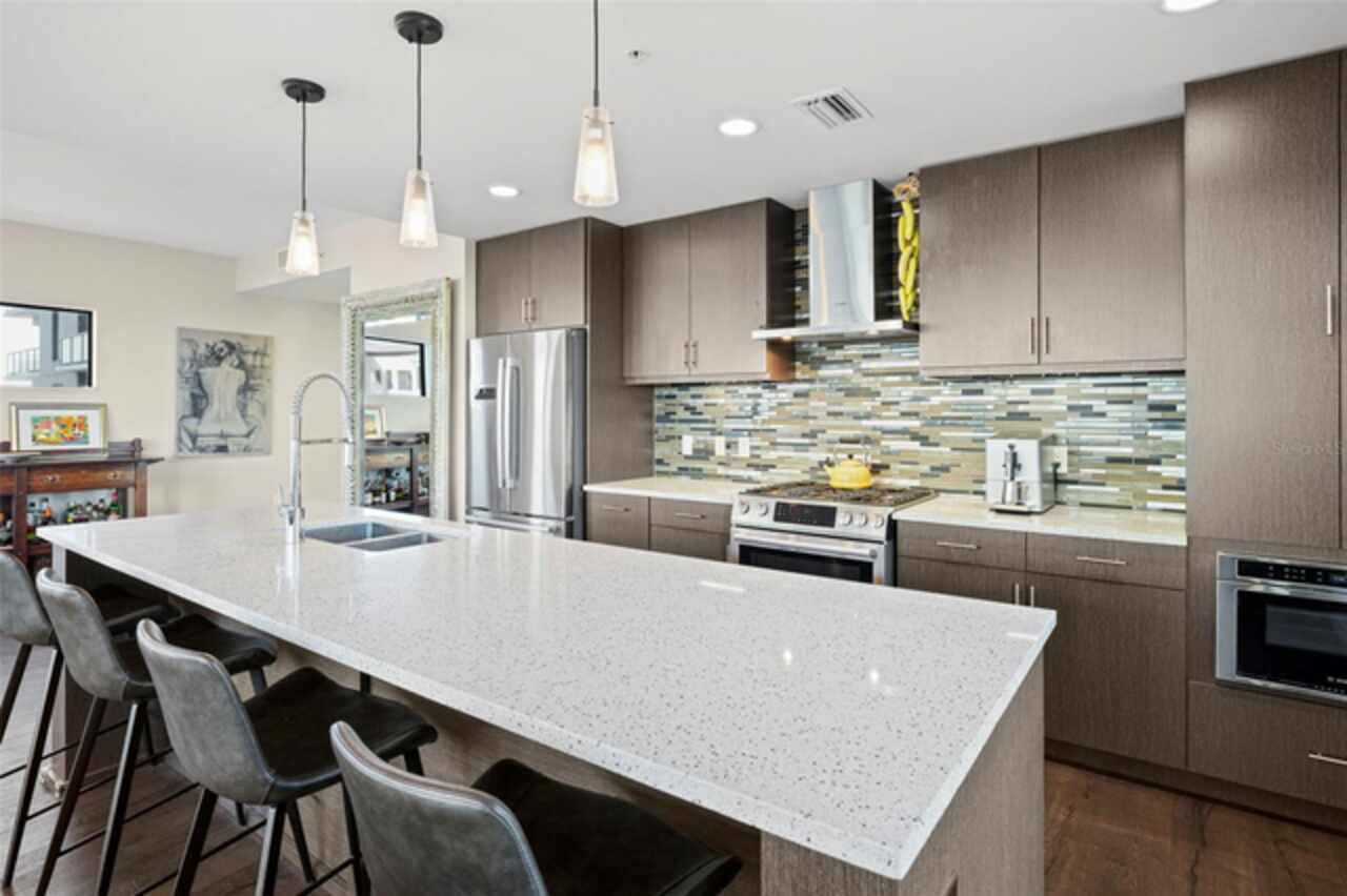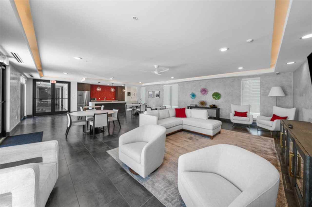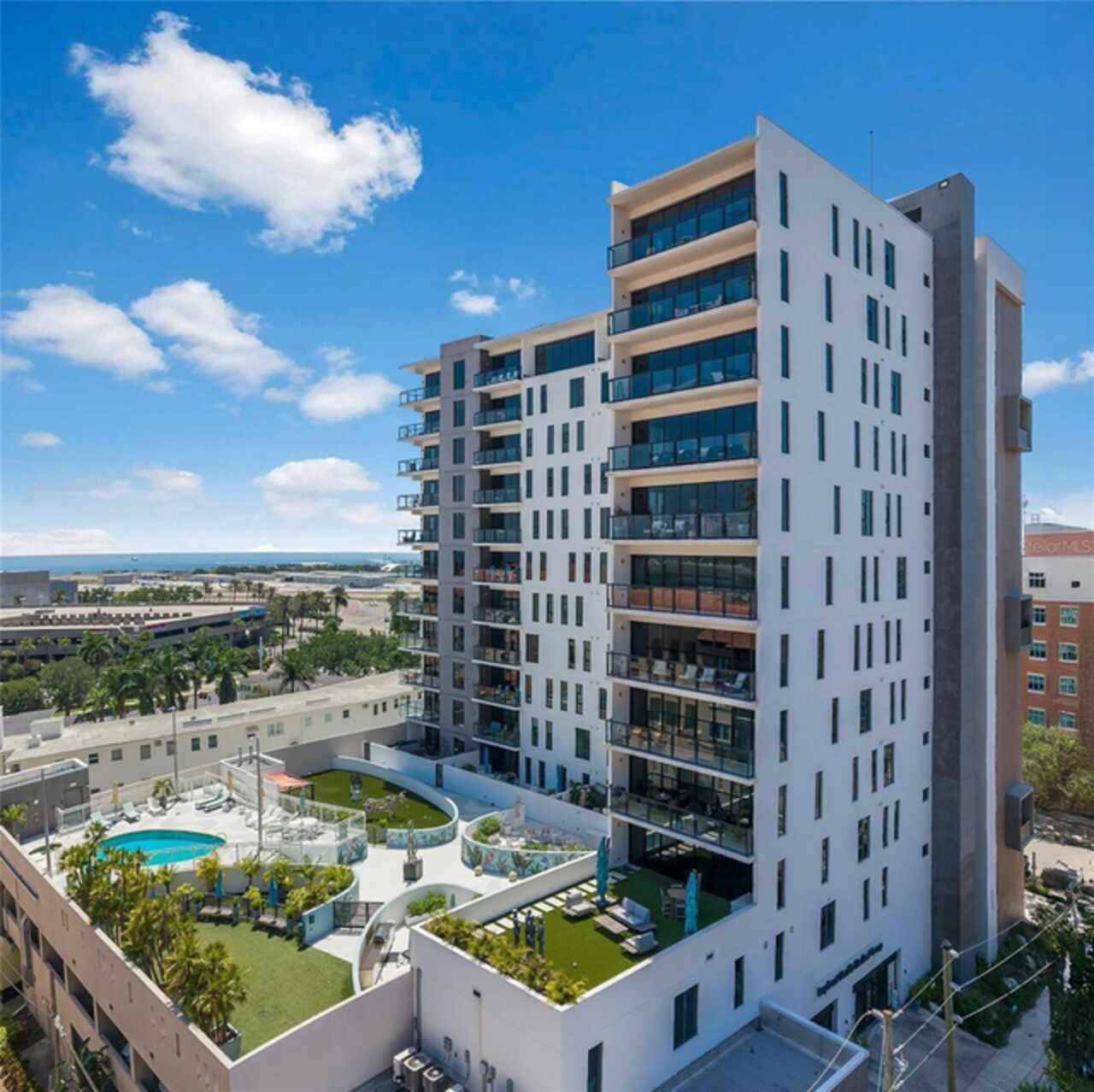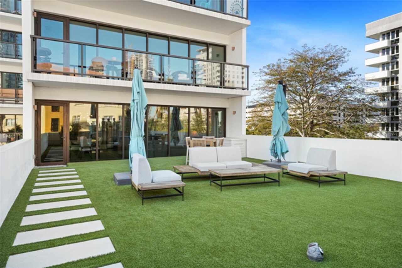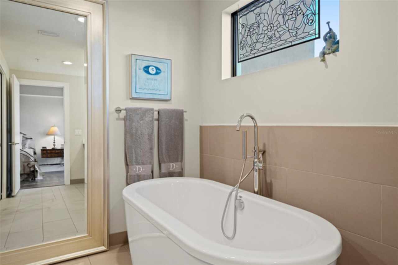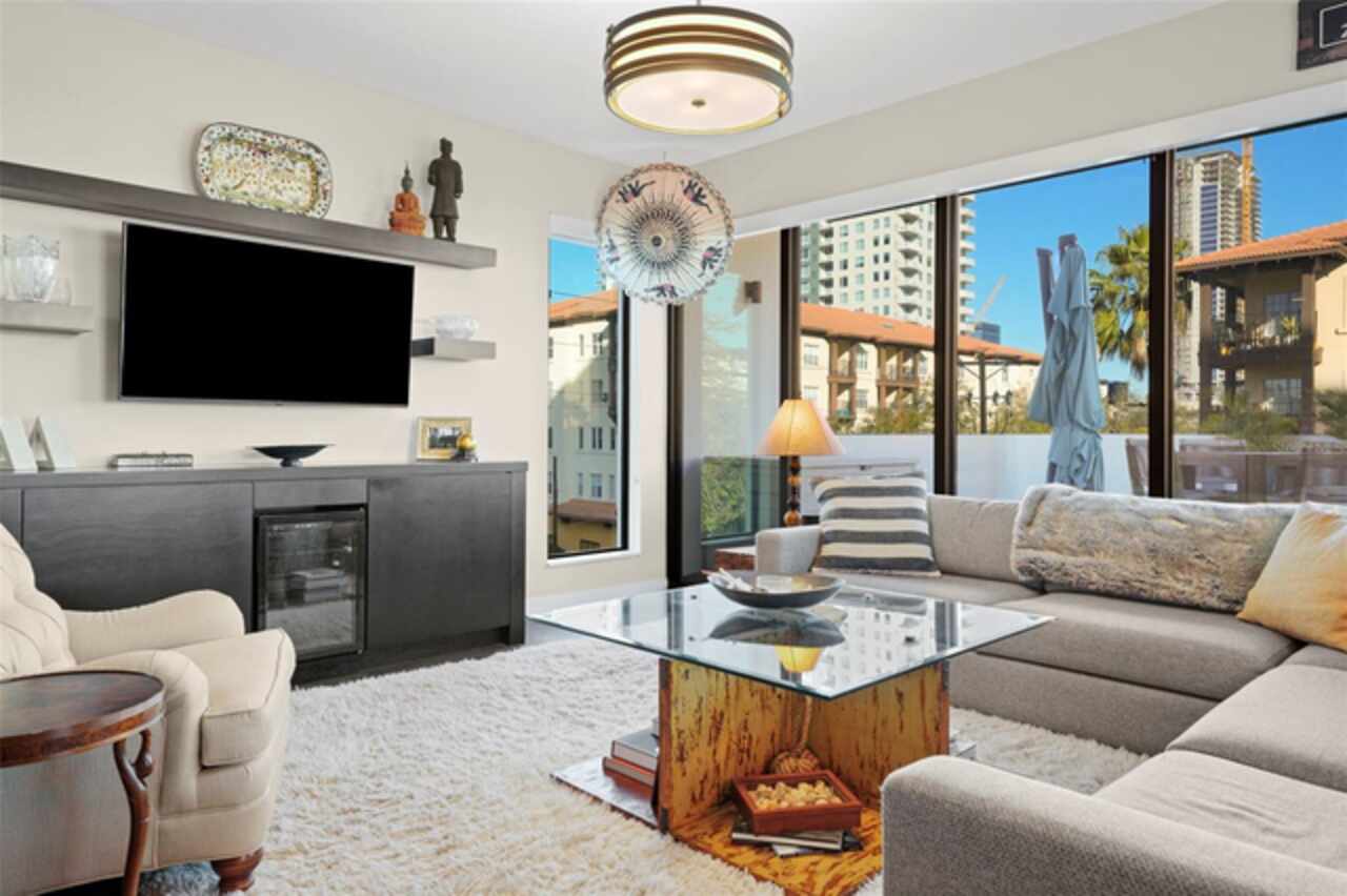 *** One of a Kind Condo *** This home offers a very special opportunity, the ease of metropolitan condo living with the feel of a gorgeous backyard. Truly one of a kind at the Salvador and perhaps in all of St Pete, this home offers a 1000+ SF terrace covered in artificial turf that's made with heat-reflective technology, providing a cool, maintenance free area for dining and relaxing outdoors. The terrace overlooks the 3rd floor amenities deck, downtown, the Dali museum, and Tampa Bay. An open floor plan with the Kitchen, Dining, and Living rooms all overlooking the terrace through floor to ceiling windows provide a most elegant space to entertain, in and out of doors. This condo sets out from the rest of the building and therefore has no adjacent units next to it, providing the ultimate in privacy. Engineered hardwood floors flow throughout the 1555sf of this home. A large, open, contemporary kitchen with Quartz countertops, Bosch appliances, Gas Range, and Wine Cooler has abundant natural light. The living room features a built-in entertainment center with an additional beverage cooler and motorized blinds. The primary bedroom with an oversized walk-in closet, is en-suite with a deep soak tub, dual sinks, and large shower. The guest bath has a tub/shower with shower door and both bedrooms have tall windows with blackout shades.The home has two parking spaces and a climate controlled storage unit. The Salvador, a LEEDS certified green 74 unit building has great amenities in a pool, spa, state-of-the-art fitness center, social room, grilling station, gated dog park with dog washing station, sculpture garden and outdoor fire pit area. Concierge and on-site management are convenient features for the owners. All located within easy access to all that downtown living offers and yet, located in a quiet part of town when you’re ready to wind down. Call for your private tour of this exquisite and unique home.