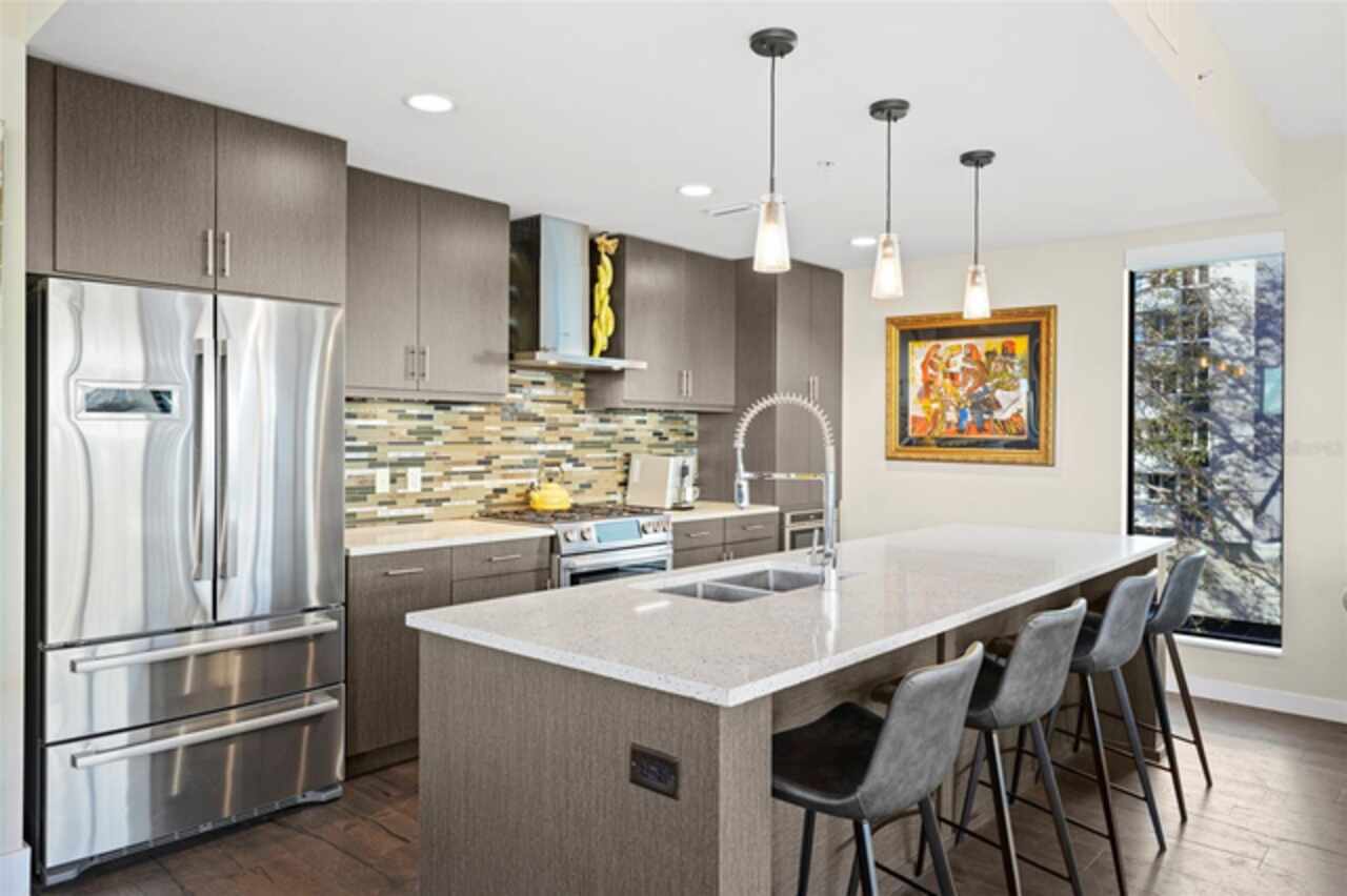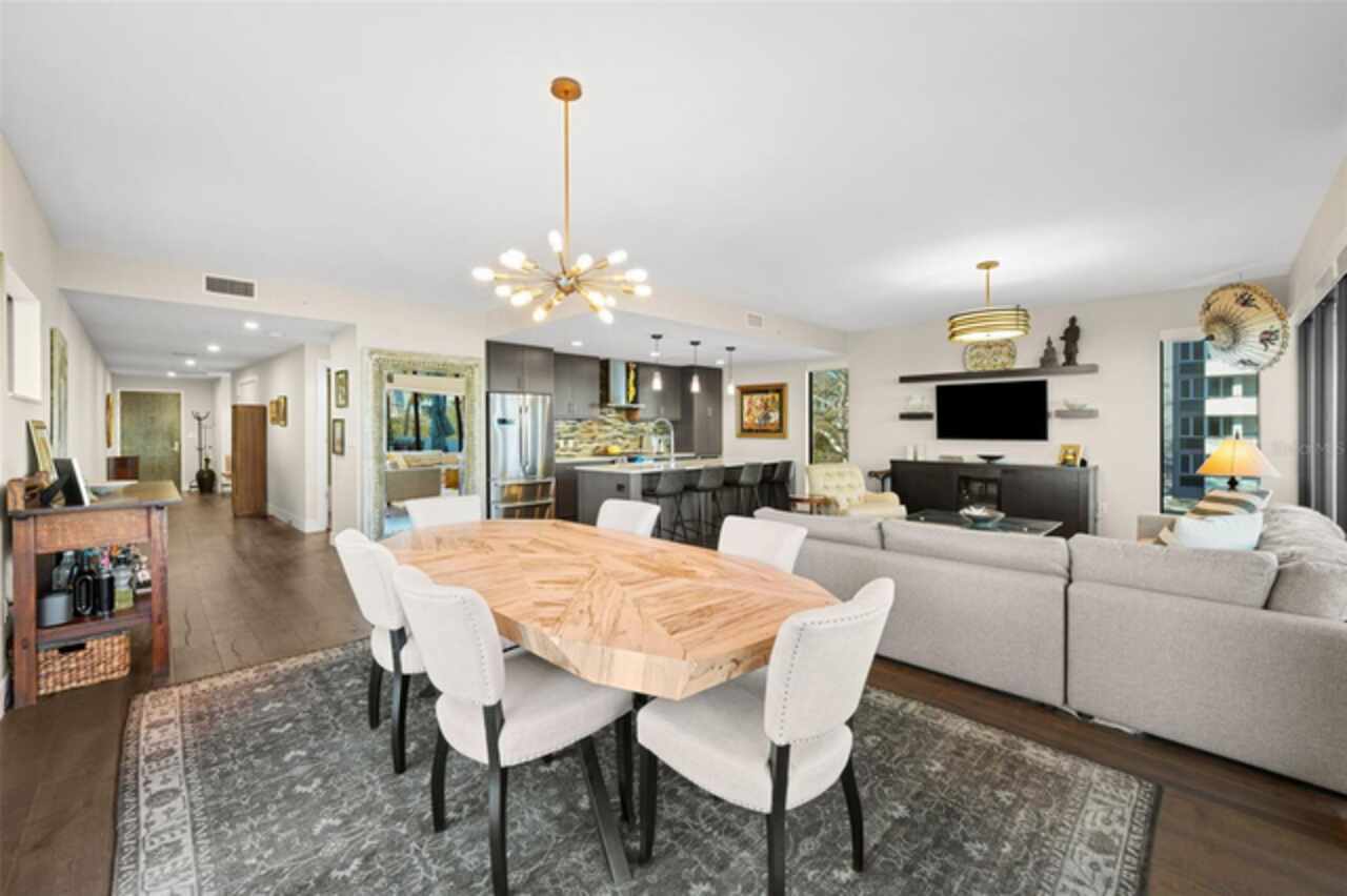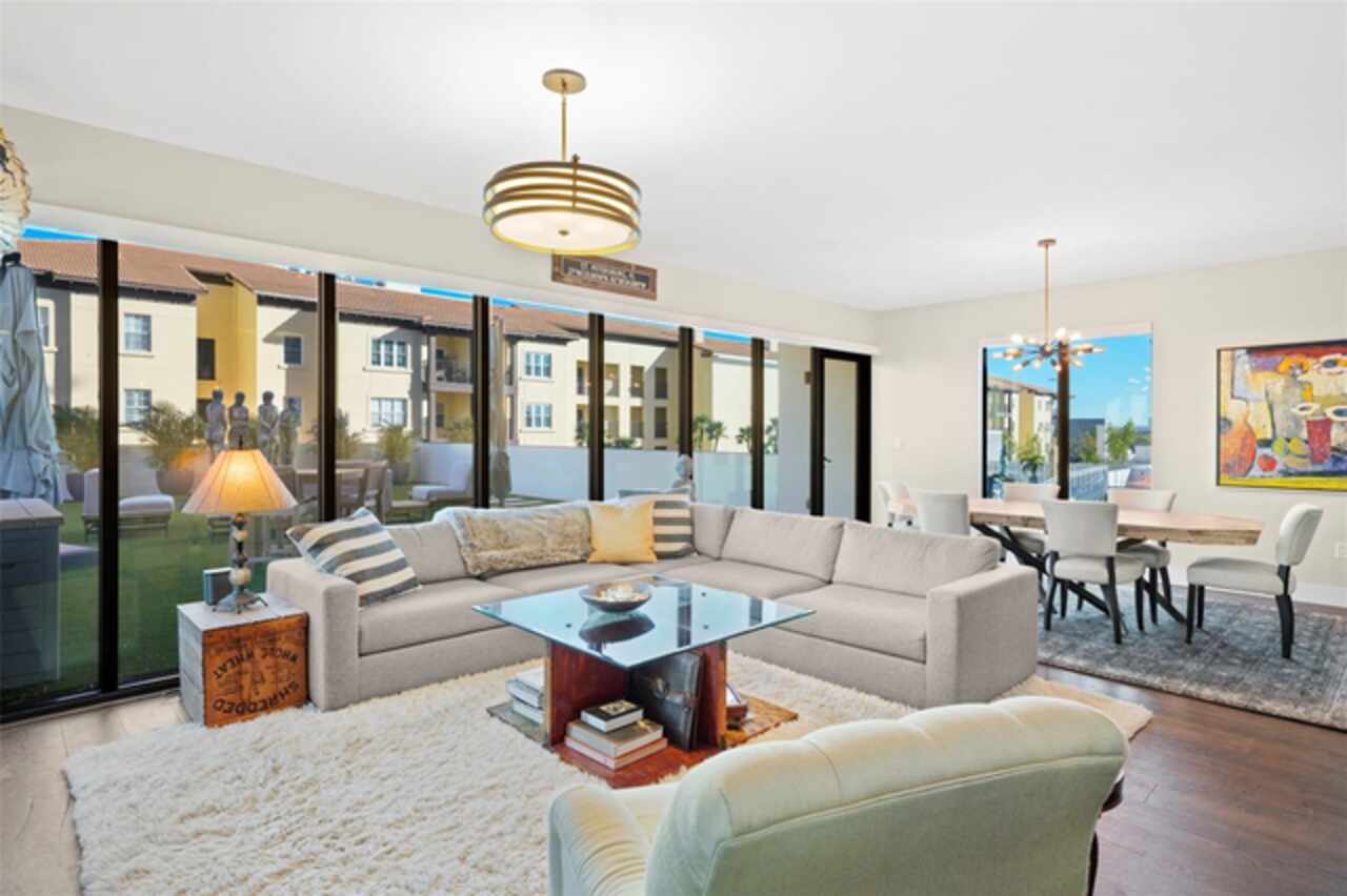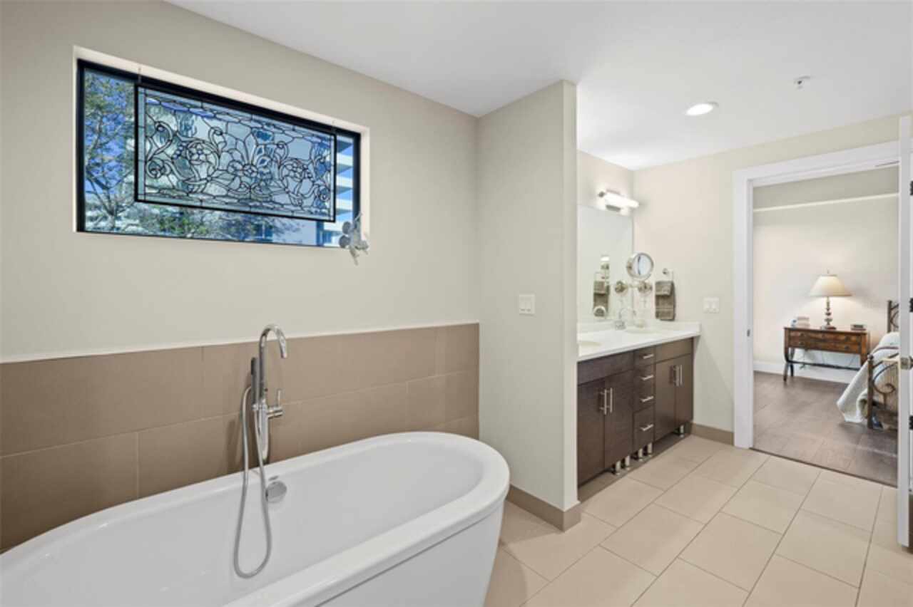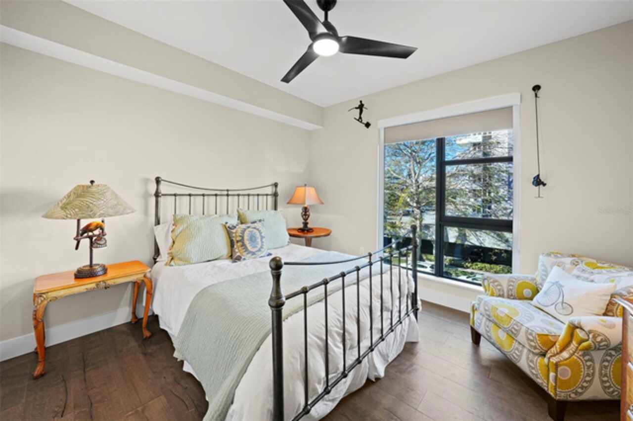 *** One of a Kind Condo *** This home offers a very special opportunity, the ease of metropolitan condo living with the feel of a gorgeous backyard. Truly one of a kind at the Salvador and perhaps in all of St Pete, this home offers a 1000+ SF terrace covered in artificial turf that's made with heat-reflective technology, providing a cool, maintenance free area for dining and relaxing outdoors. The terrace overlooks the 3rd floor amenities deck, downtown, the Dali museum, and Tampa Bay. An open floor plan with the Kitchen, Dining, and Living rooms all overlooking the terrace through floor to ceiling windows provide a most elegant space to entertain, in and out of doors. This condo sets out from the rest of the building and therefore has no adjacent units next to it, providing the ultimate in privacy. Engineered hardwood floors flow throughout the 1555sf of this home. A large, open, contemporary kitchen with Quartz countertops, Bosch appliances, Gas Range, and Wine Cooler has abundant natural light. The living room features a built-in entertainment center with an additional beverage cooler and motorized blinds. The primary bedroom with an oversized walk-in closet, is en-suite with a deep soak tub, dual sinks, and large shower. The guest bath has a tub/shower with shower door and both bedrooms have tall windows with blackout shades.The home has two parking spaces and a climate controlled storage unit. The Salvador, a LEEDS certified green 74 unit building has great amenities in a pool, spa, state-of-the-art fitness center, social room, grilling station, gated dog park with dog washing station, sculpture garden and outdoor fire pit area. Concierge and on-site management are convenient features for the owners. All located within easy access to all that downtown living offers and yet, located in a quiet part of town when you’re ready to wind down. Call for your private tour of this exquisite and unique home.