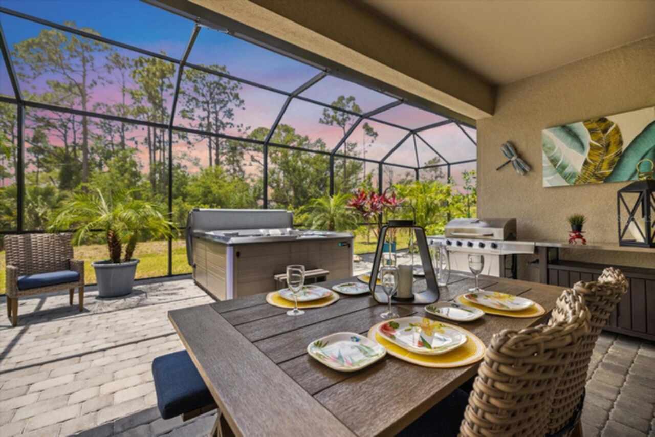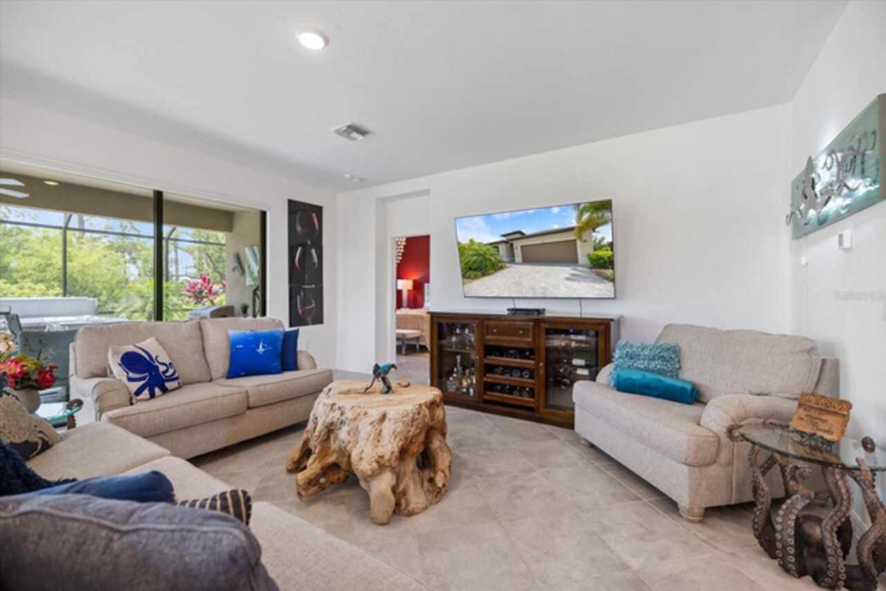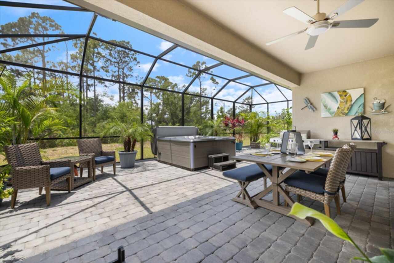 Don’t miss this one! Features include an Above ground heated hot tub perfect for cozy nights, WRAP AROUND LANAI, DOG RUN, HURRICANE SHUTTERS, over 2000 square ft, versatile den or office with French doors, custom electric sun shades, upgraded modern finishes throughout, EXPANSIVE KITCHEN ISLAND, REVERSE OSMOSIS SYSTEM, and NO FLOOD INSURANCE REQUIRED! This is your next home that you don’t want to miss. Professionally designed and MOVE IN READY, it’s a 3 bedroom, +Den/Office, 3 full bath with open floor plan, an HOA that includes your lawn maintenance and a COMMUNITY POOL. The open-concept layout includes a spacious kitchen with granite countertops, tall cabinets, walk-in pantry, new upgraded refrigerator, and large island with lots of seating. The living and dining areas open to a screened lanai with a 6-person spa, dog run, and lush privacy landscaping. The primary suite offers his-and-hers walk in closets and a spa-style bath with soaking tub and walk-in shower. Located in the community of West Port of Port Charlotte offering resort-style amenities—pool, playground, trails, and more—all minutes from beaches, golf, and spring training stadiums.