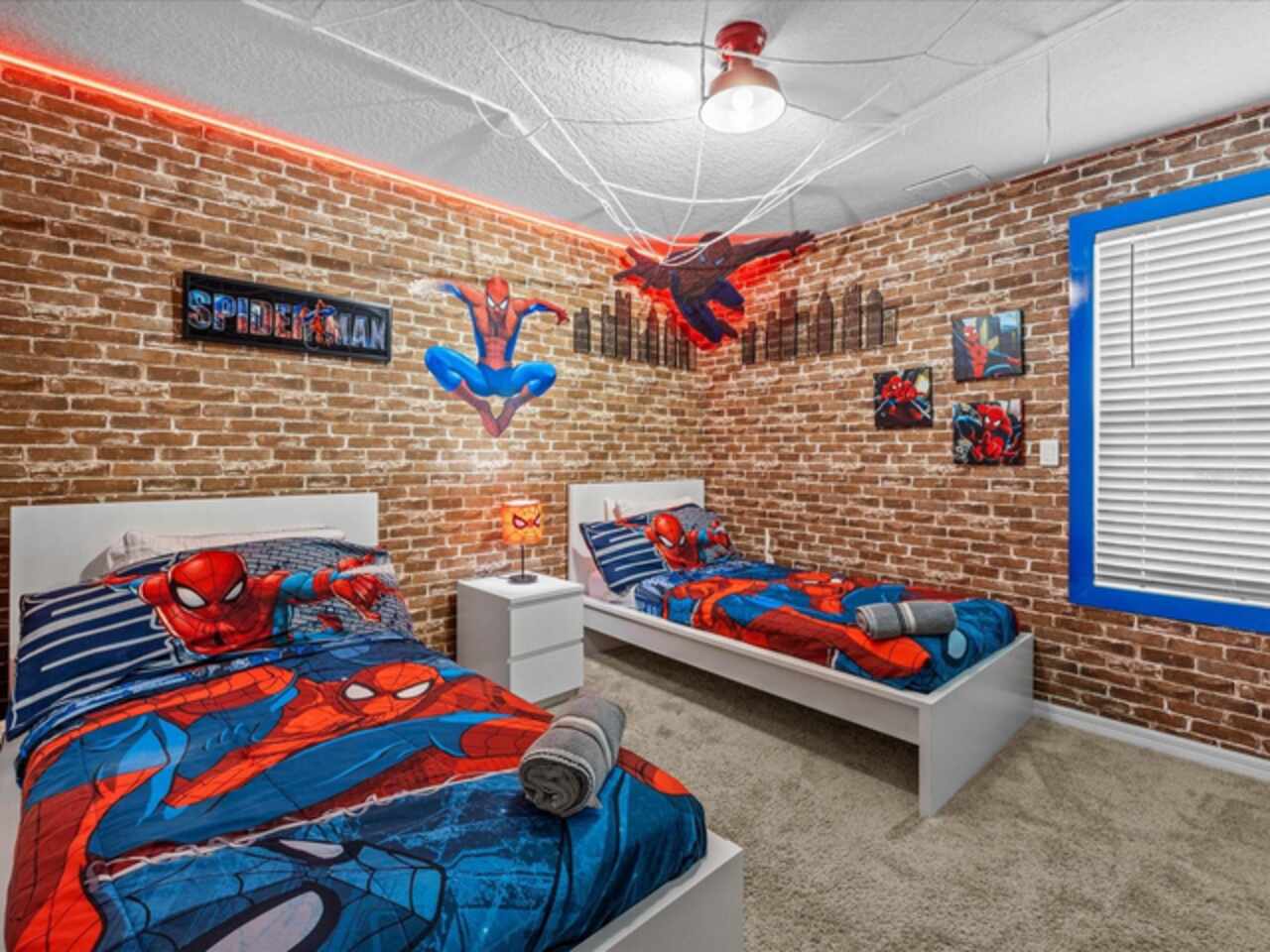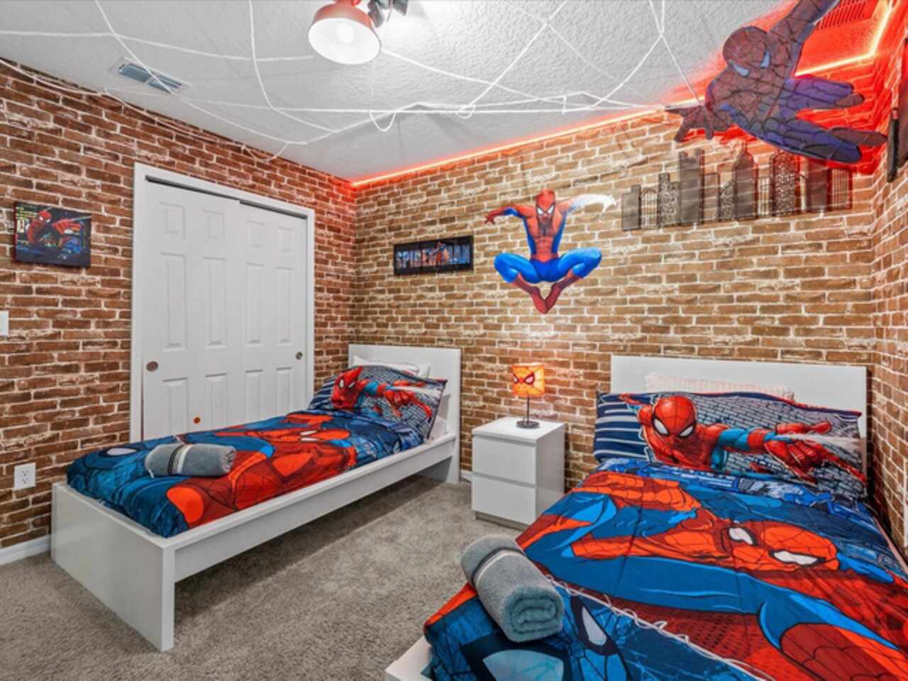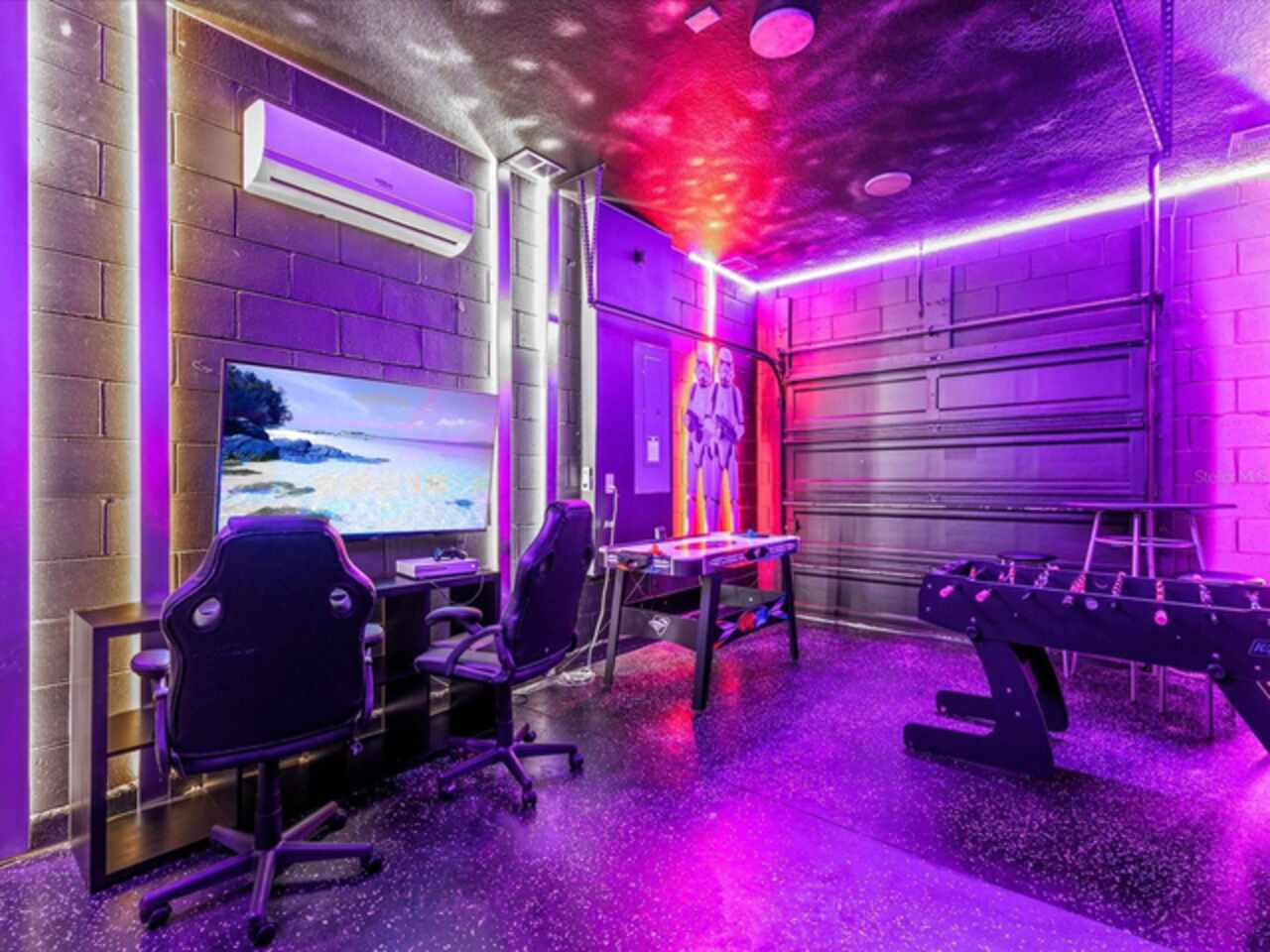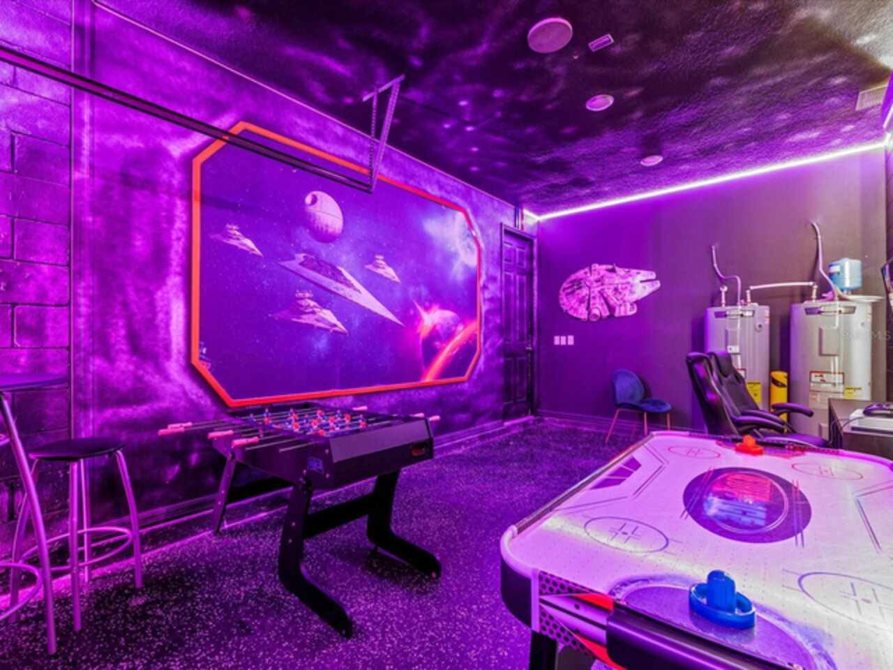 Do not miss this Fully Furnished Vacation home with amazing themed rooms and Gaming area. Built in 2022 this like new home has been professionally decorated with multiple themed rooms and tastefully decorated adult bedrooms. Mini split air conditioner in the garage converted with game table and game console make this space perfect for keeping guests entertained. There's a fully equipped kitchen for all your cooking needs. Kitchen has quartz countertops, tiled backsplash and 42 in cabinets. The breakfast bar and oversized island is complete with stools and is ideal for a casual quick meal in the morning to energize the start of your day. For a more formal meal, especially for the holidays, there is a formal dining area. The dual living area provides plenty of seating upstairs in the loft or downstairs in the living area to watch a show or sports game after a long day of adventures around the Orlando. The triple sliding doors open to the patio can be accessed via the living area, where you can relax under the covered lanai or take a dip in the heated pool or spa. Enclosed lanai overlooks conservation area for privacy. There is also a restroom off the pool area. There are 2 master suites with king-size beds, one downstairs and the other upstairs, with en-suite bathrooms, each with dual sinks. The little ones will love the Spiderman, Little Mermaid and Harry Potter inspired bedrooms. Enjoy unlimited access to the state-of-the-art 13, 000 sq.ft clubhouse, resort pool and water park, a Surf Simulator, well-equipped fitness room, volleyball courts, soccer field, Little tikes playground, and Teen video and recreational area. There is also a poolside cafe where you can enjoy food and drinks even frozen cocktails! Solara is close to Theme parks, Restaurants, Sunset walk, theaters and more. Don’t miss your chance to view this well appointed vacation home ready to rent!