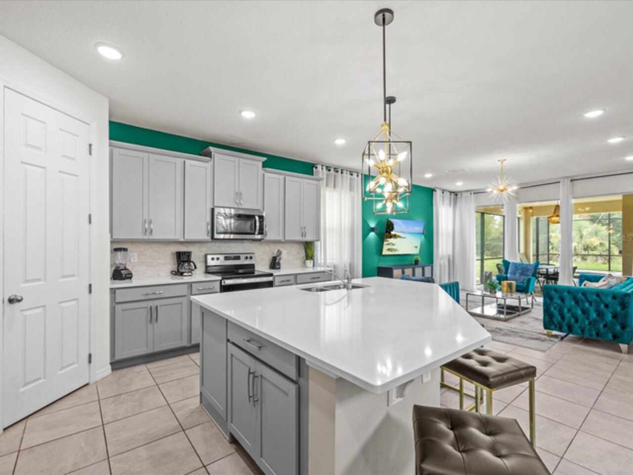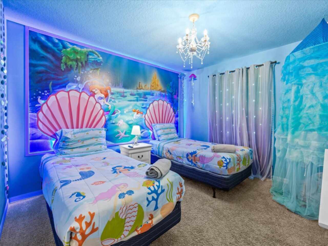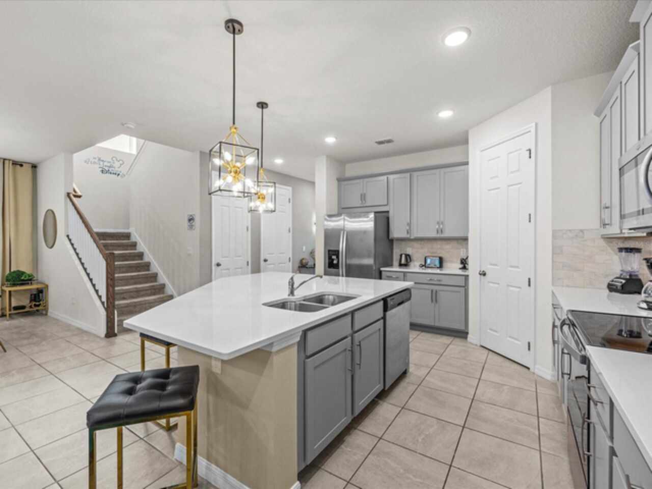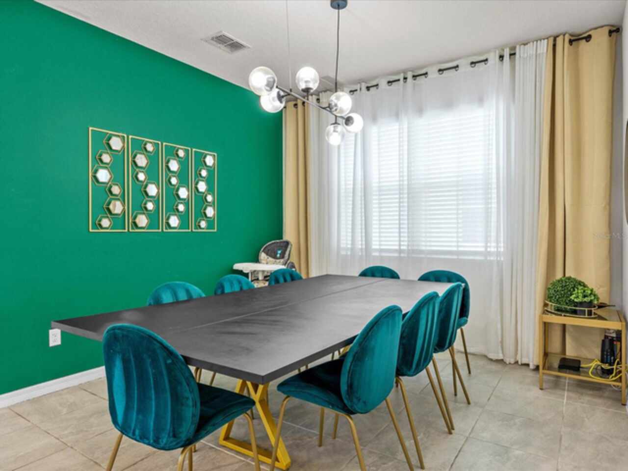 Do not miss this Fully Furnished Vacation home with amazing themed rooms and Gaming area. Built in 2022 this like new home has been professionally decorated with multiple themed rooms and tastefully decorated adult bedrooms. Mini split air conditioner in the garage converted with game table and game console make this space perfect for keeping guests entertained. There's a fully equipped kitchen for all your cooking needs. Kitchen has quartz countertops, tiled backsplash and 42 in cabinets. The breakfast bar and oversized island is complete with stools and is ideal for a casual quick meal in the morning to energize the start of your day. For a more formal meal, especially for the holidays, there is a formal dining area. The dual living area provides plenty of seating upstairs in the loft or downstairs in the living area to watch a show or sports game after a long day of adventures around the Orlando. The triple sliding doors open to the patio can be accessed via the living area, where you can relax under the covered lanai or take a dip in the heated pool or spa. Enclosed lanai overlooks conservation area for privacy. There is also a restroom off the pool area. There are 2 master suites with king-size beds, one downstairs and the other upstairs, with en-suite bathrooms, each with dual sinks. The little ones will love the Spiderman, Little Mermaid and Harry Potter inspired bedrooms. Enjoy unlimited access to the state-of-the-art 13, 000 sq.ft clubhouse, resort pool and water park, a Surf Simulator, well-equipped fitness room, volleyball courts, soccer field, Little tikes playground, and Teen video and recreational area. There is also a poolside cafe where you can enjoy food and drinks even frozen cocktails! Solara is close to Theme parks, Restaurants, Sunset walk, theaters and more. Don’t miss your chance to view this well appointed vacation home ready to rent!