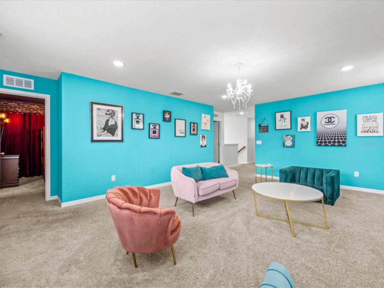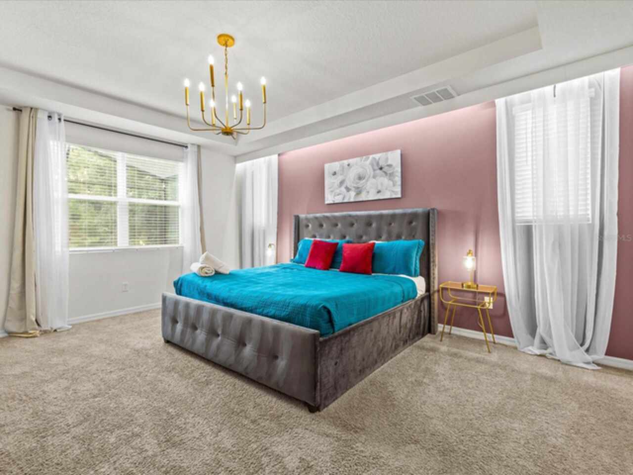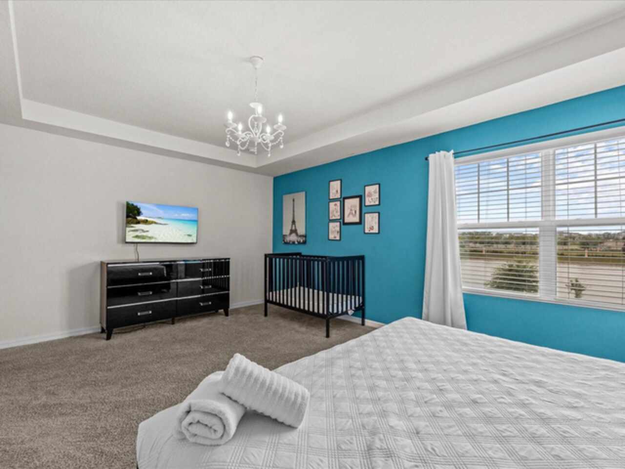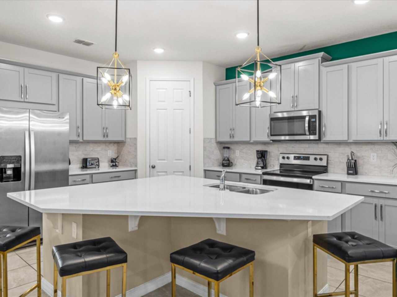 Do not miss this Fully Furnished Vacation home with amazing themed rooms and Gaming area. Built in 2022 this like new home has been professionally decorated with multiple themed rooms and tastefully decorated adult bedrooms. Mini split air conditioner in the garage converted with game table and game console make this space perfect for keeping guests entertained. There's a fully equipped kitchen for all your cooking needs. Kitchen has quartz countertops, tiled backsplash and 42 in cabinets. The breakfast bar and oversized island is complete with stools and is ideal for a casual quick meal in the morning to energize the start of your day. For a more formal meal, especially for the holidays, there is a formal dining area. The dual living area provides plenty of seating upstairs in the loft or downstairs in the living area to watch a show or sports game after a long day of adventures around the Orlando. The triple sliding doors open to the patio can be accessed via the living area, where you can relax under the covered lanai or take a dip in the heated pool or spa. Enclosed lanai overlooks conservation area for privacy. There is also a restroom off the pool area. There are 2 master suites with king-size beds, one downstairs and the other upstairs, with en-suite bathrooms, each with dual sinks. The little ones will love the Spiderman, Little Mermaid and Harry Potter inspired bedrooms. Enjoy unlimited access to the state-of-the-art 13, 000 sq.ft clubhouse, resort pool and water park, a Surf Simulator, well-equipped fitness room, volleyball courts, soccer field, Little tikes playground, and Teen video and recreational area. There is also a poolside cafe where you can enjoy food and drinks even frozen cocktails! Solara is close to Theme parks, Restaurants, Sunset walk, theaters and more. Don’t miss your chance to view this well appointed vacation home ready to rent!