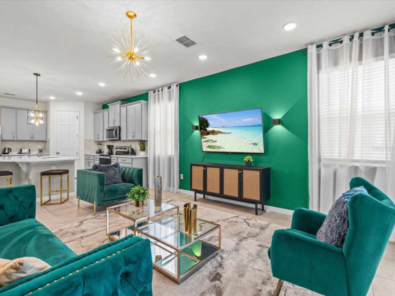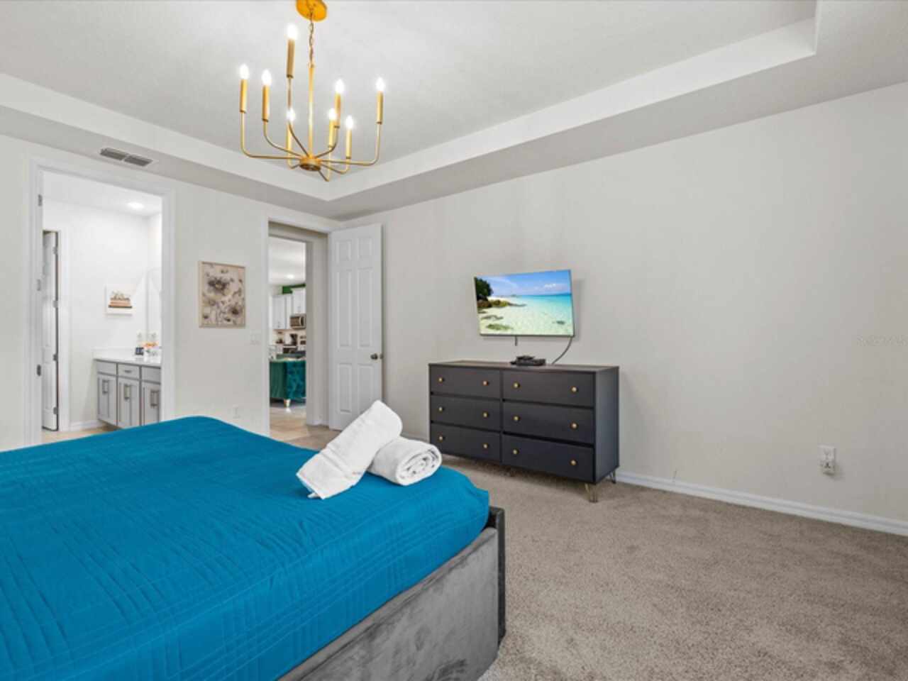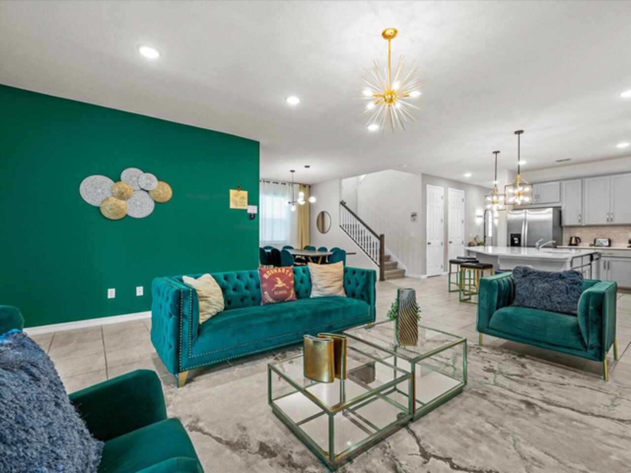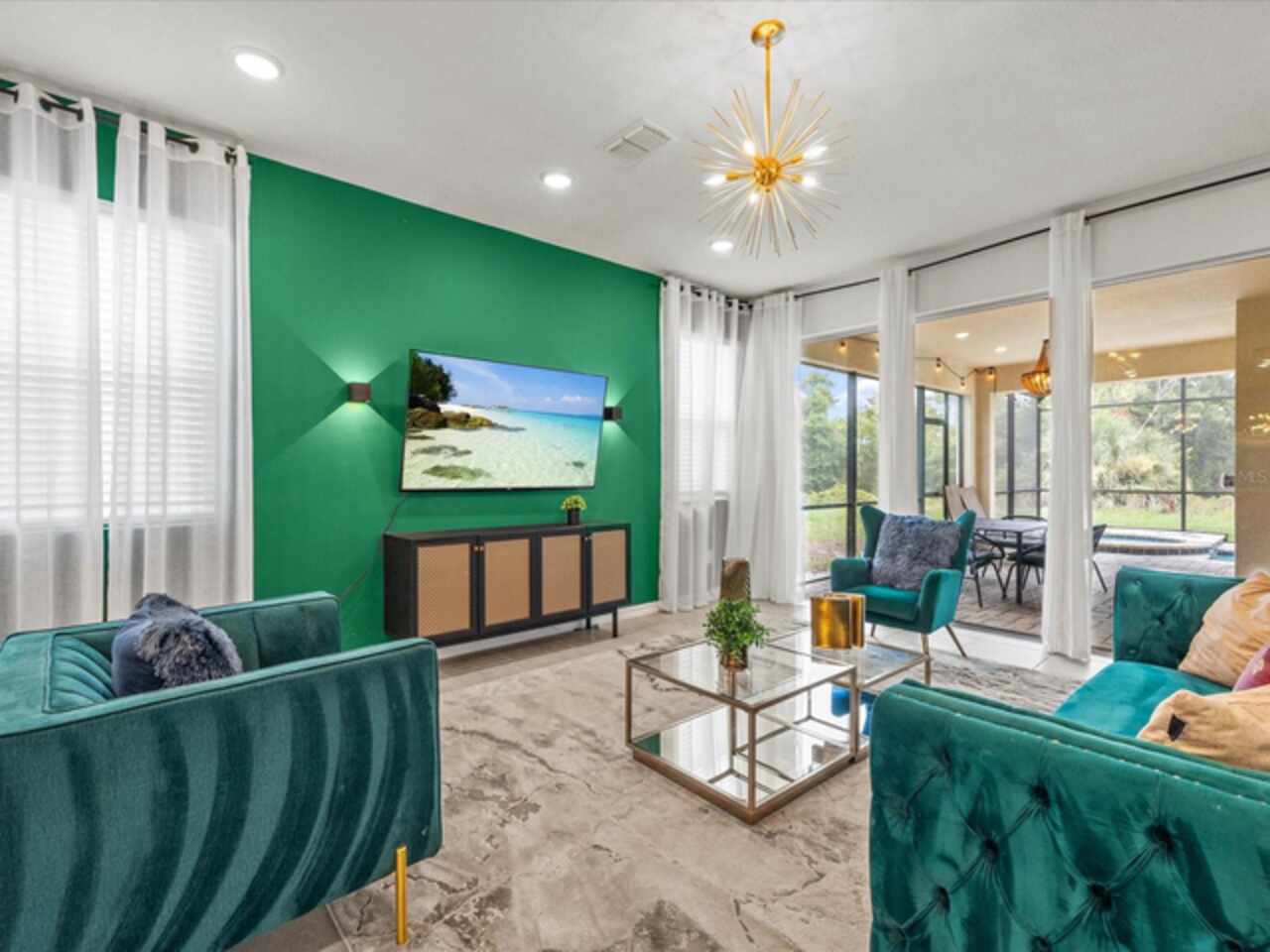 Do not miss this Fully Furnished Vacation home with amazing themed rooms and Gaming area. Built in 2022 this like new home has been professionally decorated with multiple themed rooms and tastefully decorated adult bedrooms. Mini split air conditioner in the garage converted with game table and game console make this space perfect for keeping guests entertained. There's a fully equipped kitchen for all your cooking needs. Kitchen has quartz countertops, tiled backsplash and 42 in cabinets. The breakfast bar and oversized island is complete with stools and is ideal for a casual quick meal in the morning to energize the start of your day. For a more formal meal, especially for the holidays, there is a formal dining area. The dual living area provides plenty of seating upstairs in the loft or downstairs in the living area to watch a show or sports game after a long day of adventures around the Orlando. The triple sliding doors open to the patio can be accessed via the living area, where you can relax under the covered lanai or take a dip in the heated pool or spa. Enclosed lanai overlooks conservation area for privacy. There is also a restroom off the pool area. There are 2 master suites with king-size beds, one downstairs and the other upstairs, with en-suite bathrooms, each with dual sinks. The little ones will love the Spiderman, Little Mermaid and Harry Potter inspired bedrooms. Enjoy unlimited access to the state-of-the-art 13, 000 sq.ft clubhouse, resort pool and water park, a Surf Simulator, well-equipped fitness room, volleyball courts, soccer field, Little tikes playground, and Teen video and recreational area. There is also a poolside cafe where you can enjoy food and drinks even frozen cocktails! Solara is close to Theme parks, Restaurants, Sunset walk, theaters and more. Don’t miss your chance to view this well appointed vacation home ready to rent!