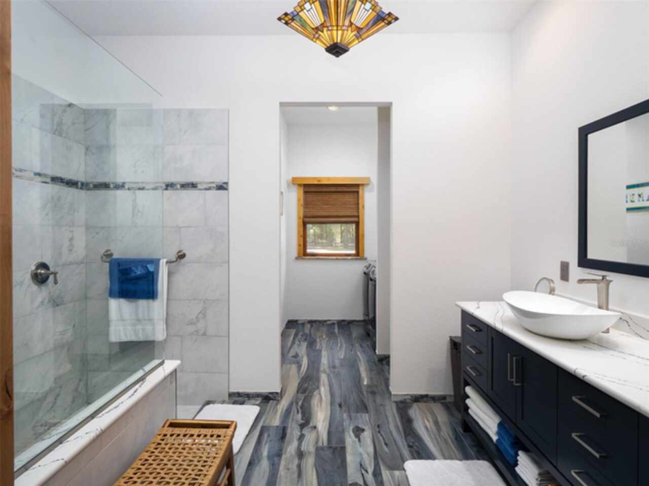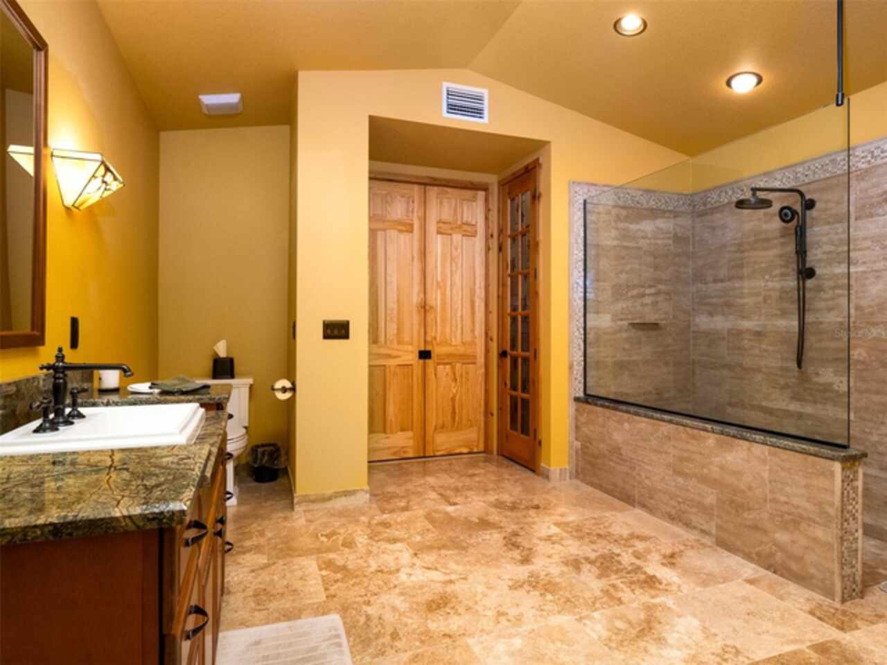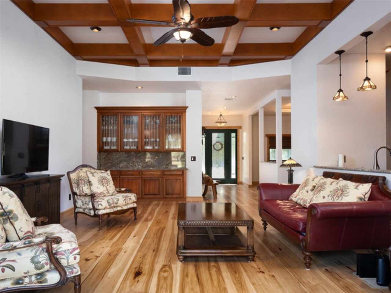 Ceiling Fans(s), Coffered Ceiling(s), Crown Molding, High Ceilings, Primary Bedroom Main Floor, Solid Surface Counters, Solid Wood Cabinets, Split Bedroom, Stone Counters, Thermostat, Tray Ceiling(s), Vaulted Ceiling(s), Walk-In Closet(s), Window Treatments