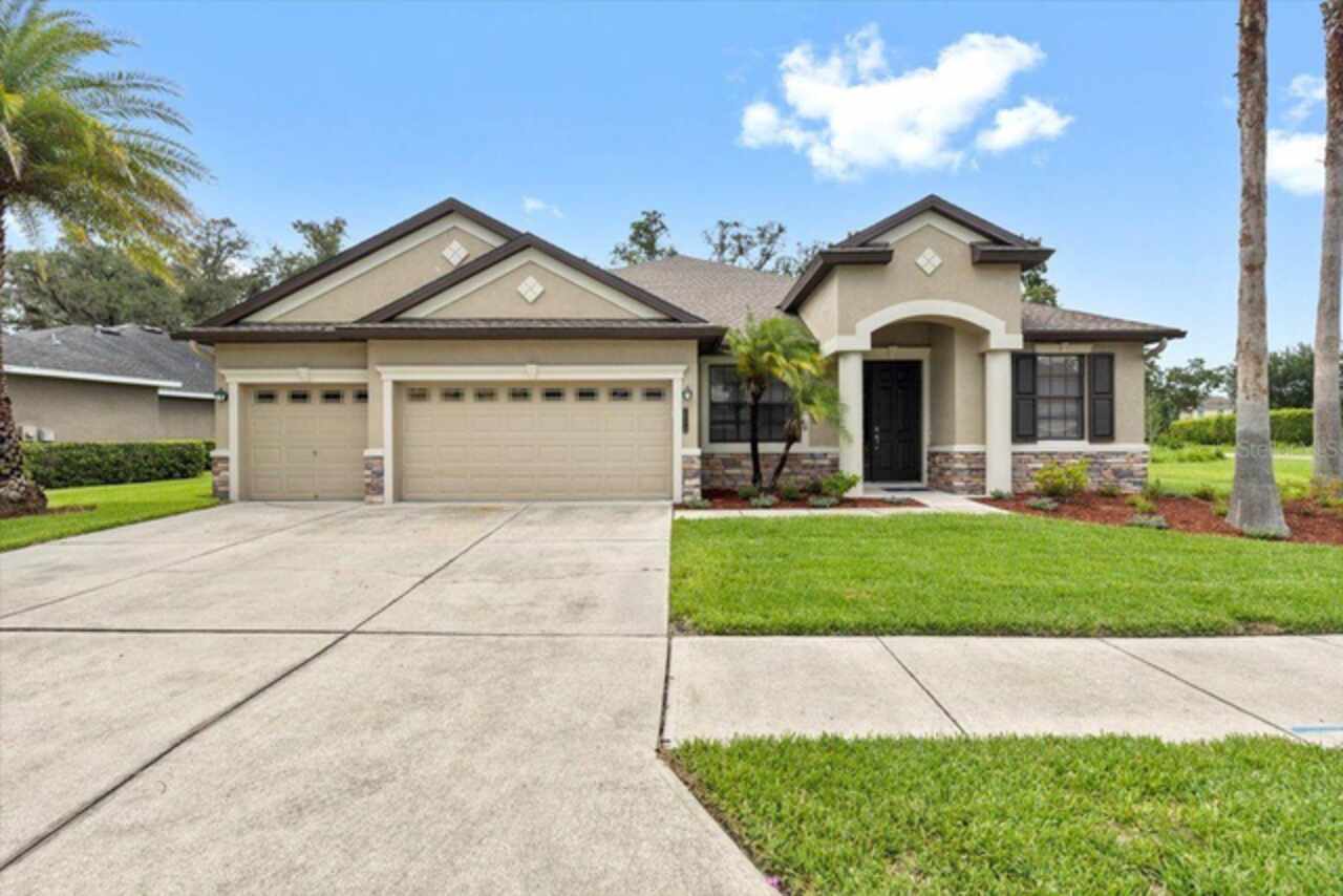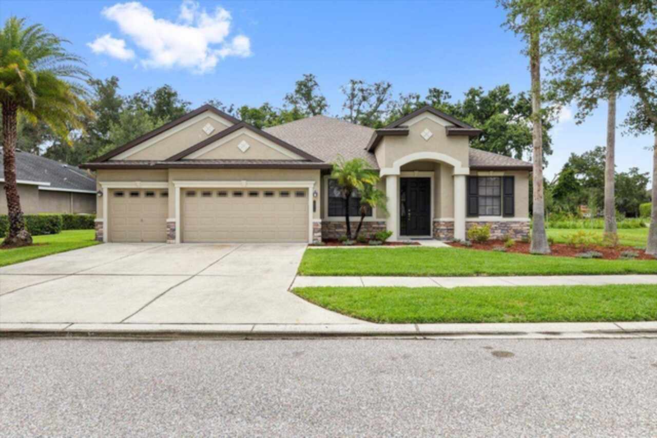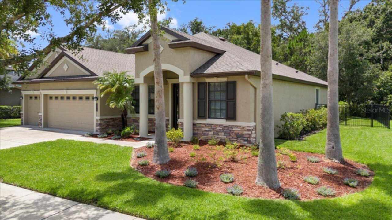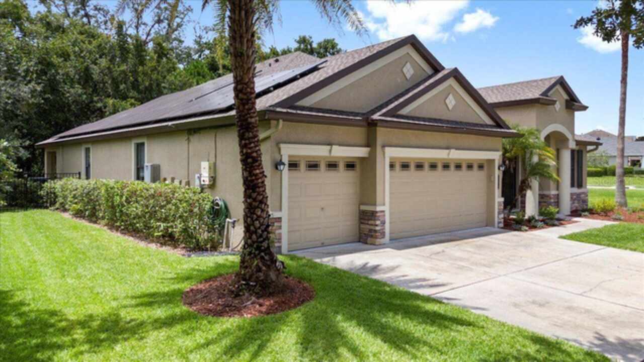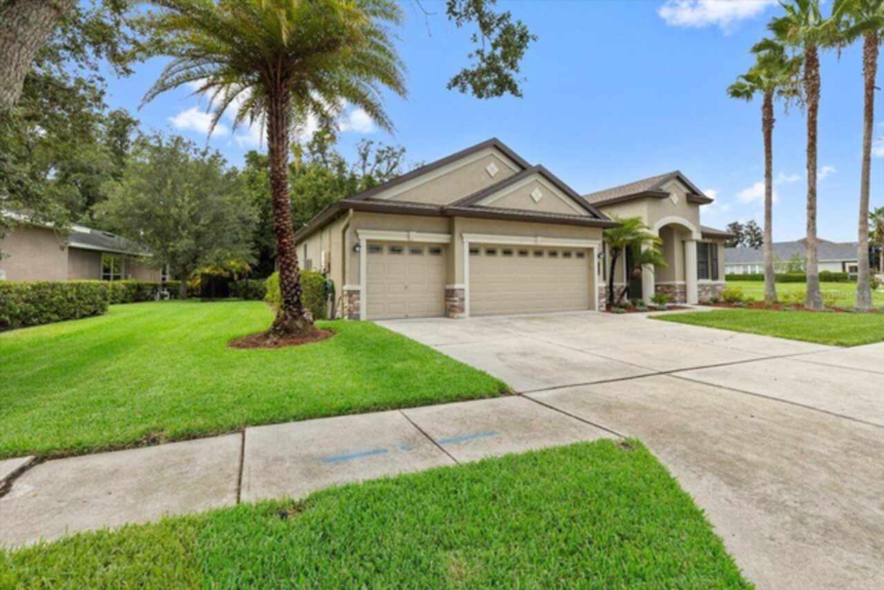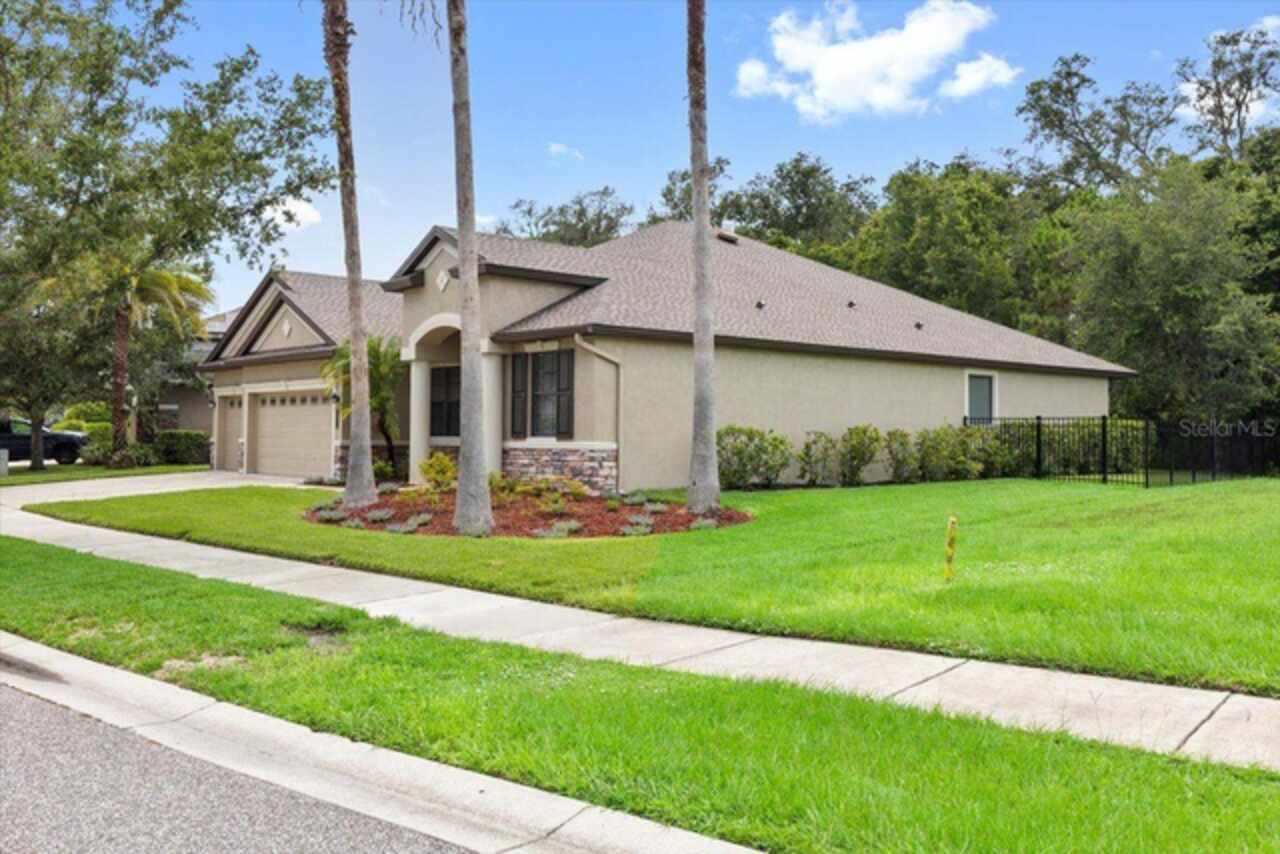 One or more photo(s) has been virtually staged. Poised on a lush corner conservation lot in the prestigious guard-gated community of Grand Hampton, this meticulously maintained 4-bedroom + office, 3-bath, 3-car garage residence blends thoughtful design with modern upgrades and captivating curb appeal. Located within walking distance to the park and basketball court, this home offers both luxury and convenience. A new roof (2025) and exterior paint (2021) ensure lasting value, while the surrounding landscape—featuring swaying palm trees and vibrant red bark mulch—sets a tone of tropical sophistication. Step inside and instantly feel the airy openness created by cascading natural light and expansive wood-planked tile flooring that flows through all the main living spaces. The combined formal living and dining area makes an ideal setting for both upscale entertaining and quiet evenings at home. Just off the front living space is a private bedroom with carpet flooring, a walk-in closet, and access to a full guest bath—ideal for guests or multigenerational living. Continue through to the spacious secondary living room, where stacker glass sliders seamlessly connect indoor and outdoor living. Overlooking the conservation area, this space is framed by modern light fixtures and generous natural light. The primary suite is a serene retreat, featuring tray ceilings, stylish finishes, and tranquil views. The spa-like primary bath offers dual vanities, a garden soaking tub, glass walk-in shower, and a custom-built walk-in closet designed for functionality and flair. At the heart of the home, the kitchen is outfitted with solid wood cabinetry, granite countertops, stainless steel appliances including a gas range, recessed lighting, and thoughtful features like a lazy Susan and breakfast bar seating. The adjacent dinette offers serene views of the backyard and conservation beyond. The private home office, located just off the kitchen, boasts laminate flooring and inspiring views—perfect for remote work or creative pursuits. Also off the kitchen, you’ll find the laundry room, third full bathroom, and two additional bedrooms with luxury vinyl flooring and ample closet space. Step outside to your slice of Florida paradise—an oversized covered lanai perfect for entertaining, relaxing, or transforming into your own outdoor oasis. With no rear neighbors, a natural backdrop, a fully fenced-in backyard, this outdoor space invites you to unwind and enjoy Florida’s year-round sunshine. Notable upgrades include: Owned Solar Panels, Rinnai Tankless Water Heater, 2024 HVAC, and water softener (2 years old). This home is located within the highly sought-after, resort-style community of Grand Hampton. The community provides a wealth of amenities, including a 24-hour manned gate, state-of-the-art clubhouse, fitness center, playgrounds, lake access, and heated pools—including a lagoon-style pool with slide and a lap pool. Additional recreational features include tennis courts and basketball courts. Conveniently located near major highways I-75 and I-275, this property is just a short drive to local attractions such as Advent Hospital, PHSC, AdventHealth Center Ice, The Shops at Wiregrass, and Tampa Premium Outlets. Don’t miss your chance to own this exceptional home. Schedule your private showing today! For a virtual tour, click the provided link and experience the beauty of this remarkable property.