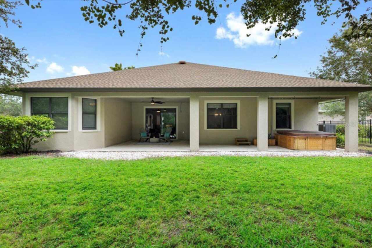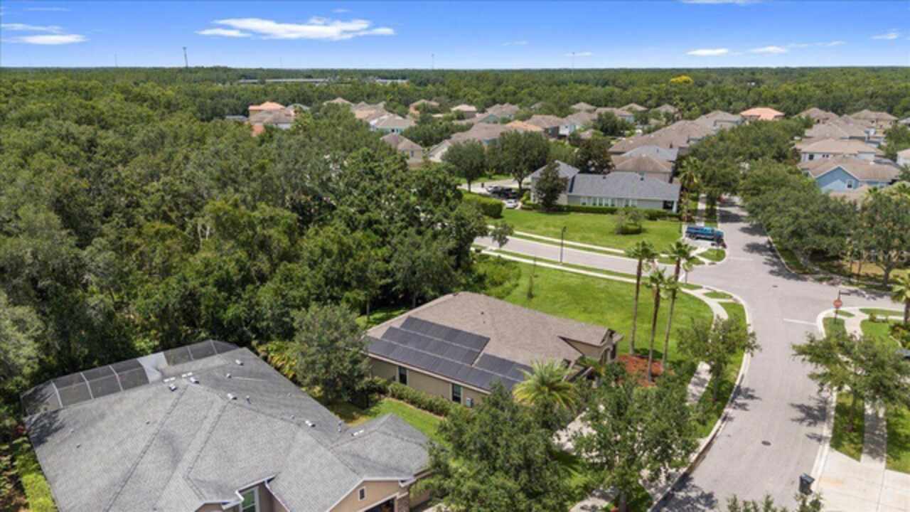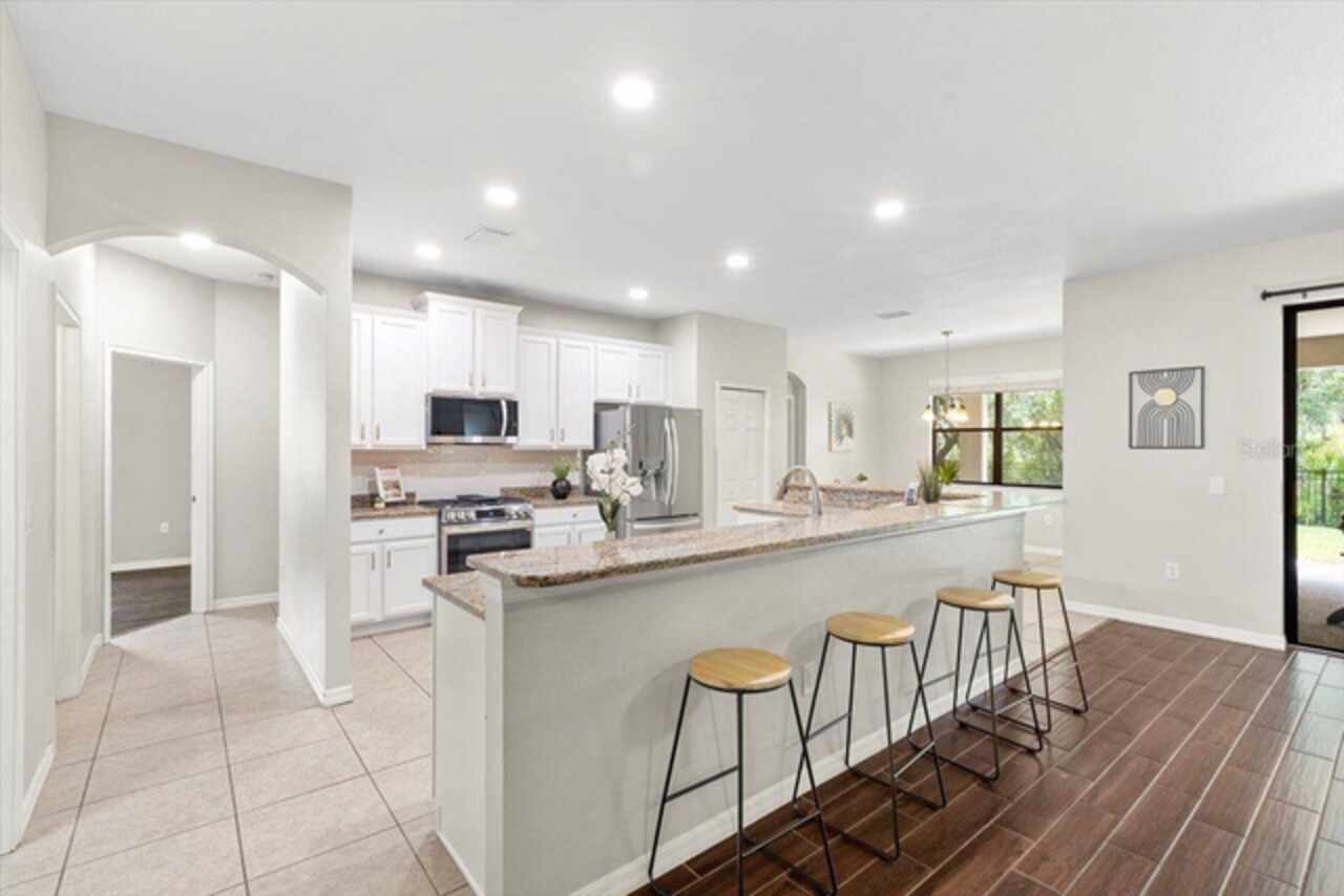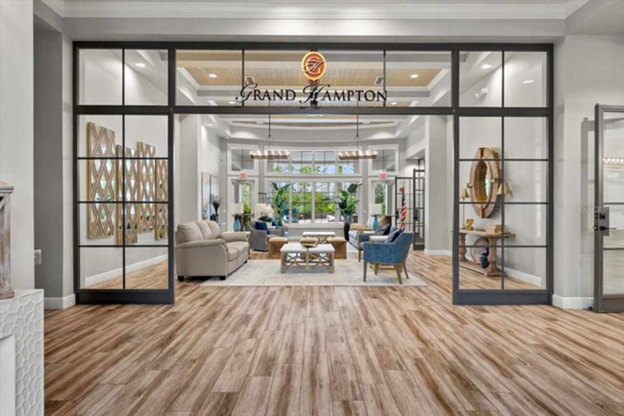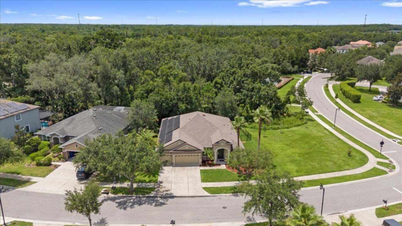 One or more photo(s) has been virtually staged. Poised on a lush corner conservation lot in the prestigious guard-gated community of Grand Hampton, this meticulously maintained 4-bedroom + office, 3-bath, 3-car garage residence blends thoughtful design with modern upgrades and captivating curb appeal. Located within walking distance to the park and basketball court, this home offers both luxury and convenience. A new roof (2025) and exterior paint (2021) ensure lasting value, while the surrounding landscape—featuring swaying palm trees and vibrant red bark mulch—sets a tone of tropical sophistication. Step inside and instantly feel the airy openness created by cascading natural light and expansive wood-planked tile flooring that flows through all the main living spaces. The combined formal living and dining area makes an ideal setting for both upscale entertaining and quiet evenings at home. Just off the front living space is a private bedroom with carpet flooring, a walk-in closet, and access to a full guest bath—ideal for guests or multigenerational living. Continue through to the spacious secondary living room, where stacker glass sliders seamlessly connect indoor and outdoor living. Overlooking the conservation area, this space is framed by modern light fixtures and generous natural light. The primary suite is a serene retreat, featuring tray ceilings, stylish finishes, and tranquil views. The spa-like primary bath offers dual vanities, a garden soaking tub, glass walk-in shower, and a custom-built walk-in closet designed for functionality and flair. At the heart of the home, the kitchen is outfitted with solid wood cabinetry, granite countertops, stainless steel appliances including a gas range, recessed lighting, and thoughtful features like a lazy Susan and breakfast bar seating. The adjacent dinette offers serene views of the backyard and conservation beyond. The private home office, located just off the kitchen, boasts laminate flooring and inspiring views—perfect for remote work or creative pursuits. Also off the kitchen, you’ll find the laundry room, third full bathroom, and two additional bedrooms with luxury vinyl flooring and ample closet space. Step outside to your slice of Florida paradise—an oversized covered lanai perfect for entertaining, relaxing, or transforming into your own outdoor oasis. With no rear neighbors, a natural backdrop, a fully fenced-in backyard, this outdoor space invites you to unwind and enjoy Florida’s year-round sunshine. Notable upgrades include: Owned Solar Panels, Rinnai Tankless Water Heater, 2024 HVAC, and water softener (2 years old). This home is located within the highly sought-after, resort-style community of Grand Hampton. The community provides a wealth of amenities, including a 24-hour manned gate, state-of-the-art clubhouse, fitness center, playgrounds, lake access, and heated pools—including a lagoon-style pool with slide and a lap pool. Additional recreational features include tennis courts and basketball courts. Conveniently located near major highways I-75 and I-275, this property is just a short drive to local attractions such as Advent Hospital, PHSC, AdventHealth Center Ice, The Shops at Wiregrass, and Tampa Premium Outlets. Don’t miss your chance to own this exceptional home. Schedule your private showing today! For a virtual tour, click the provided link and experience the beauty of this remarkable property.