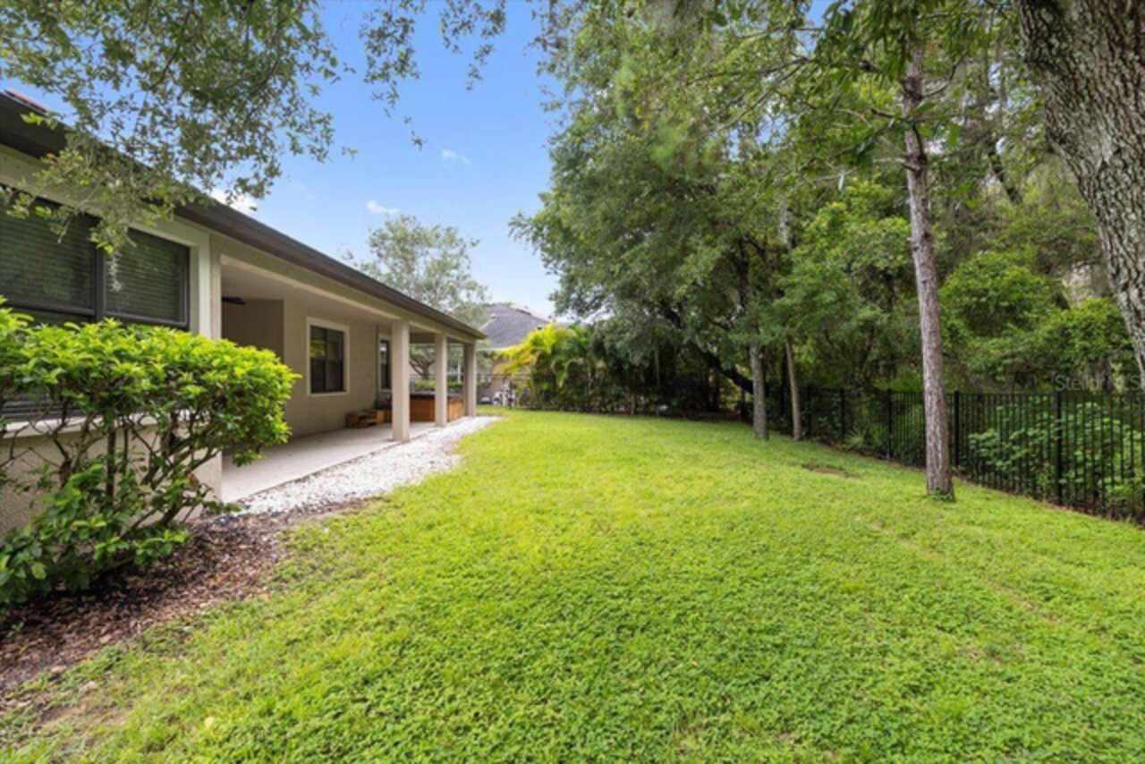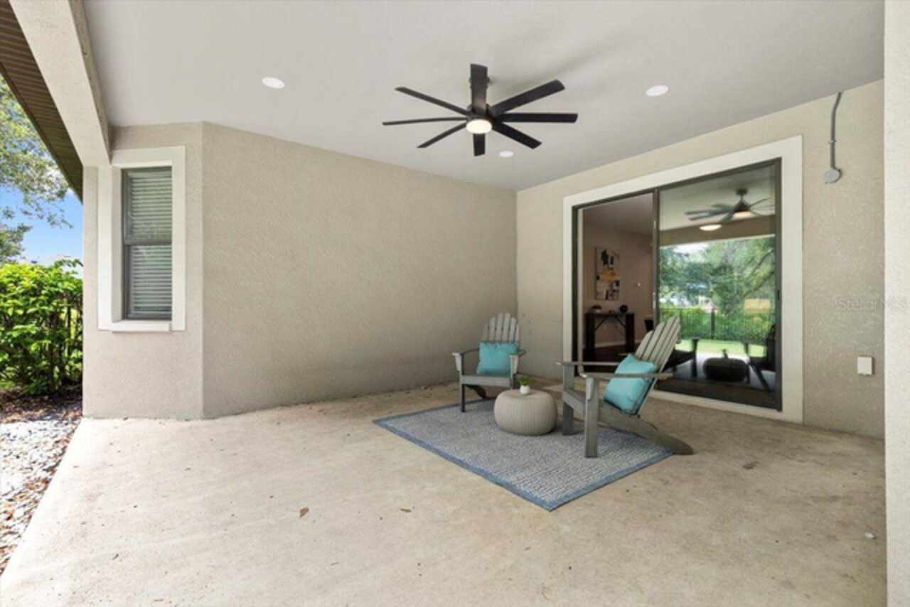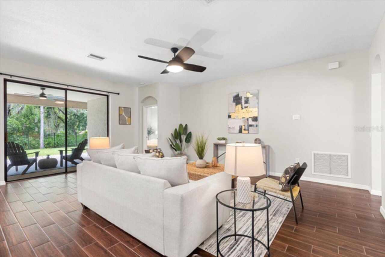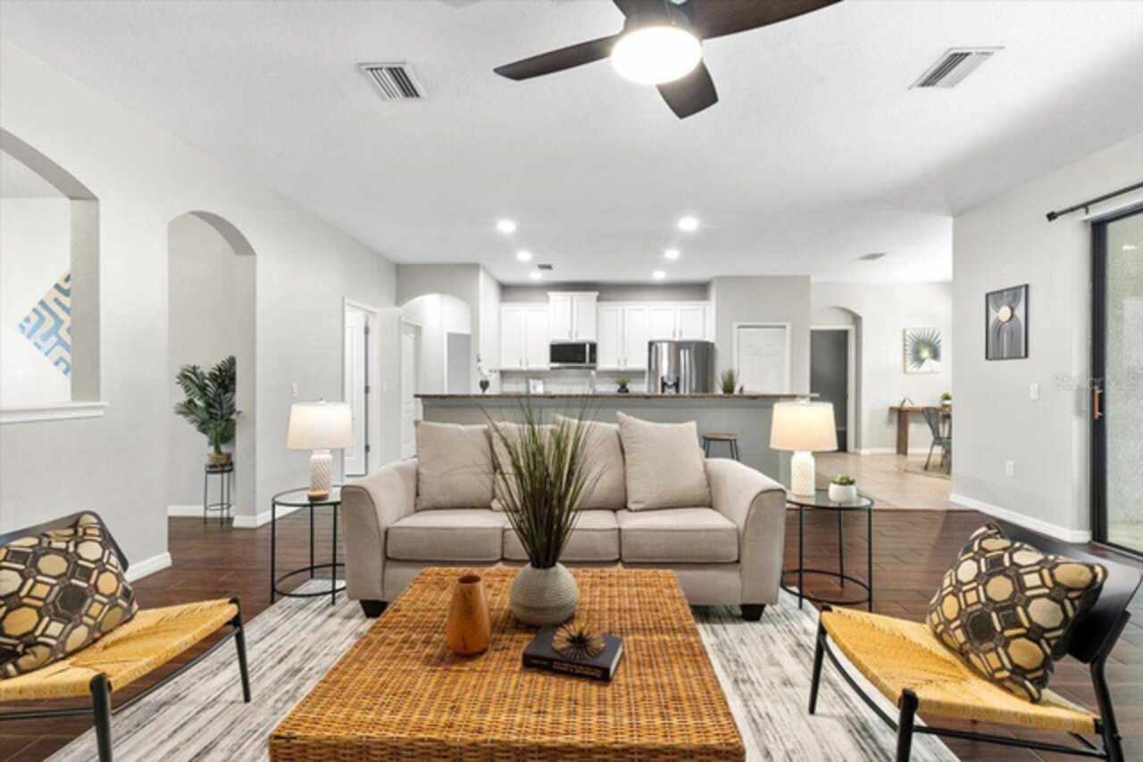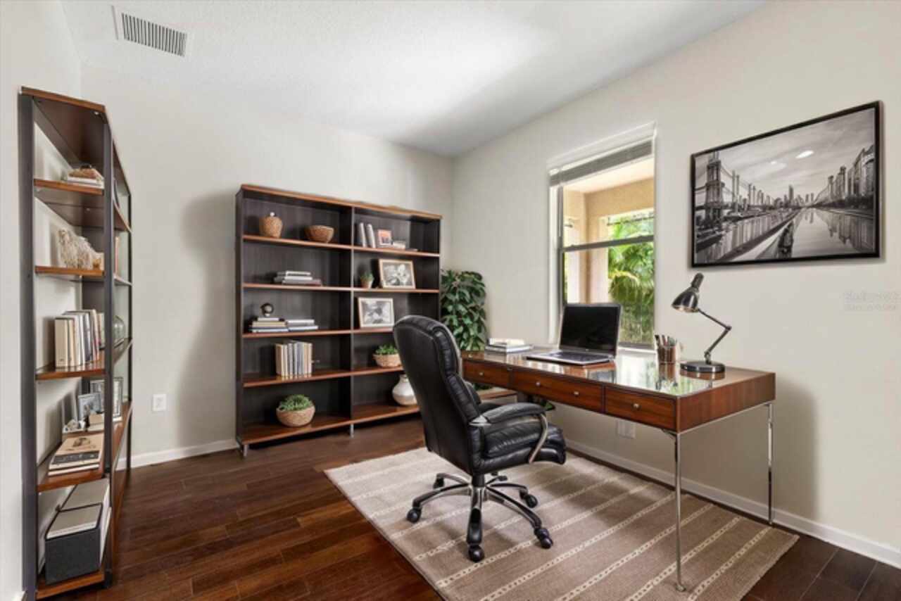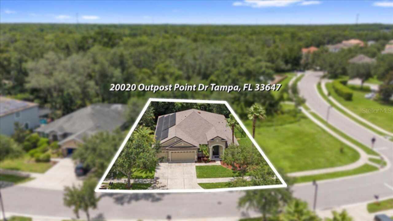 One or more photo(s) has been virtually staged. Poised on a lush corner conservation lot in the prestigious guard-gated community of Grand Hampton, this meticulously maintained 4-bedroom + office, 3-bath, 3-car garage residence blends thoughtful design with modern upgrades and captivating curb appeal. Located within walking distance to the park and basketball court, this home offers both luxury and convenience. A new roof (2025) and exterior paint (2021) ensure lasting value, while the surrounding landscape—featuring swaying palm trees and vibrant red bark mulch—sets a tone of tropical sophistication. Step inside and instantly feel the airy openness created by cascading natural light and expansive wood-planked tile flooring that flows through all the main living spaces. The combined formal living and dining area makes an ideal setting for both upscale entertaining and quiet evenings at home. Just off the front living space is a private bedroom with carpet flooring, a walk-in closet, and access to a full guest bath—ideal for guests or multigenerational living. Continue through to the spacious secondary living room, where stacker glass sliders seamlessly connect indoor and outdoor living. Overlooking the conservation area, this space is framed by modern light fixtures and generous natural light. The primary suite is a serene retreat, featuring tray ceilings, stylish finishes, and tranquil views. The spa-like primary bath offers dual vanities, a garden soaking tub, glass walk-in shower, and a custom-built walk-in closet designed for functionality and flair. At the heart of the home, the kitchen is outfitted with solid wood cabinetry, granite countertops, stainless steel appliances including a gas range, recessed lighting, and thoughtful features like a lazy Susan and breakfast bar seating. The adjacent dinette offers serene views of the backyard and conservation beyond. The private home office, located just off the kitchen, boasts laminate flooring and inspiring views—perfect for remote work or creative pursuits. Also off the kitchen, you’ll find the laundry room, third full bathroom, and two additional bedrooms with luxury vinyl flooring and ample closet space. Step outside to your slice of Florida paradise—an oversized covered lanai perfect for entertaining, relaxing, or transforming into your own outdoor oasis. With no rear neighbors, a natural backdrop, a fully fenced-in backyard, this outdoor space invites you to unwind and enjoy Florida’s year-round sunshine. Notable upgrades include: Owned Solar Panels, Rinnai Tankless Water Heater, 2024 HVAC, and water softener (2 years old). This home is located within the highly sought-after, resort-style community of Grand Hampton. The community provides a wealth of amenities, including a 24-hour manned gate, state-of-the-art clubhouse, fitness center, playgrounds, lake access, and heated pools—including a lagoon-style pool with slide and a lap pool. Additional recreational features include tennis courts and basketball courts. Conveniently located near major highways I-75 and I-275, this property is just a short drive to local attractions such as Advent Hospital, PHSC, AdventHealth Center Ice, The Shops at Wiregrass, and Tampa Premium Outlets. Don’t miss your chance to own this exceptional home. Schedule your private showing today! For a virtual tour, click the provided link and experience the beauty of this remarkable property.