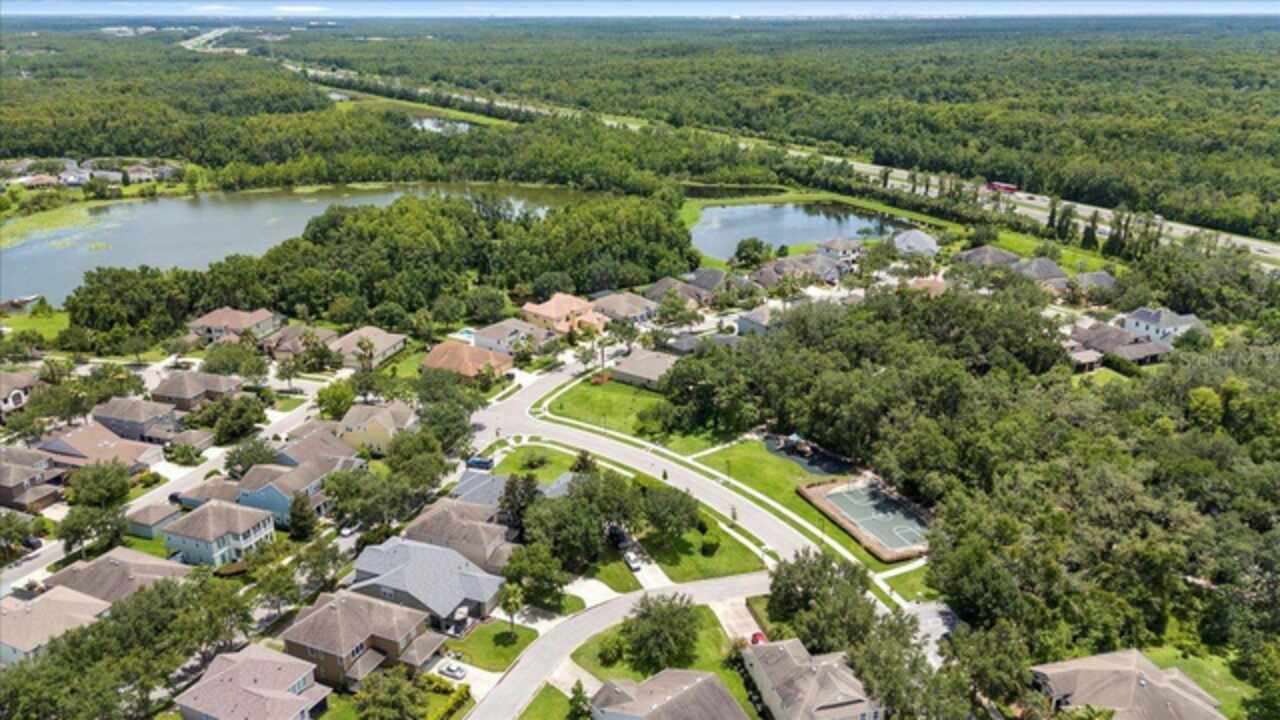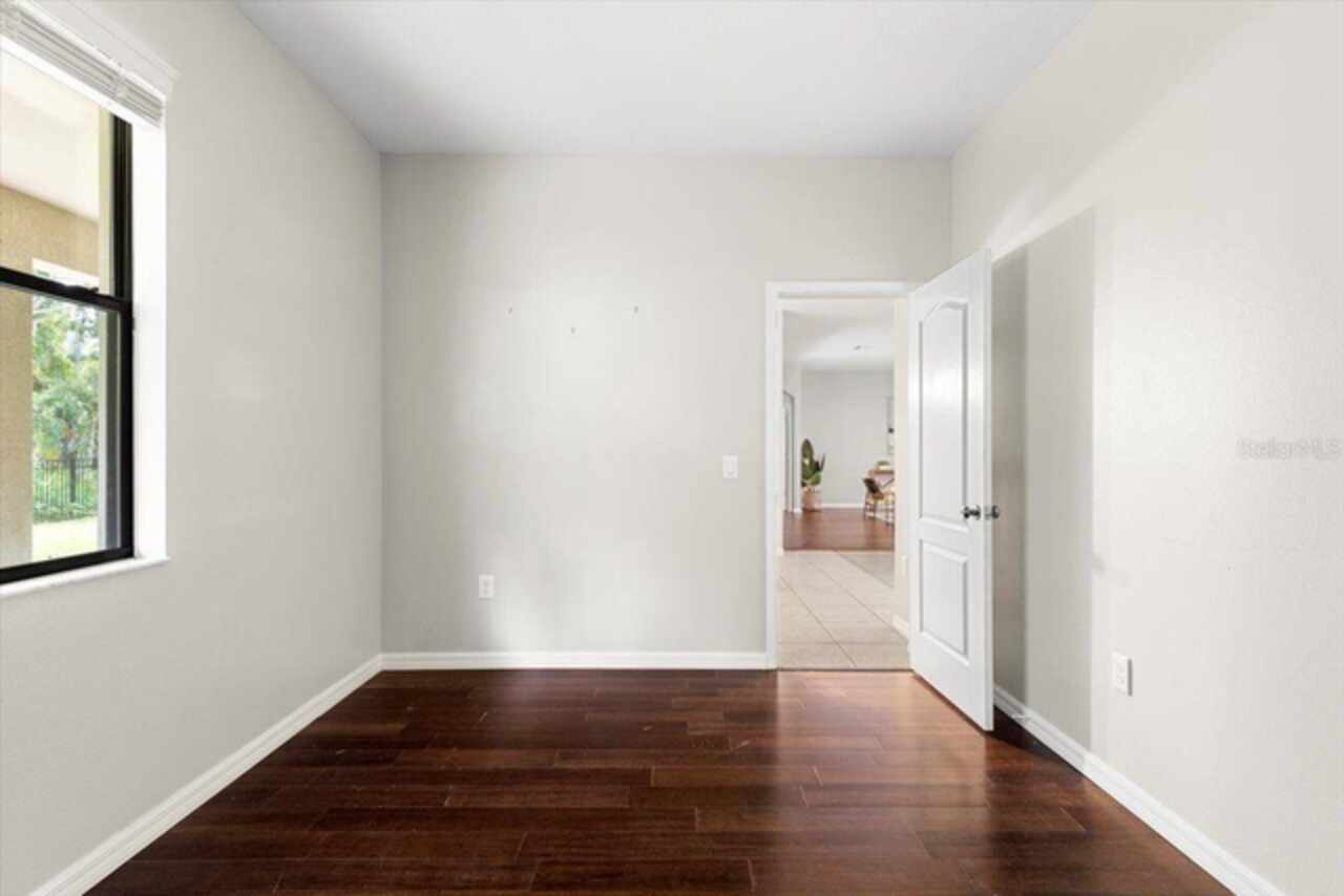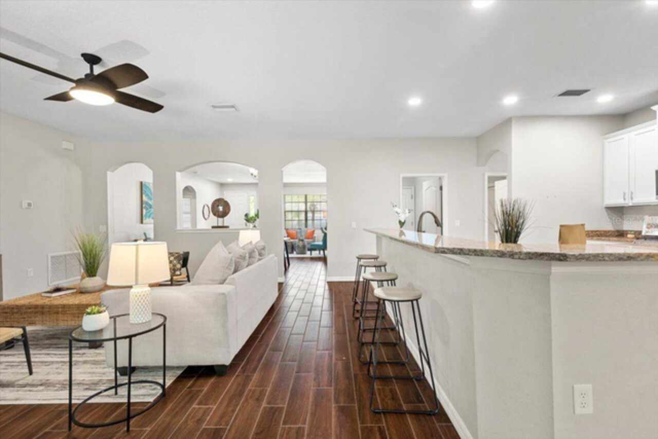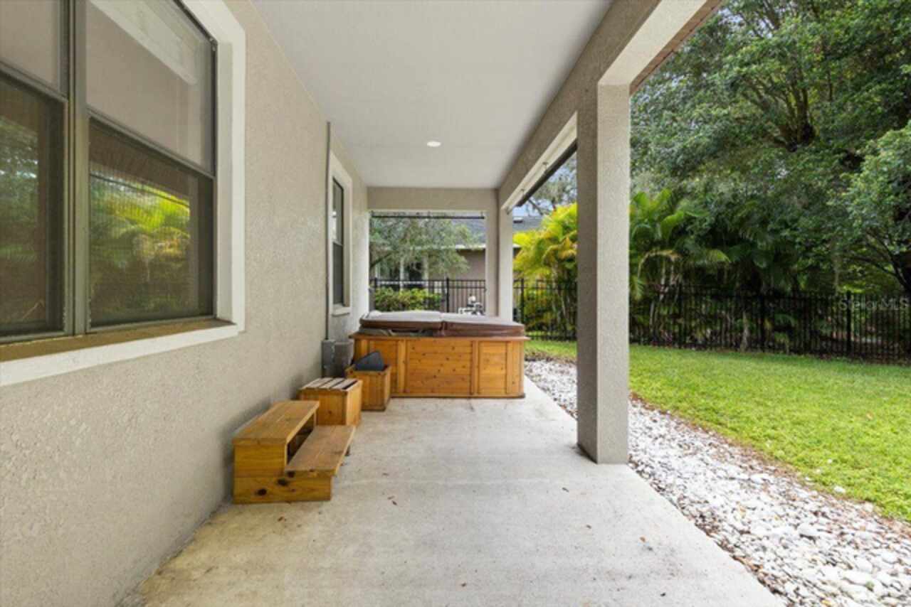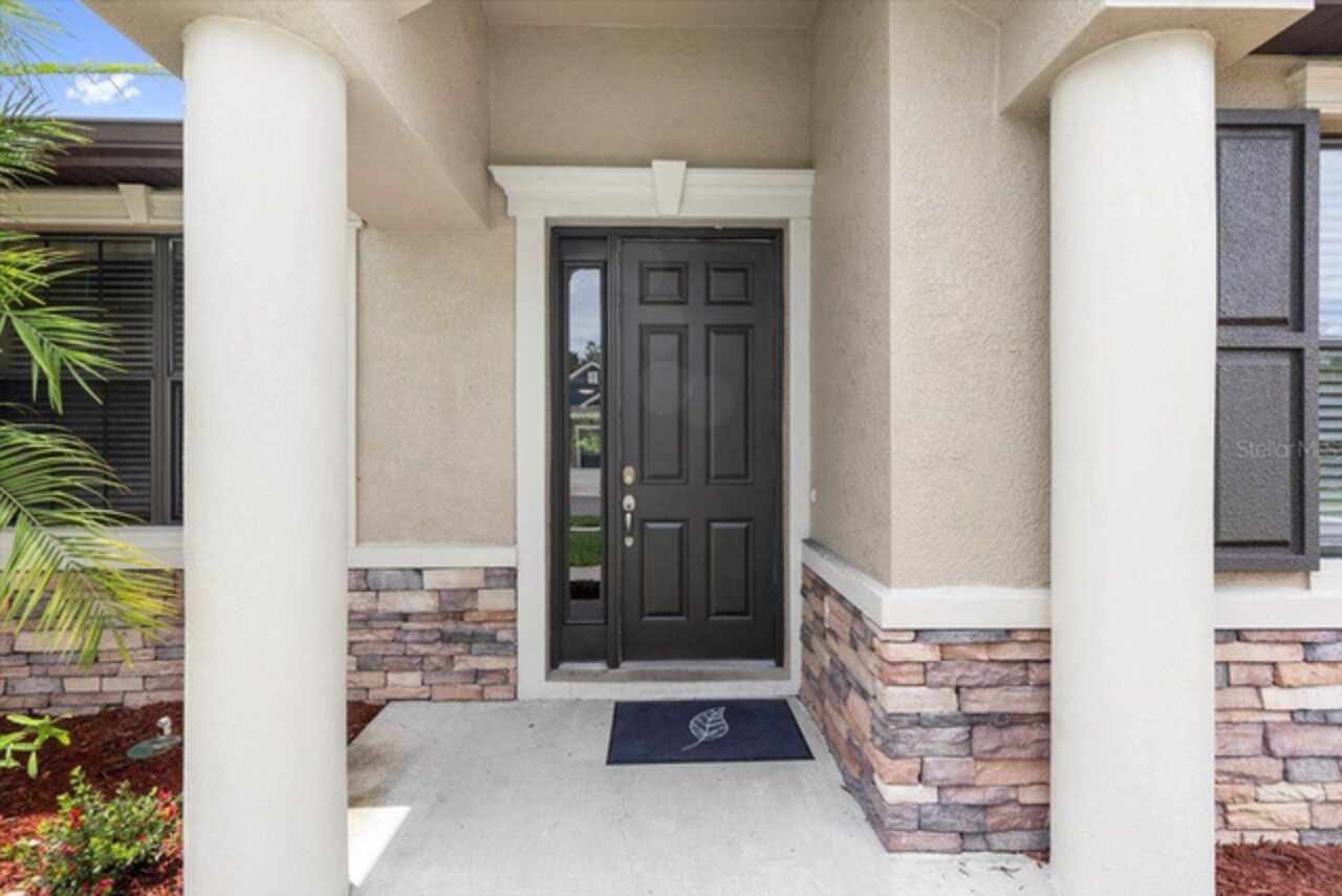 One or more photo(s) has been virtually staged. Poised on a lush corner conservation lot in the prestigious guard-gated community of Grand Hampton, this meticulously maintained 4-bedroom + office, 3-bath, 3-car garage residence blends thoughtful design with modern upgrades and captivating curb appeal. Located within walking distance to the park and basketball court, this home offers both luxury and convenience. A new roof (2025) and exterior paint (2021) ensure lasting value, while the surrounding landscape—featuring swaying palm trees and vibrant red bark mulch—sets a tone of tropical sophistication. Step inside and instantly feel the airy openness created by cascading natural light and expansive wood-planked tile flooring that flows through all the main living spaces. The combined formal living and dining area makes an ideal setting for both upscale entertaining and quiet evenings at home. Just off the front living space is a private bedroom with carpet flooring, a walk-in closet, and access to a full guest bath—ideal for guests or multigenerational living. Continue through to the spacious secondary living room, where stacker glass sliders seamlessly connect indoor and outdoor living. Overlooking the conservation area, this space is framed by modern light fixtures and generous natural light. The primary suite is a serene retreat, featuring tray ceilings, stylish finishes, and tranquil views. The spa-like primary bath offers dual vanities, a garden soaking tub, glass walk-in shower, and a custom-built walk-in closet designed for functionality and flair. At the heart of the home, the kitchen is outfitted with solid wood cabinetry, granite countertops, stainless steel appliances including a gas range, recessed lighting, and thoughtful features like a lazy Susan and breakfast bar seating. The adjacent dinette offers serene views of the backyard and conservation beyond. The private home office, located just off the kitchen, boasts laminate flooring and inspiring views—perfect for remote work or creative pursuits. Also off the kitchen, you’ll find the laundry room, third full bathroom, and two additional bedrooms with luxury vinyl flooring and ample closet space. Step outside to your slice of Florida paradise—an oversized covered lanai perfect for entertaining, relaxing, or transforming into your own outdoor oasis. With no rear neighbors, a natural backdrop, a fully fenced-in backyard, this outdoor space invites you to unwind and enjoy Florida’s year-round sunshine. Notable upgrades include: Owned Solar Panels, Rinnai Tankless Water Heater, 2024 HVAC, and water softener (2 years old). This home is located within the highly sought-after, resort-style community of Grand Hampton. The community provides a wealth of amenities, including a 24-hour manned gate, state-of-the-art clubhouse, fitness center, playgrounds, lake access, and heated pools—including a lagoon-style pool with slide and a lap pool. Additional recreational features include tennis courts and basketball courts. Conveniently located near major highways I-75 and I-275, this property is just a short drive to local attractions such as Advent Hospital, PHSC, AdventHealth Center Ice, The Shops at Wiregrass, and Tampa Premium Outlets. Don’t miss your chance to own this exceptional home. Schedule your private showing today! For a virtual tour, click the provided link and experience the beauty of this remarkable property.