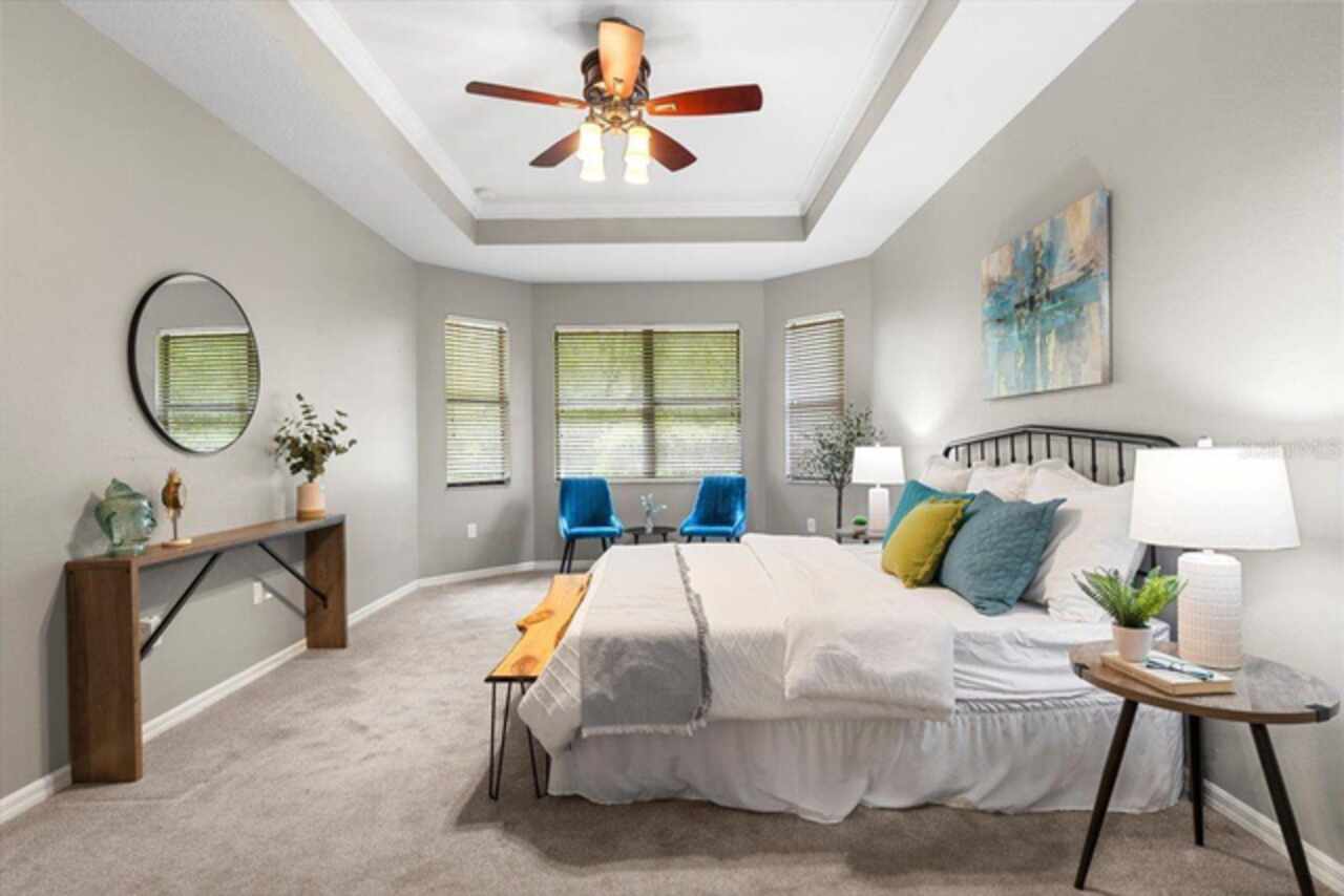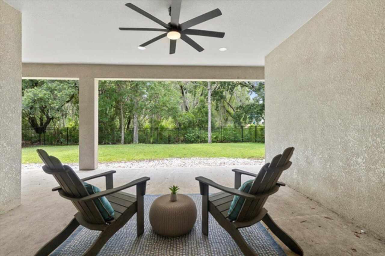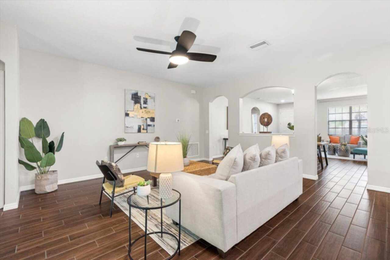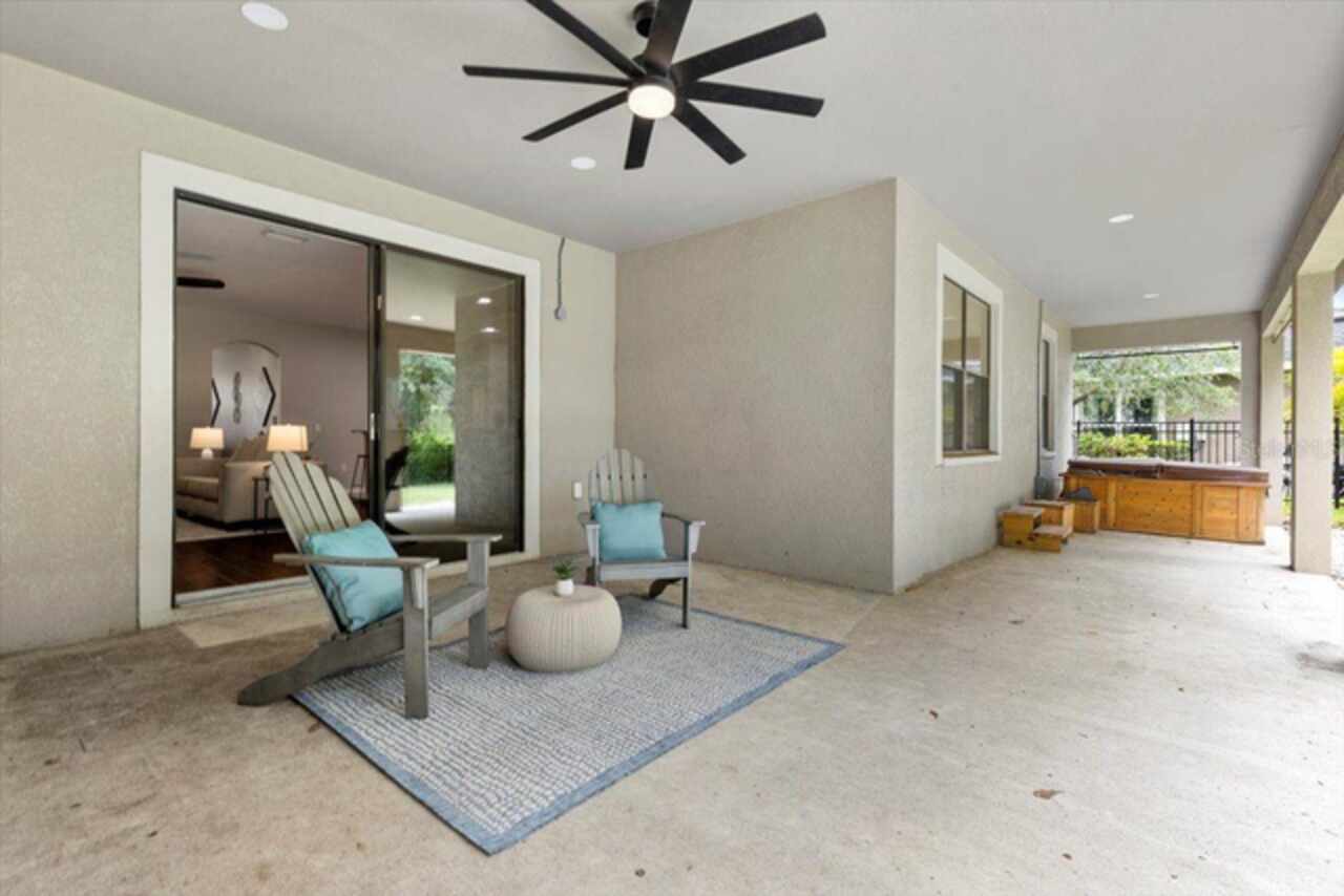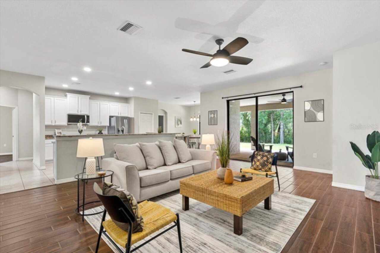 One or more photo(s) has been virtually staged. Poised on a lush corner conservation lot in the prestigious guard-gated community of Grand Hampton, this meticulously maintained 4-bedroom + office, 3-bath, 3-car garage residence blends thoughtful design with modern upgrades and captivating curb appeal. Located within walking distance to the park and basketball court, this home offers both luxury and convenience. A new roof (2025) and exterior paint (2021) ensure lasting value, while the surrounding landscape—featuring swaying palm trees and vibrant red bark mulch—sets a tone of tropical sophistication. Step inside and instantly feel the airy openness created by cascading natural light and expansive wood-planked tile flooring that flows through all the main living spaces. The combined formal living and dining area makes an ideal setting for both upscale entertaining and quiet evenings at home. Just off the front living space is a private bedroom with carpet flooring, a walk-in closet, and access to a full guest bath—ideal for guests or multigenerational living. Continue through to the spacious secondary living room, where stacker glass sliders seamlessly connect indoor and outdoor living. Overlooking the conservation area, this space is framed by modern light fixtures and generous natural light. The primary suite is a serene retreat, featuring tray ceilings, stylish finishes, and tranquil views. The spa-like primary bath offers dual vanities, a garden soaking tub, glass walk-in shower, and a custom-built walk-in closet designed for functionality and flair. At the heart of the home, the kitchen is outfitted with solid wood cabinetry, granite countertops, stainless steel appliances including a gas range, recessed lighting, and thoughtful features like a lazy Susan and breakfast bar seating. The adjacent dinette offers serene views of the backyard and conservation beyond. The private home office, located just off the kitchen, boasts laminate flooring and inspiring views—perfect for remote work or creative pursuits. Also off the kitchen, you’ll find the laundry room, third full bathroom, and two additional bedrooms with luxury vinyl flooring and ample closet space. Step outside to your slice of Florida paradise—an oversized covered lanai perfect for entertaining, relaxing, or transforming into your own outdoor oasis. With no rear neighbors, a natural backdrop, a fully fenced-in backyard, this outdoor space invites you to unwind and enjoy Florida’s year-round sunshine. Notable upgrades include: Owned Solar Panels, Rinnai Tankless Water Heater, 2024 HVAC, and water softener (2 years old). This home is located within the highly sought-after, resort-style community of Grand Hampton. The community provides a wealth of amenities, including a 24-hour manned gate, state-of-the-art clubhouse, fitness center, playgrounds, lake access, and heated pools—including a lagoon-style pool with slide and a lap pool. Additional recreational features include tennis courts and basketball courts. Conveniently located near major highways I-75 and I-275, this property is just a short drive to local attractions such as Advent Hospital, PHSC, AdventHealth Center Ice, The Shops at Wiregrass, and Tampa Premium Outlets. Don’t miss your chance to own this exceptional home. Schedule your private showing today! For a virtual tour, click the provided link and experience the beauty of this remarkable property.