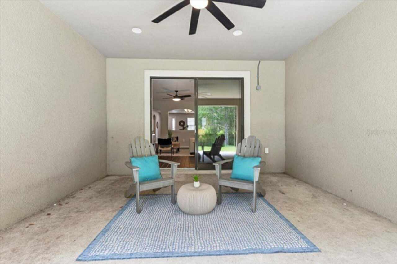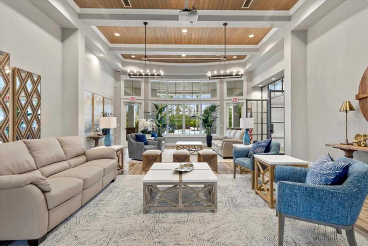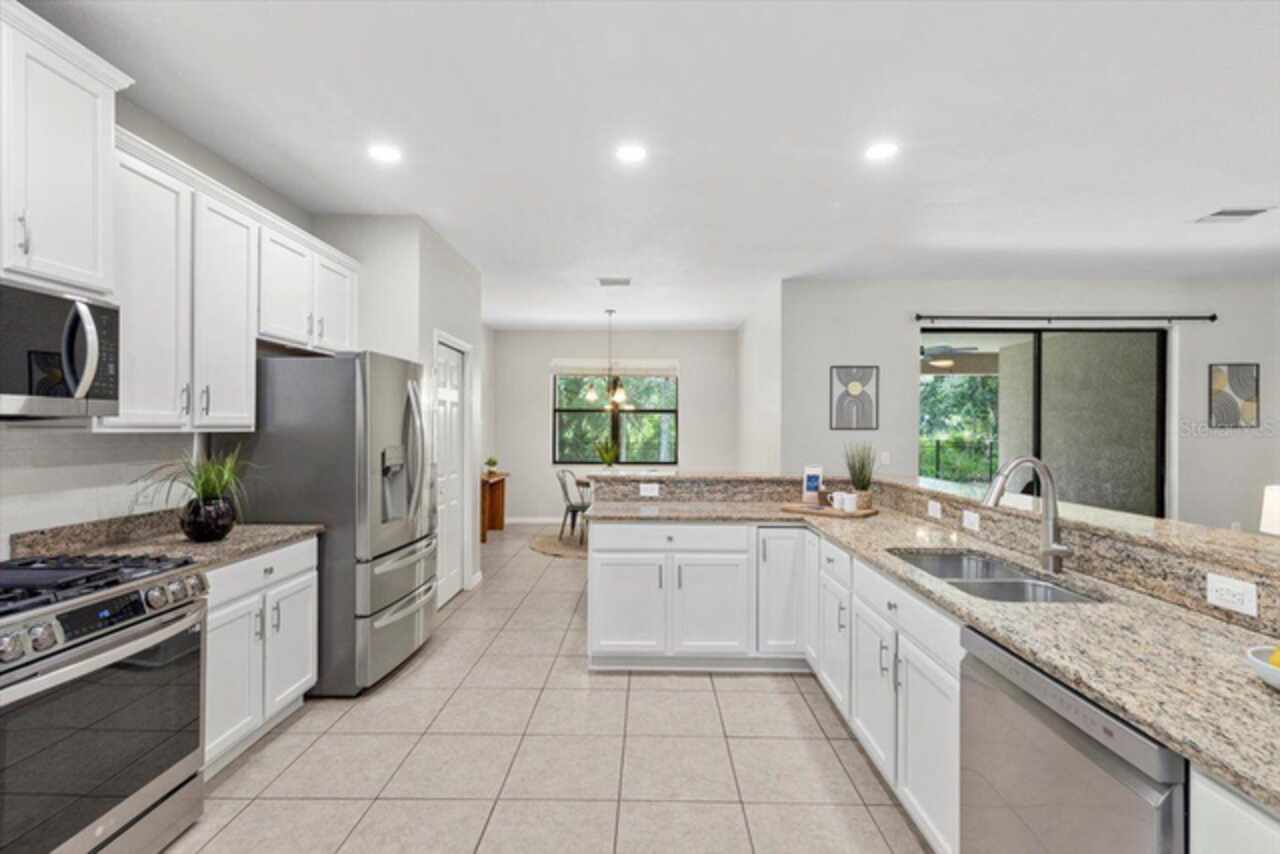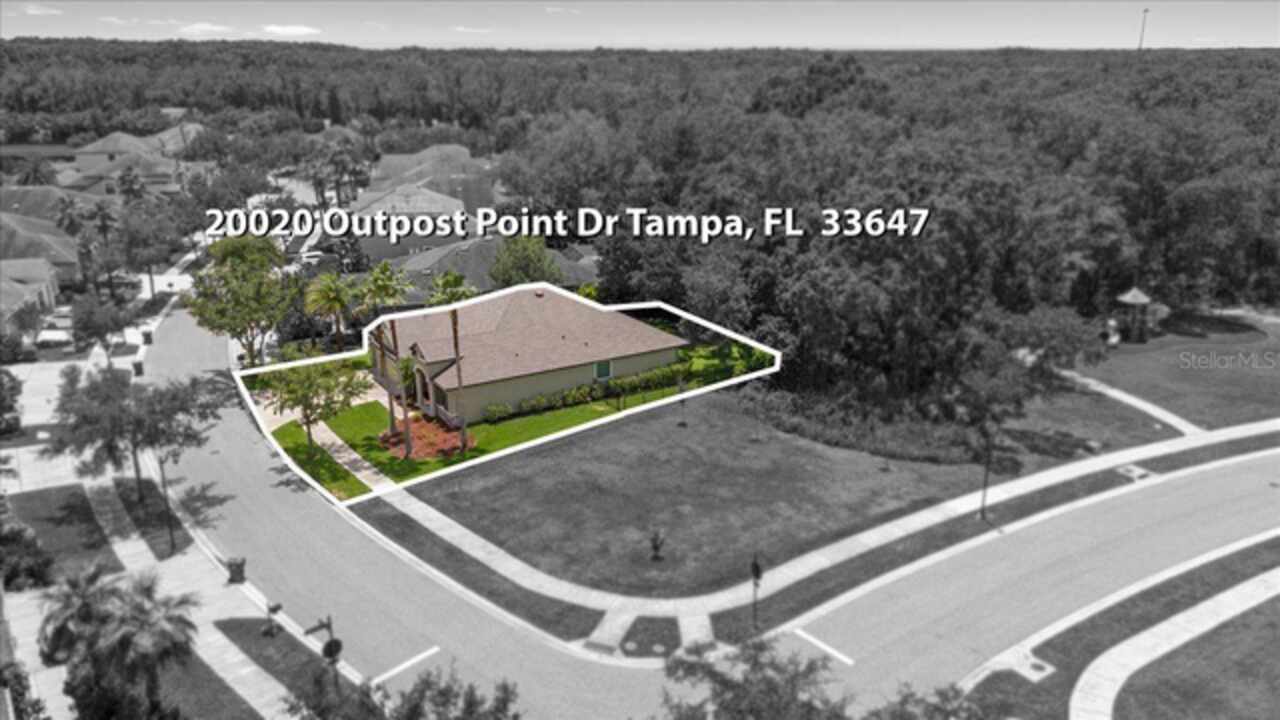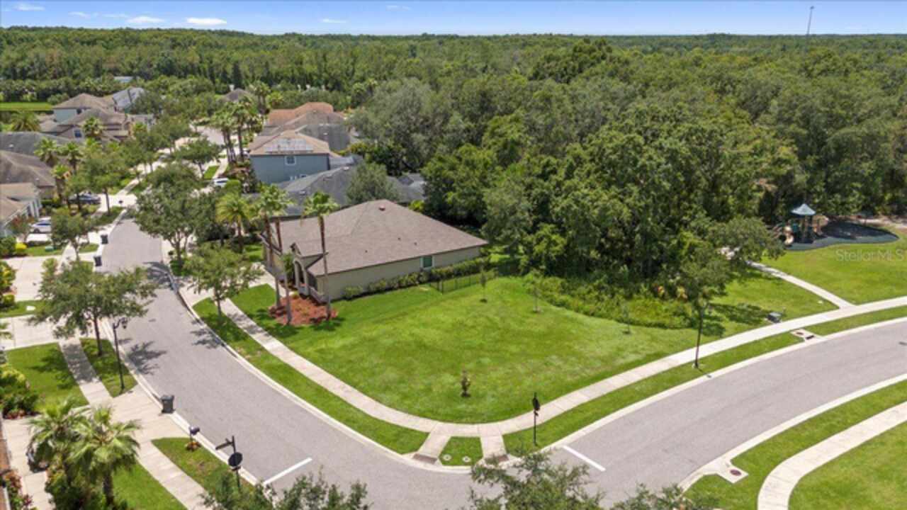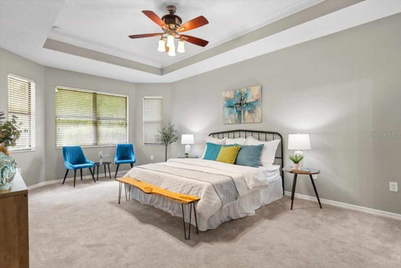 One or more photo(s) has been virtually staged. Poised on a lush corner conservation lot in the prestigious guard-gated community of Grand Hampton, this meticulously maintained 4-bedroom + office, 3-bath, 3-car garage residence blends thoughtful design with modern upgrades and captivating curb appeal. Located within walking distance to the park and basketball court, this home offers both luxury and convenience. A new roof (2025) and exterior paint (2021) ensure lasting value, while the surrounding landscape—featuring swaying palm trees and vibrant red bark mulch—sets a tone of tropical sophistication. Step inside and instantly feel the airy openness created by cascading natural light and expansive wood-planked tile flooring that flows through all the main living spaces. The combined formal living and dining area makes an ideal setting for both upscale entertaining and quiet evenings at home. Just off the front living space is a private bedroom with carpet flooring, a walk-in closet, and access to a full guest bath—ideal for guests or multigenerational living. Continue through to the spacious secondary living room, where stacker glass sliders seamlessly connect indoor and outdoor living. Overlooking the conservation area, this space is framed by modern light fixtures and generous natural light. The primary suite is a serene retreat, featuring tray ceilings, stylish finishes, and tranquil views. The spa-like primary bath offers dual vanities, a garden soaking tub, glass walk-in shower, and a custom-built walk-in closet designed for functionality and flair. At the heart of the home, the kitchen is outfitted with solid wood cabinetry, granite countertops, stainless steel appliances including a gas range, recessed lighting, and thoughtful features like a lazy Susan and breakfast bar seating. The adjacent dinette offers serene views of the backyard and conservation beyond. The private home office, located just off the kitchen, boasts laminate flooring and inspiring views—perfect for remote work or creative pursuits. Also off the kitchen, you’ll find the laundry room, third full bathroom, and two additional bedrooms with luxury vinyl flooring and ample closet space. Step outside to your slice of Florida paradise—an oversized covered lanai perfect for entertaining, relaxing, or transforming into your own outdoor oasis. With no rear neighbors, a natural backdrop, a fully fenced-in backyard, this outdoor space invites you to unwind and enjoy Florida’s year-round sunshine. Notable upgrades include: Owned Solar Panels, Rinnai Tankless Water Heater, 2024 HVAC, and water softener (2 years old). This home is located within the highly sought-after, resort-style community of Grand Hampton. The community provides a wealth of amenities, including a 24-hour manned gate, state-of-the-art clubhouse, fitness center, playgrounds, lake access, and heated pools—including a lagoon-style pool with slide and a lap pool. Additional recreational features include tennis courts and basketball courts. Conveniently located near major highways I-75 and I-275, this property is just a short drive to local attractions such as Advent Hospital, PHSC, AdventHealth Center Ice, The Shops at Wiregrass, and Tampa Premium Outlets. Don’t miss your chance to own this exceptional home. Schedule your private showing today! For a virtual tour, click the provided link and experience the beauty of this remarkable property.