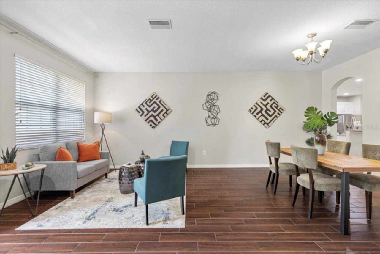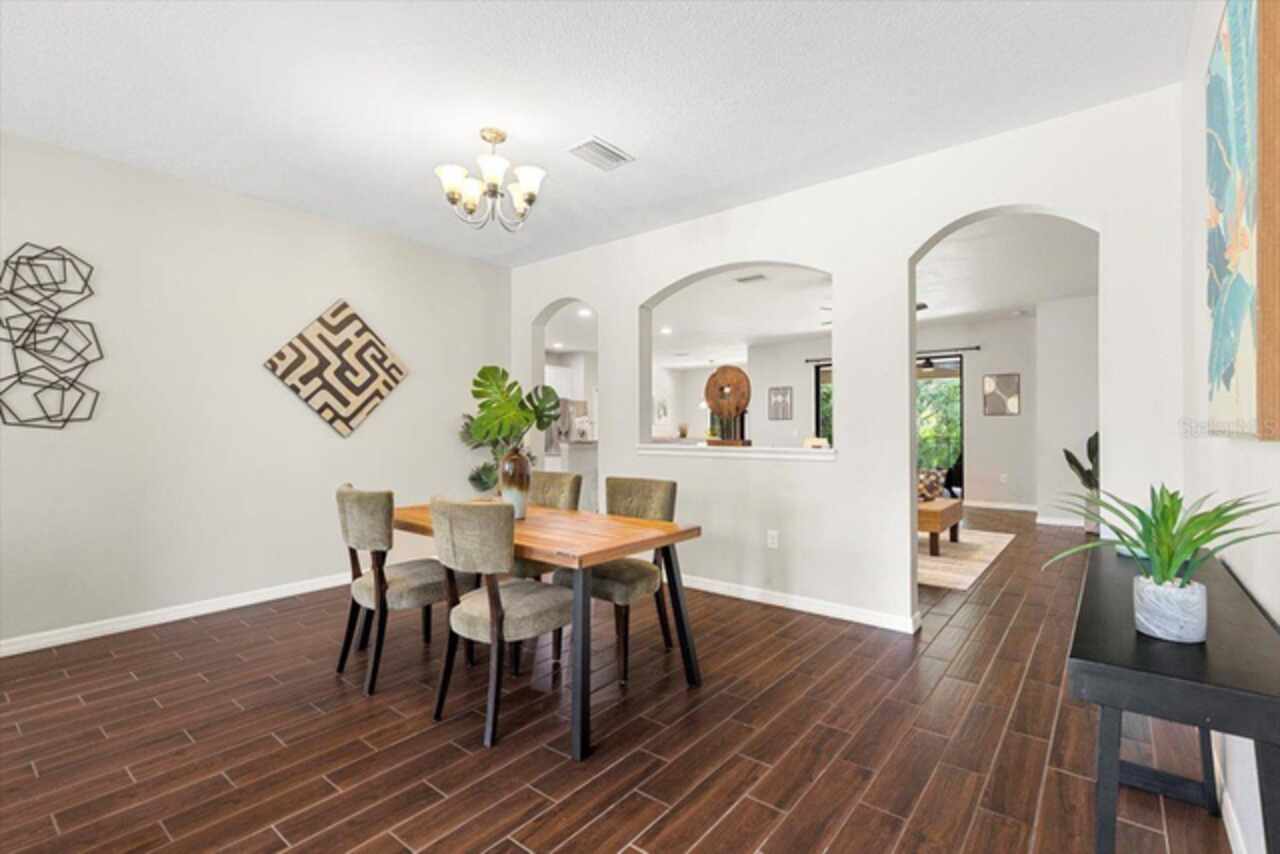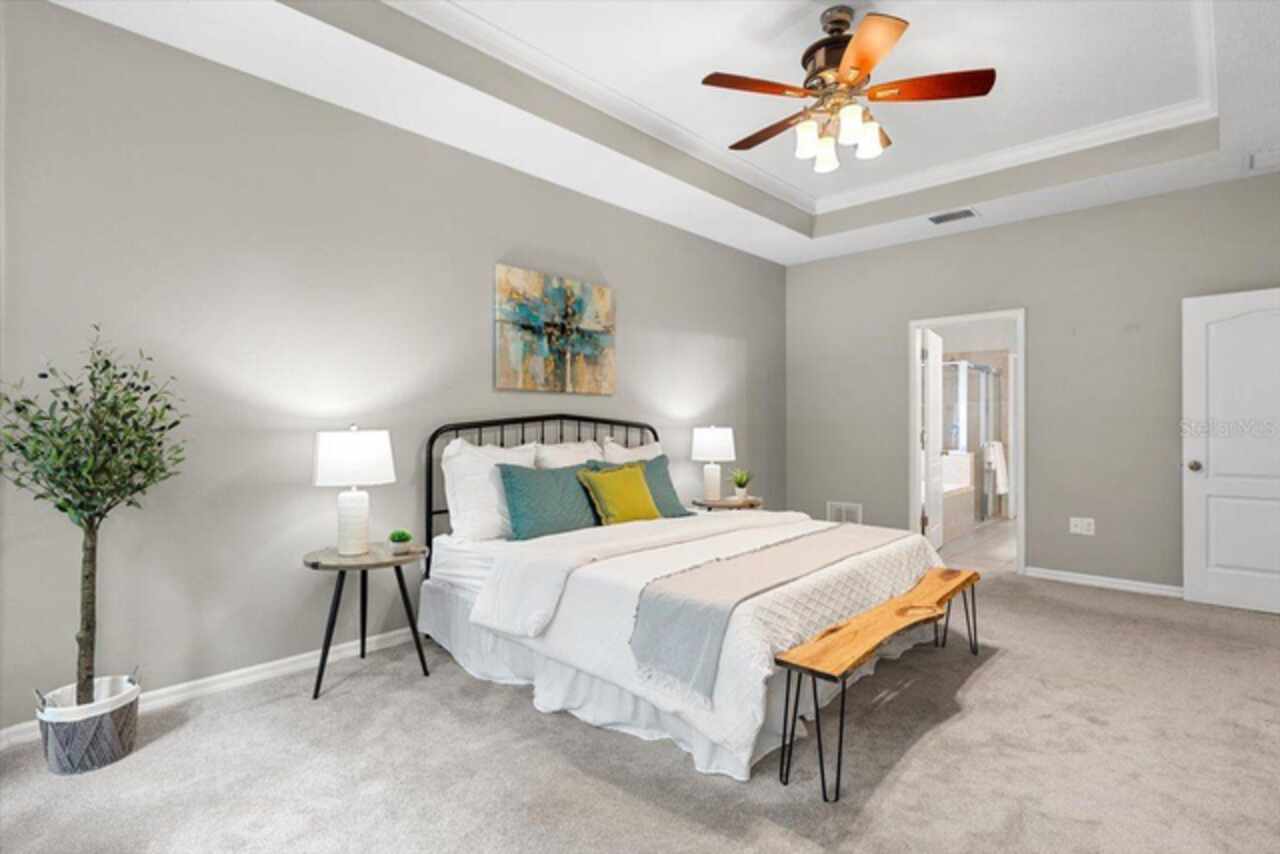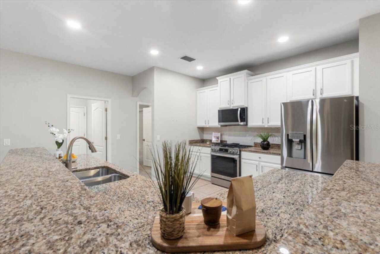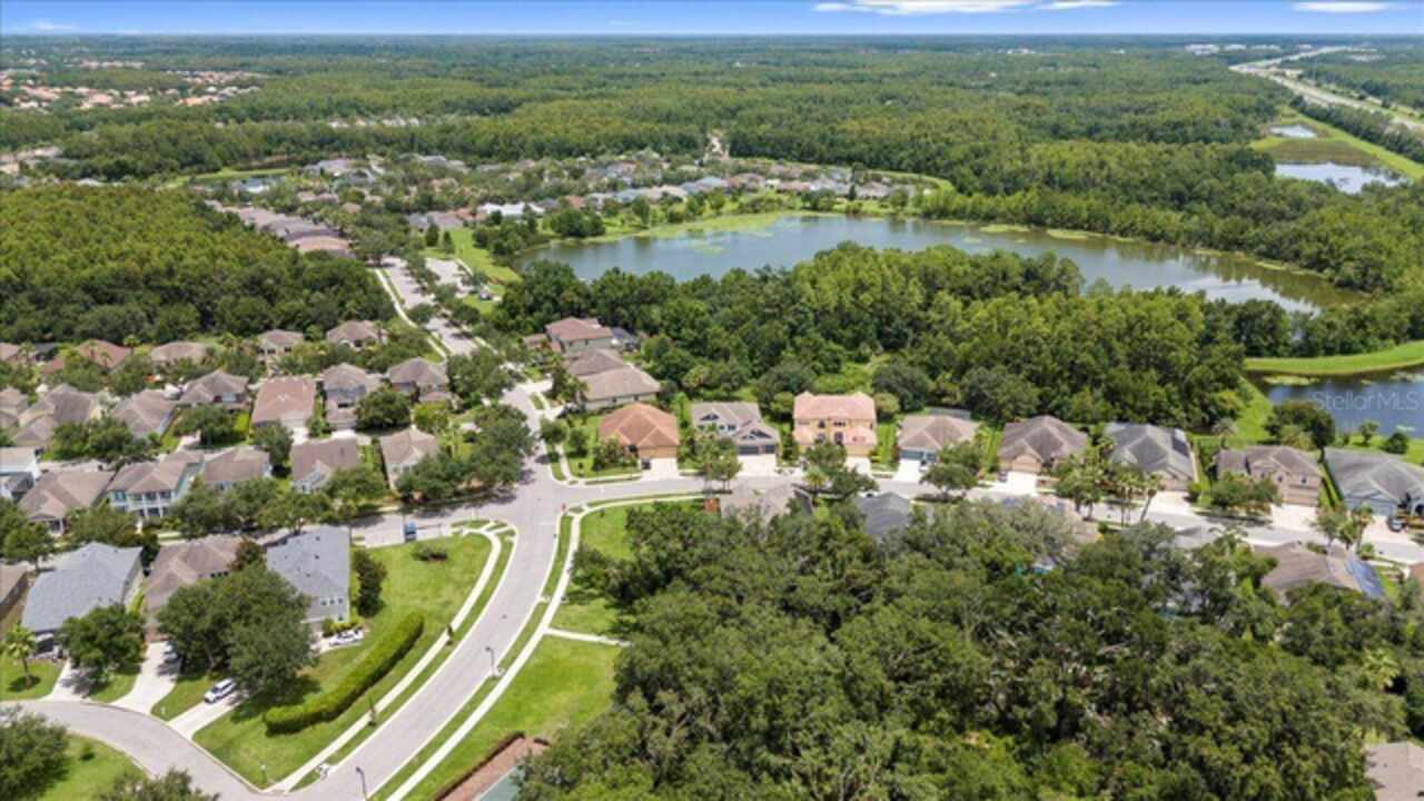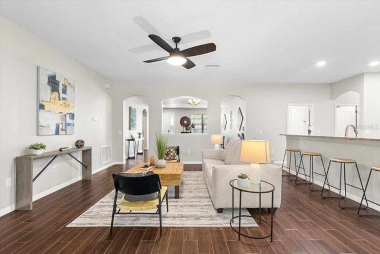 One or more photo(s) has been virtually staged. Poised on a lush corner conservation lot in the prestigious guard-gated community of Grand Hampton, this meticulously maintained 4-bedroom + office, 3-bath, 3-car garage residence blends thoughtful design with modern upgrades and captivating curb appeal. Located within walking distance to the park and basketball court, this home offers both luxury and convenience. A new roof (2025) and exterior paint (2021) ensure lasting value, while the surrounding landscape—featuring swaying palm trees and vibrant red bark mulch—sets a tone of tropical sophistication. Step inside and instantly feel the airy openness created by cascading natural light and expansive wood-planked tile flooring that flows through all the main living spaces. The combined formal living and dining area makes an ideal setting for both upscale entertaining and quiet evenings at home. Just off the front living space is a private bedroom with carpet flooring, a walk-in closet, and access to a full guest bath—ideal for guests or multigenerational living. Continue through to the spacious secondary living room, where stacker glass sliders seamlessly connect indoor and outdoor living. Overlooking the conservation area, this space is framed by modern light fixtures and generous natural light. The primary suite is a serene retreat, featuring tray ceilings, stylish finishes, and tranquil views. The spa-like primary bath offers dual vanities, a garden soaking tub, glass walk-in shower, and a custom-built walk-in closet designed for functionality and flair. At the heart of the home, the kitchen is outfitted with solid wood cabinetry, granite countertops, stainless steel appliances including a gas range, recessed lighting, and thoughtful features like a lazy Susan and breakfast bar seating. The adjacent dinette offers serene views of the backyard and conservation beyond. The private home office, located just off the kitchen, boasts laminate flooring and inspiring views—perfect for remote work or creative pursuits. Also off the kitchen, you’ll find the laundry room, third full bathroom, and two additional bedrooms with luxury vinyl flooring and ample closet space. Step outside to your slice of Florida paradise—an oversized covered lanai perfect for entertaining, relaxing, or transforming into your own outdoor oasis. With no rear neighbors, a natural backdrop, a fully fenced-in backyard, this outdoor space invites you to unwind and enjoy Florida’s year-round sunshine. Notable upgrades include: Owned Solar Panels, Rinnai Tankless Water Heater, 2024 HVAC, and water softener (2 years old). This home is located within the highly sought-after, resort-style community of Grand Hampton. The community provides a wealth of amenities, including a 24-hour manned gate, state-of-the-art clubhouse, fitness center, playgrounds, lake access, and heated pools—including a lagoon-style pool with slide and a lap pool. Additional recreational features include tennis courts and basketball courts. Conveniently located near major highways I-75 and I-275, this property is just a short drive to local attractions such as Advent Hospital, PHSC, AdventHealth Center Ice, The Shops at Wiregrass, and Tampa Premium Outlets. Don’t miss your chance to own this exceptional home. Schedule your private showing today! For a virtual tour, click the provided link and experience the beauty of this remarkable property.