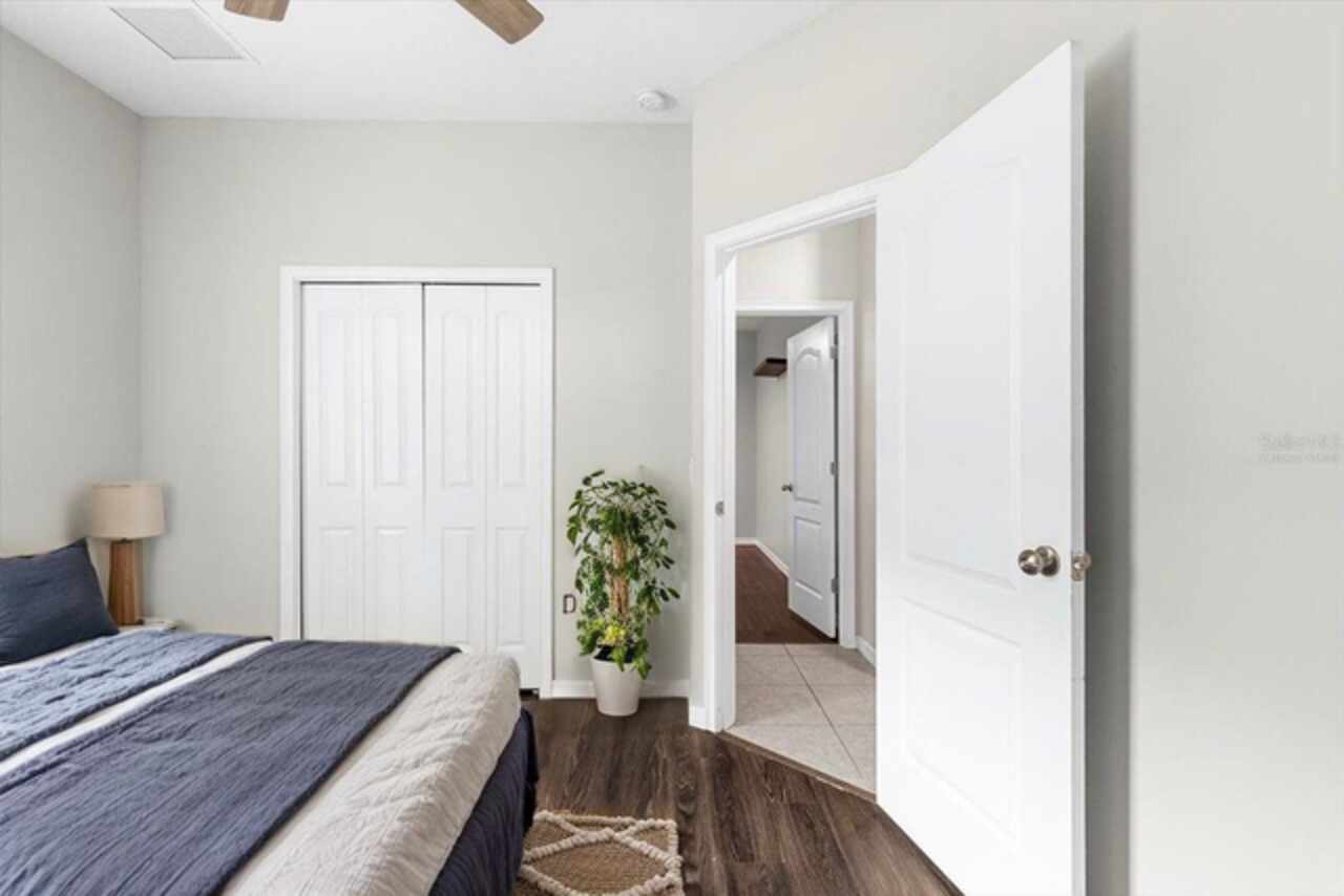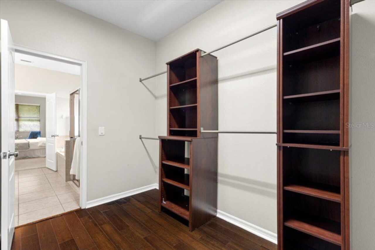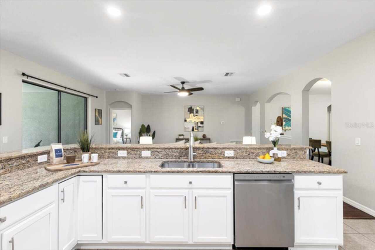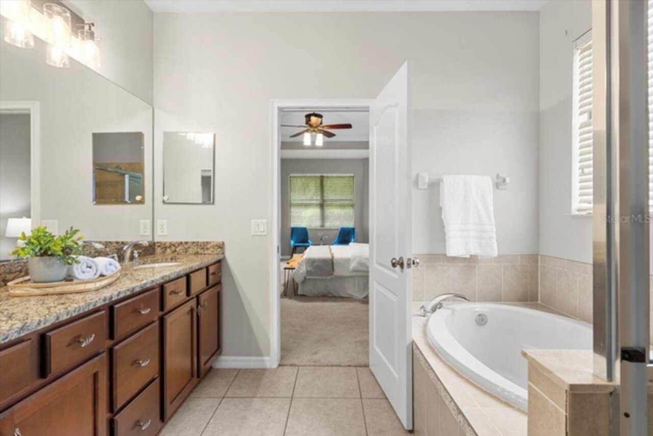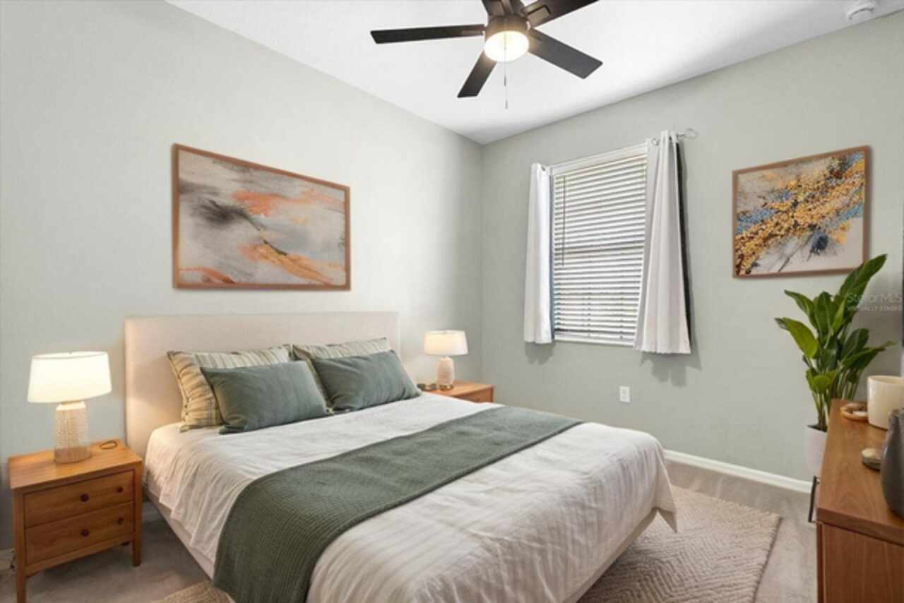 One or more photo(s) has been virtually staged. Poised on a lush corner conservation lot in the prestigious guard-gated community of Grand Hampton, this meticulously maintained 4-bedroom + office, 3-bath, 3-car garage residence blends thoughtful design with modern upgrades and captivating curb appeal. Located within walking distance to the park and basketball court, this home offers both luxury and convenience. A new roof (2025) and exterior paint (2021) ensure lasting value, while the surrounding landscape—featuring swaying palm trees and vibrant red bark mulch—sets a tone of tropical sophistication. Step inside and instantly feel the airy openness created by cascading natural light and expansive wood-planked tile flooring that flows through all the main living spaces. The combined formal living and dining area makes an ideal setting for both upscale entertaining and quiet evenings at home. Just off the front living space is a private bedroom with carpet flooring, a walk-in closet, and access to a full guest bath—ideal for guests or multigenerational living. Continue through to the spacious secondary living room, where stacker glass sliders seamlessly connect indoor and outdoor living. Overlooking the conservation area, this space is framed by modern light fixtures and generous natural light. The primary suite is a serene retreat, featuring tray ceilings, stylish finishes, and tranquil views. The spa-like primary bath offers dual vanities, a garden soaking tub, glass walk-in shower, and a custom-built walk-in closet designed for functionality and flair. At the heart of the home, the kitchen is outfitted with solid wood cabinetry, granite countertops, stainless steel appliances including a gas range, recessed lighting, and thoughtful features like a lazy Susan and breakfast bar seating. The adjacent dinette offers serene views of the backyard and conservation beyond. The private home office, located just off the kitchen, boasts laminate flooring and inspiring views—perfect for remote work or creative pursuits. Also off the kitchen, you’ll find the laundry room, third full bathroom, and two additional bedrooms with luxury vinyl flooring and ample closet space. Step outside to your slice of Florida paradise—an oversized covered lanai perfect for entertaining, relaxing, or transforming into your own outdoor oasis. With no rear neighbors, a natural backdrop, a fully fenced-in backyard, this outdoor space invites you to unwind and enjoy Florida’s year-round sunshine. Notable upgrades include: Owned Solar Panels, Rinnai Tankless Water Heater, 2024 HVAC, and water softener (2 years old). This home is located within the highly sought-after, resort-style community of Grand Hampton. The community provides a wealth of amenities, including a 24-hour manned gate, state-of-the-art clubhouse, fitness center, playgrounds, lake access, and heated pools—including a lagoon-style pool with slide and a lap pool. Additional recreational features include tennis courts and basketball courts. Conveniently located near major highways I-75 and I-275, this property is just a short drive to local attractions such as Advent Hospital, PHSC, AdventHealth Center Ice, The Shops at Wiregrass, and Tampa Premium Outlets. Don’t miss your chance to own this exceptional home. Schedule your private showing today! For a virtual tour, click the provided link and experience the beauty of this remarkable property.