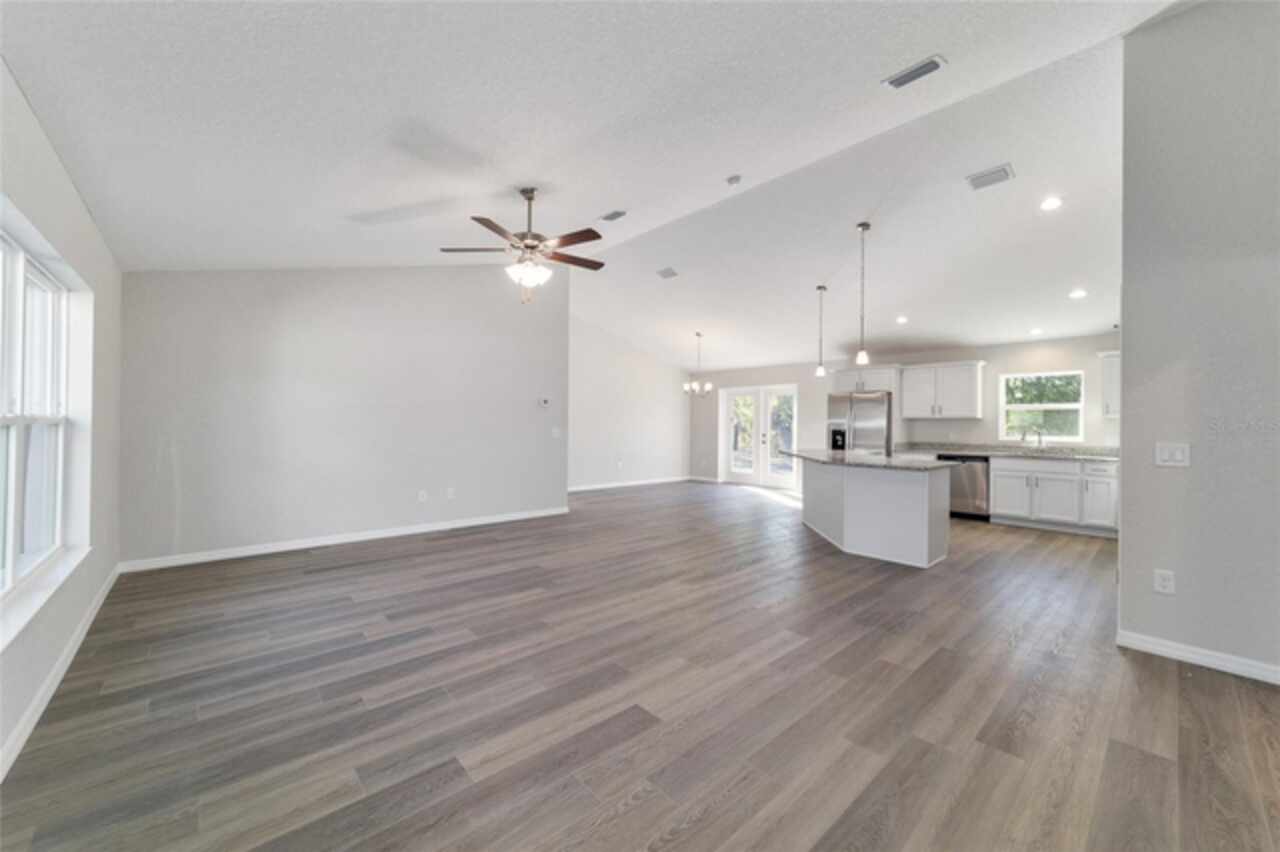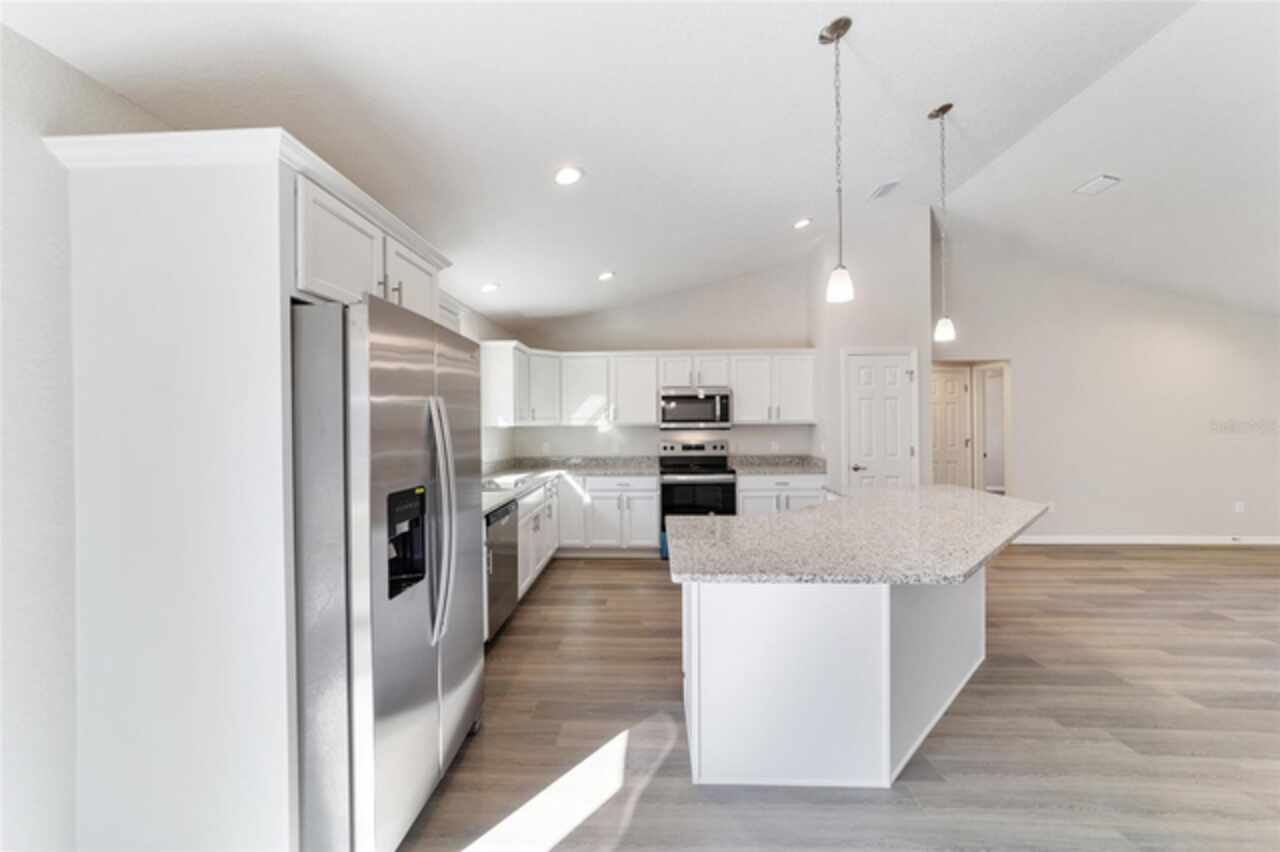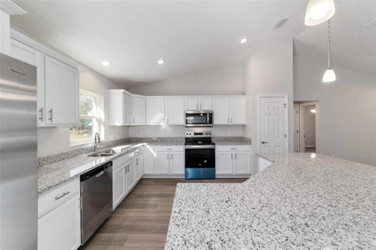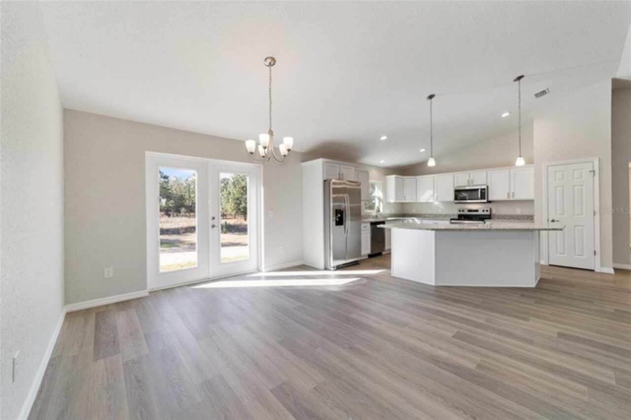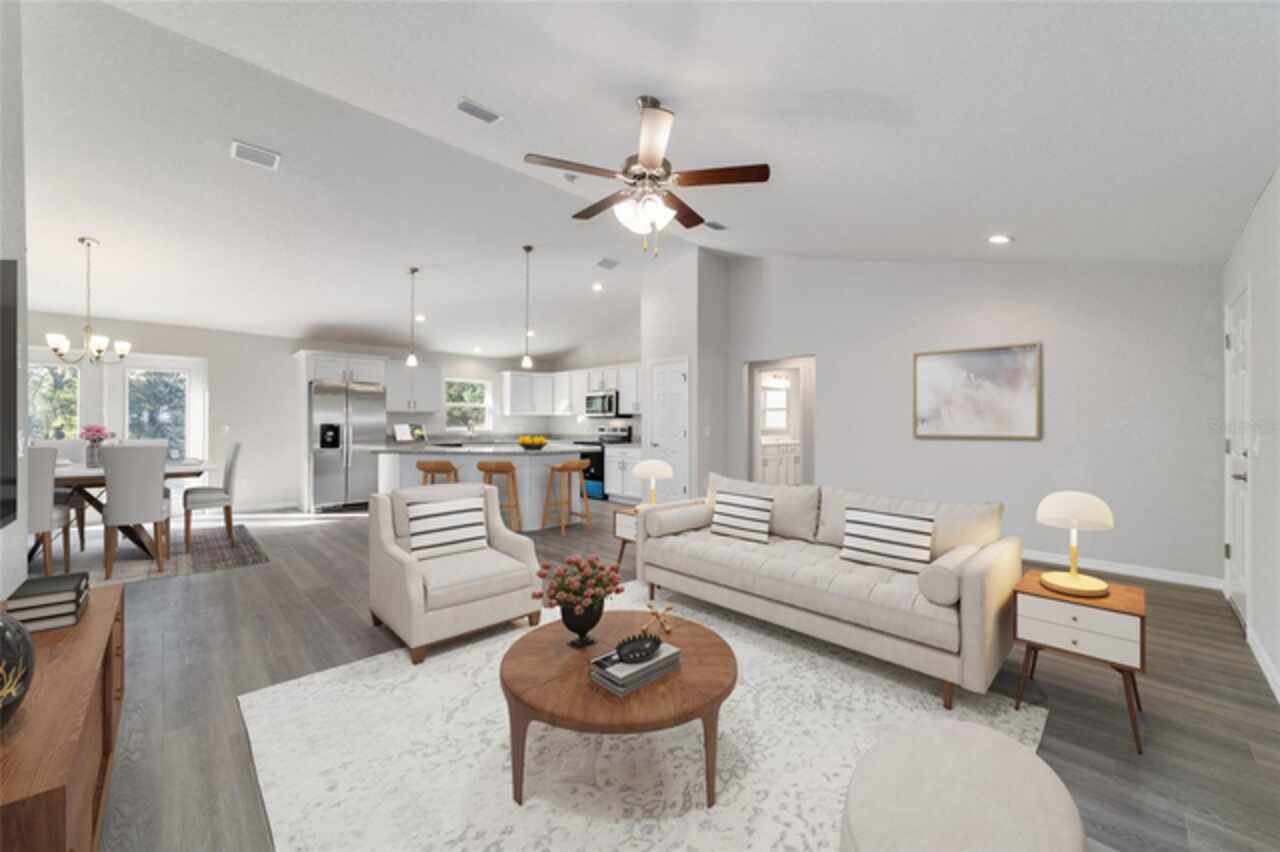 Spacious, brand new Alamo RaNae Model Home with Upscale FULLY COMPLETED AND READY FOR IMMEDIATE OCCUPANCY. Charming home, perfectly situated between on almost 1 acre in Dunnellon with easy access to Ocala. This peaceful residence is designed for comfort and functionality, offering a desirable open floor plan with cathedral ceilings and luxury vinyl plank flooring throughout. The heart of the home is the gorgeous kitchen, featuring a large center island, shaker cabinets with crown molding and with soft-close hinges, granite countertops, a hide-away trash bin, a pantry, and stainless steel appliances. The adjacent dining area, with French doors, overlooks the spacious backyard, perfect for pets or entertaining. The spacious living room accommodates large furniture and gatherings with ease. This home features a split-bedroom floor plan for added privacy. The master suite includes a walk-in closet, dual vanities with granite countertops, a tiled walk-in shower, and a water closet. The guest bedrooms are generously sized, while the guest bathroom offers dual vanities and a tiled shower/tub combo. Additional conveniences include multiple linen closets, a separate laundry room, and a two-car garage, AND and irrigation system. Located in a quiet neighborhood, just minutes from shopping, dining, and entertainment, this home is a rare opportunity! Floor plan displayed is our standard plan and garage orientation may vary on actual home. Interior and exterior colors, finishes, and garage orientation will vary for actual home. Information is deemed correct, but no guarantee made. Any dimensions listed are approximate.