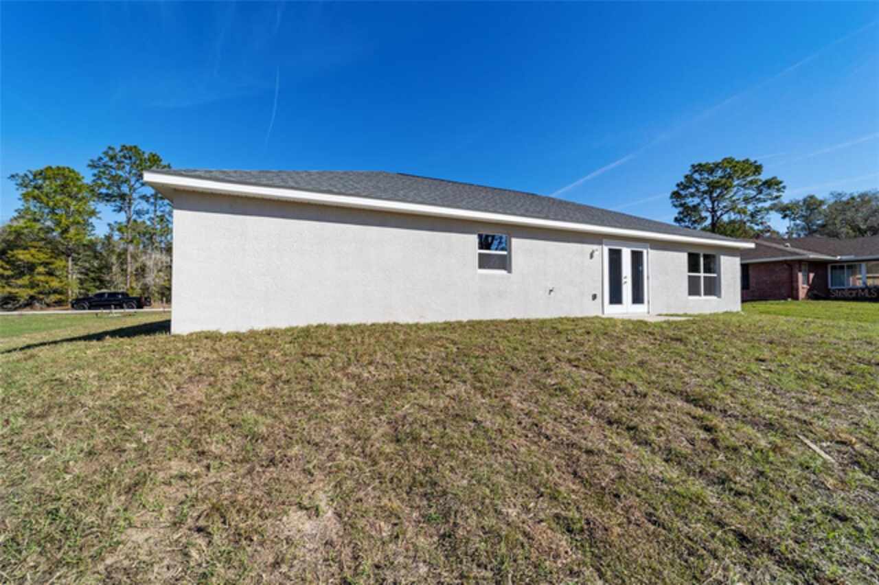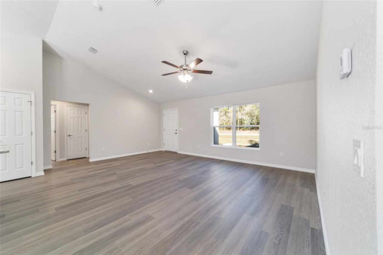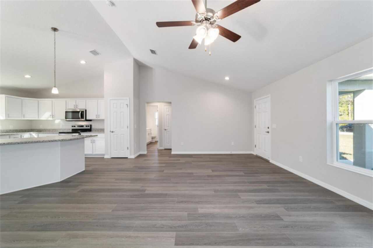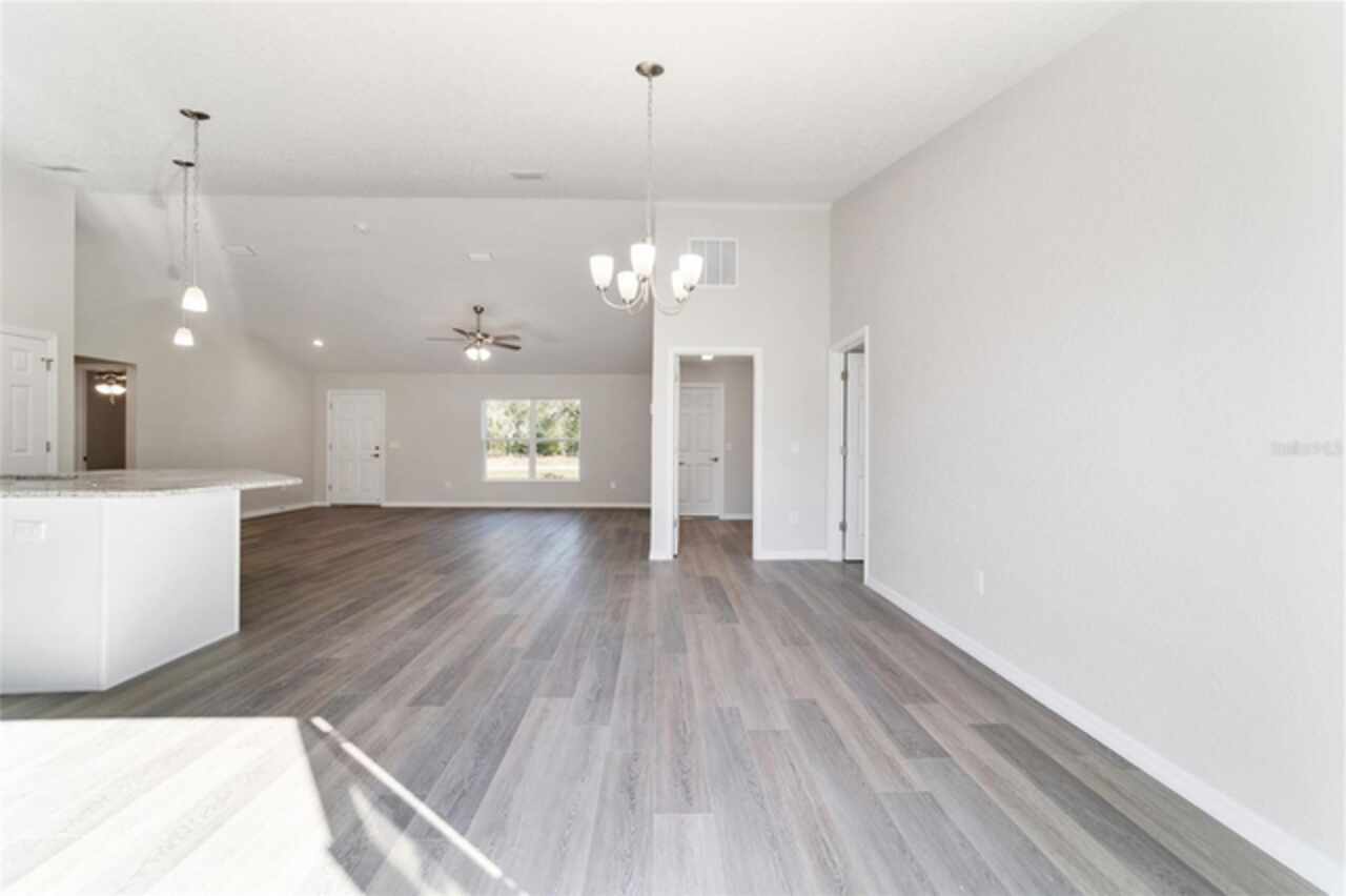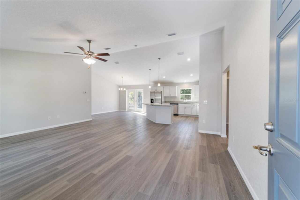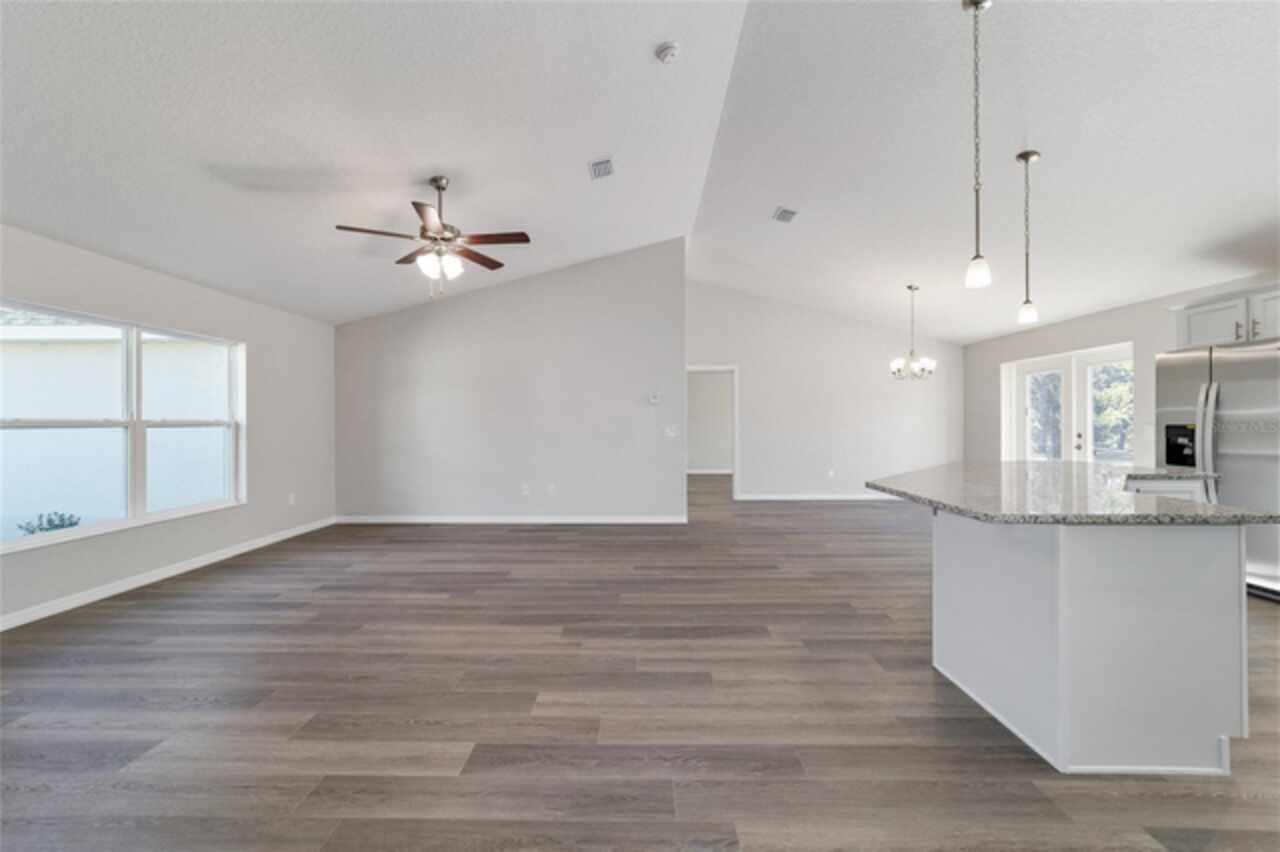 Spacious, brand new Alamo RaNae Model Home with Upscale FULLY COMPLETED AND READY FOR IMMEDIATE OCCUPANCY. Charming home, perfectly situated between on almost 1 acre in Dunnellon with easy access to Ocala. This peaceful residence is designed for comfort and functionality, offering a desirable open floor plan with cathedral ceilings and luxury vinyl plank flooring throughout. The heart of the home is the gorgeous kitchen, featuring a large center island, shaker cabinets with crown molding and with soft-close hinges, granite countertops, a hide-away trash bin, a pantry, and stainless steel appliances. The adjacent dining area, with French doors, overlooks the spacious backyard, perfect for pets or entertaining. The spacious living room accommodates large furniture and gatherings with ease. This home features a split-bedroom floor plan for added privacy. The master suite includes a walk-in closet, dual vanities with granite countertops, a tiled walk-in shower, and a water closet. The guest bedrooms are generously sized, while the guest bathroom offers dual vanities and a tiled shower/tub combo. Additional conveniences include multiple linen closets, a separate laundry room, and a two-car garage, AND and irrigation system. Located in a quiet neighborhood, just minutes from shopping, dining, and entertainment, this home is a rare opportunity! Floor plan displayed is our standard plan and garage orientation may vary on actual home. Interior and exterior colors, finishes, and garage orientation will vary for actual home. Information is deemed correct, but no guarantee made. Any dimensions listed are approximate.