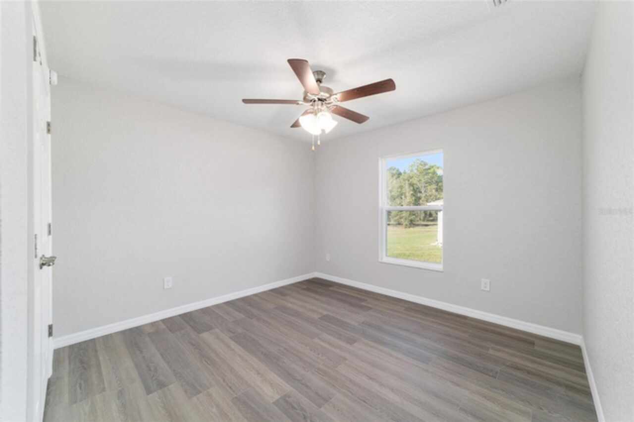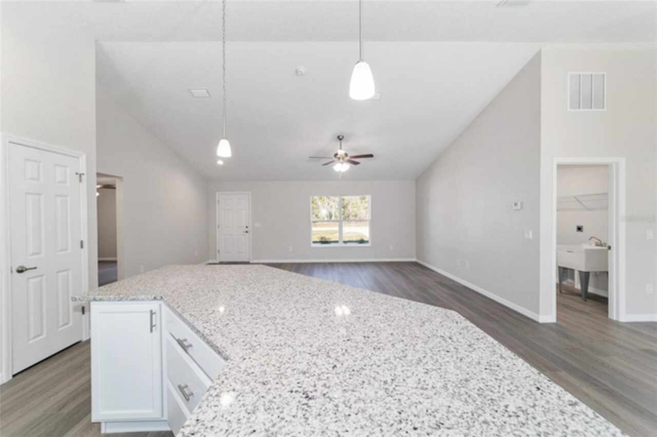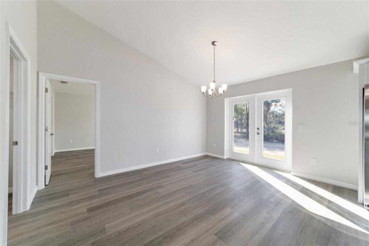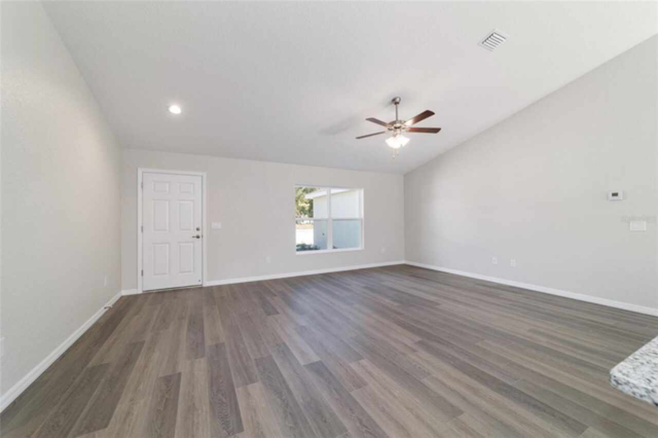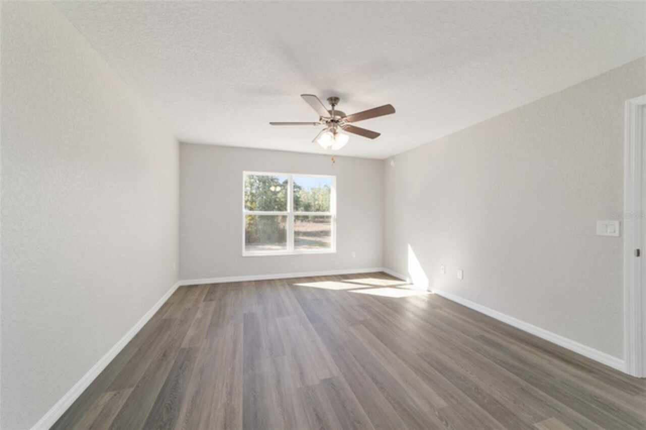 Spacious, brand new Alamo RaNae Model Home with Upscale FULLY COMPLETED AND READY FOR IMMEDIATE OCCUPANCY. Charming home, perfectly situated between on almost 1 acre in Dunnellon with easy access to Ocala. This peaceful residence is designed for comfort and functionality, offering a desirable open floor plan with cathedral ceilings and luxury vinyl plank flooring throughout. The heart of the home is the gorgeous kitchen, featuring a large center island, shaker cabinets with crown molding and with soft-close hinges, granite countertops, a hide-away trash bin, a pantry, and stainless steel appliances. The adjacent dining area, with French doors, overlooks the spacious backyard, perfect for pets or entertaining. The spacious living room accommodates large furniture and gatherings with ease. This home features a split-bedroom floor plan for added privacy. The master suite includes a walk-in closet, dual vanities with granite countertops, a tiled walk-in shower, and a water closet. The guest bedrooms are generously sized, while the guest bathroom offers dual vanities and a tiled shower/tub combo. Additional conveniences include multiple linen closets, a separate laundry room, and a two-car garage, AND and irrigation system. Located in a quiet neighborhood, just minutes from shopping, dining, and entertainment, this home is a rare opportunity! Floor plan displayed is our standard plan and garage orientation may vary on actual home. Interior and exterior colors, finishes, and garage orientation will vary for actual home. Information is deemed correct, but no guarantee made. Any dimensions listed are approximate.
