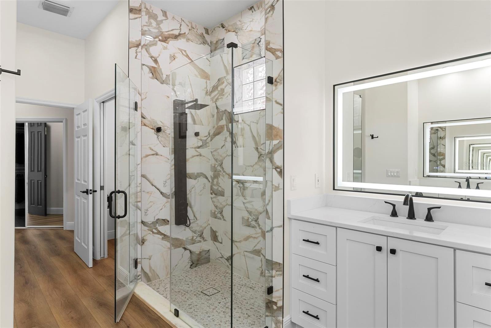 Lighting, Outdoor Shower, Sidewalk, Sliding Doors