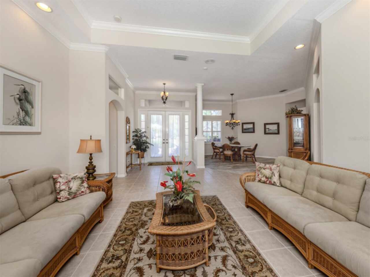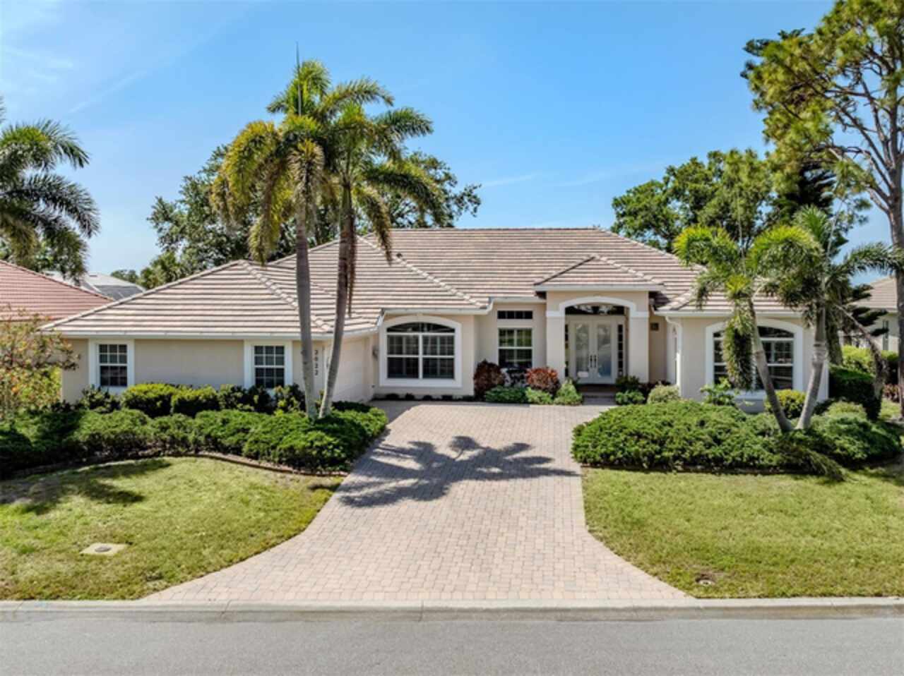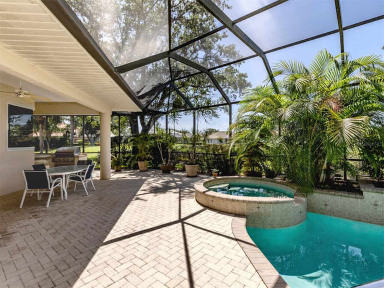 Experience luxury living in this beautiful custom home, positioned with serene views down the 11th fairway and a peaceful lake. Boasting spacious bedrooms, a private study, versatile bonus room and a split floor plan ensuring privacy, this residence offers comfort and flexibility. Notable features include volume and tray ceilings, crown molding, and a new roof in 2024. The well-designed kitchen is a chef's dream, featuring maple cabinetry, granite countertops, walk-in pantry, built-in desk and breakfast bar. It opens seamlessly to the breakfast nook with its aquarium windows and a welcoming family room, highlighted by sliding glass doors that lead out to the lanai. For formal occasions, enjoy the elegant dining room and living room with slider access to the lanai. Entertain effortlessly outdoors with a sparkling pool and spa, complemented by a fully equipped outdoor kitchen. The primary suite is set apart behind French doors and offers direct access to the lanai. Its luxurious bath includes a Roman shower, dual vanities, a garden tub and French doors opening to an attached bonus room. The driveway and lanai deck are beautifully finished with pavers for added curb appeal. In the gated community of Calusa Lakes, this home offers access to tennis courts, social activities, and is just minutes from the beach. Golf membership is optional, adding flexibility to your lifestyle.