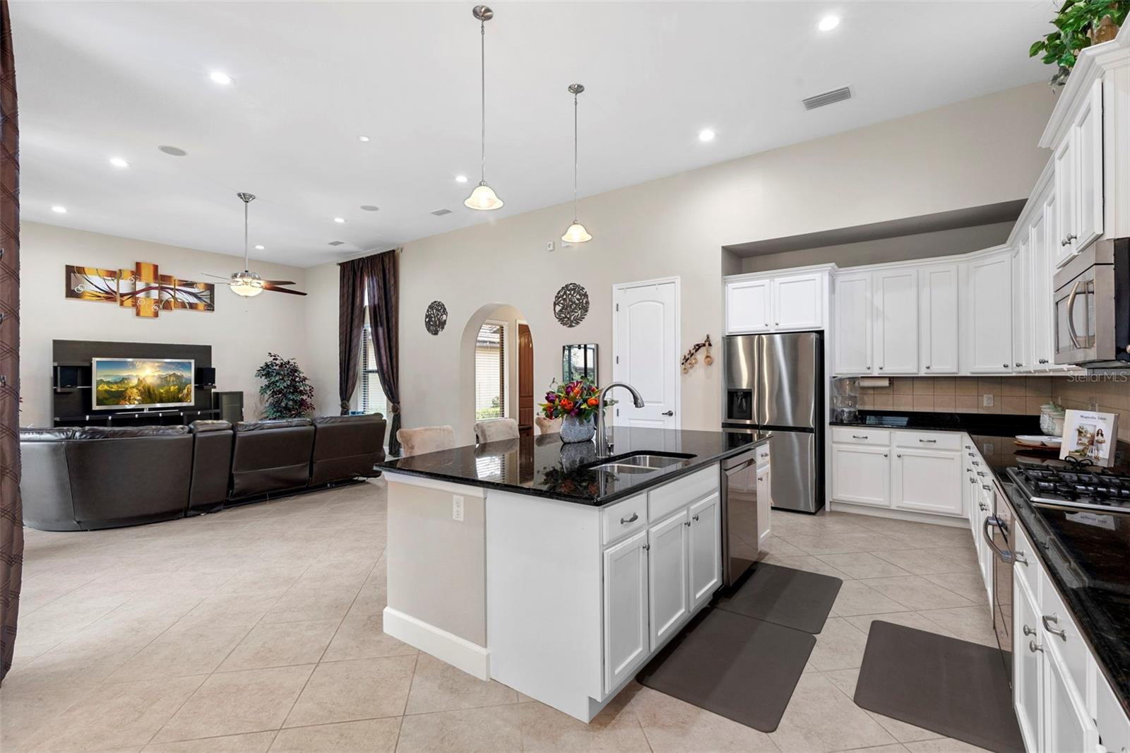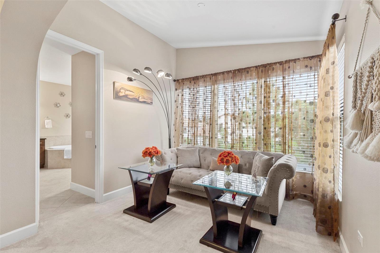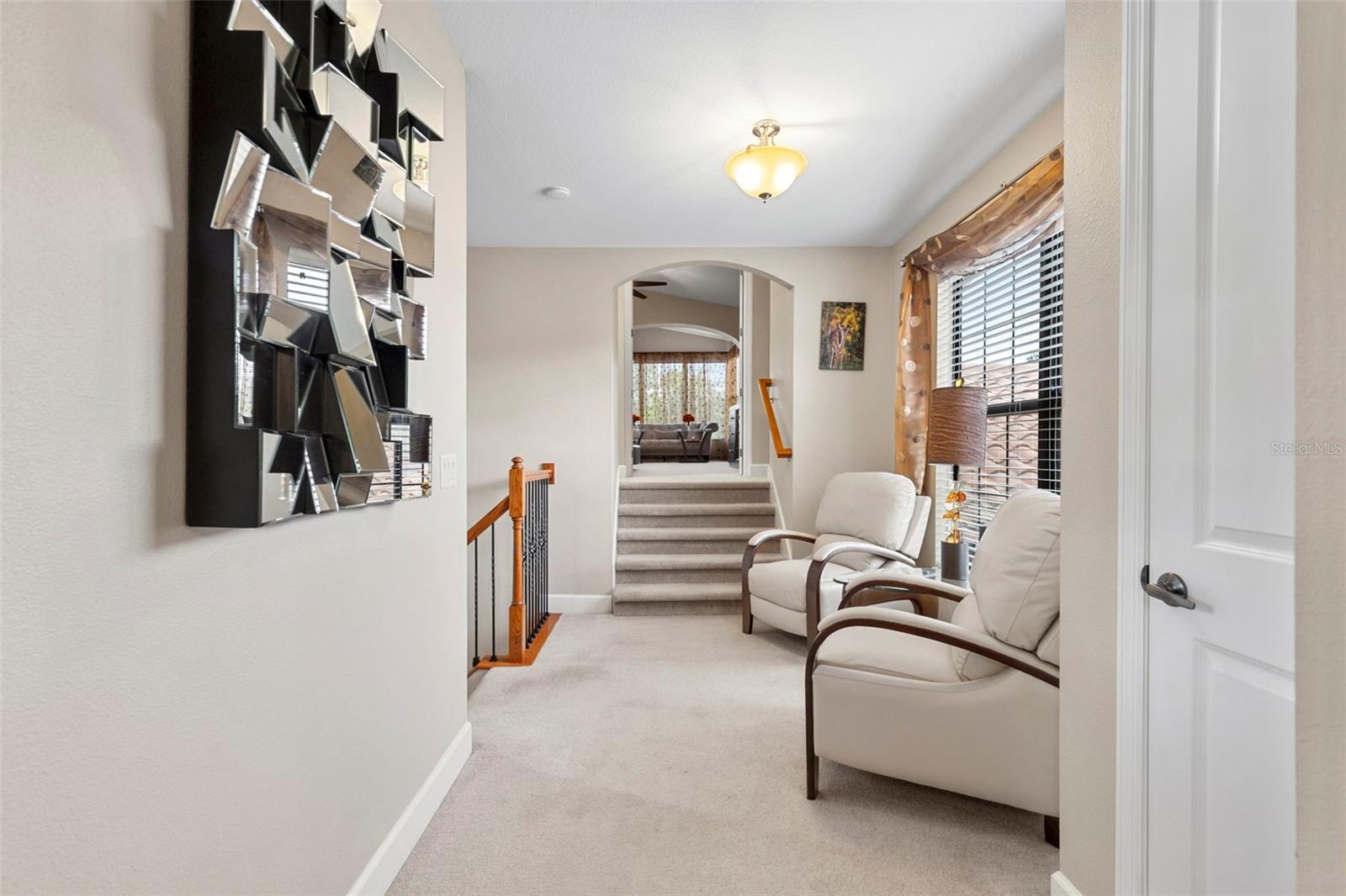 This stunning Mercedes-built two-story residence in the sought-after community of Grand Hampton offers 4 bedrooms plus a bonus room, 3 full bathrooms, 1 half bathroom, and 3, 251 square feet of living space, complete with a 2-car tandem garage. From the moment you arrive, the curb appeal captivates with its covered balcony, contemporary architectural design, and lush landscaping framing the walkway to the covered entryway and double wood doors. Step inside, where natural light cascades into the grand foyer. Just off the entry, you’ll find a generously sized under-the-stairs storage closet, a custom storage area with granite countertops and cabinetry, and a stylish half bath. Adjacent is a large bonus room, ideal for a home office, media room, or play space. Continuing through the home, the living room impresses with soaring 14-foot ceilings, recessed lighting, and triple glass sliding doors that frame views of your outdoor oasis. The open floor plan flows seamlessly into the chef’s kitchen, thoughtfully appointed with white solid wood cabinetry, granite countertops, a large cooking island with seating, stainless steel appliances, a gas range, modern lighting, and a spacious closet pantry. Just off the kitchen, the dining area enjoys serene views of the outdoor living space, completing the first floor. Ascending the wrought-iron baluster staircase, the second floor reveals a versatile loft area perfect for reading, writing, or relaxing. The first upstairs bedroom offers built-in closets and a private en-suite bathroom. Bedrooms two and three also feature built-in closets and share a well-appointed full bath. A conveniently located laundry room with cabinetry adds function and ease. The primary suite is a true retreat, highlighted by wall-to-wall windows that flood the space with natural light, soaring ceilings, and a cozy seating area. The spa-inspired primary bathroom includes recessed lighting, a garden tub, a walk-in glass shower, dual sink vanity with granite countertops, and modern fixtures, creating the perfect space to unwind. The outdoor living area is breathtaking. Step onto the screened, covered, paved lanai designed for year-round enjoyment, with privacy curtain and multiple seating areas overlooking the sparkling crystal-blue pool accented by a tranquil water feature. Whether hosting gatherings or enjoying quiet evenings, this private outdoor retreat is truly an extension of the home. Notable upgrades include Pool heater (2017), and recent kitchen appliance updates, with a new refrigerator and dishwasher installed in 2025 as well as a fan installed in the garage. The Grand Hampton community provides a wealth of amenities, including a 24-hour manned gate, state-of-the-art clubhouse, fitness center, playgrounds, lake access, and heated pools—including a lagoon-style pool with slide and a lap pool. Additional recreational features include tennis courts and basketball courts. Conveniently located near major highways I-75 and I-275, this property is just a short drive to local attractions such as Advent Hospital, PHSC, AdventHealth Center Ice, The Shops at Wiregrass, and Tampa Premium Outlets. Don’t miss the opportunity to own this exceptional home. Schedule your private showing today! For a virtual tour, click the provided link and experience the beauty of this remarkable property.