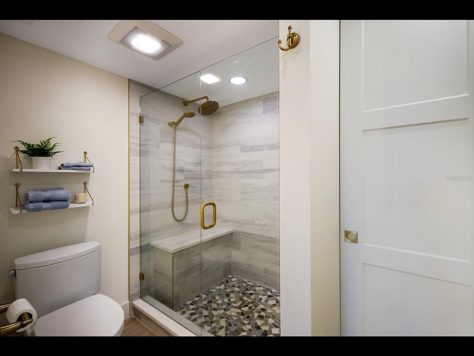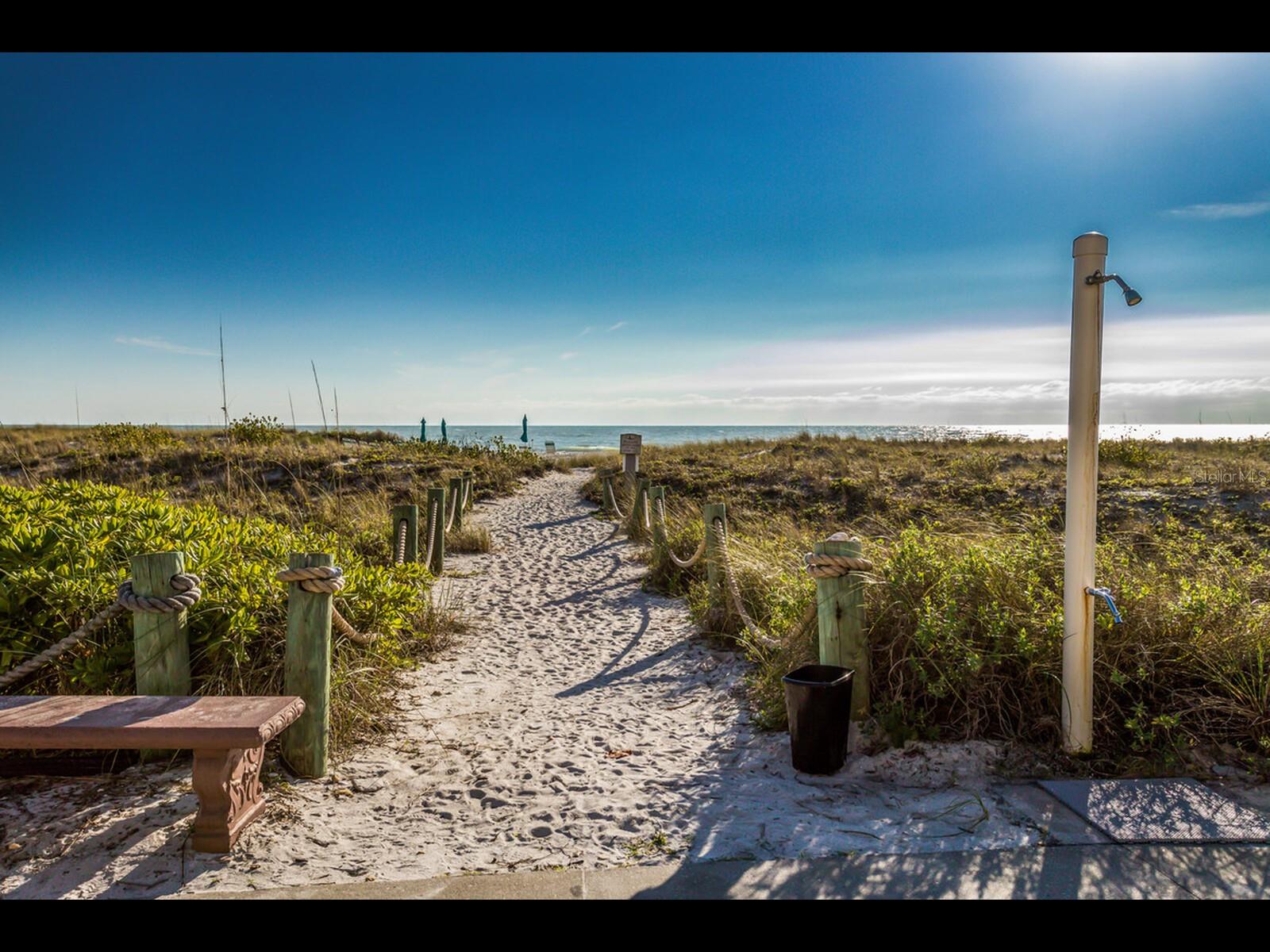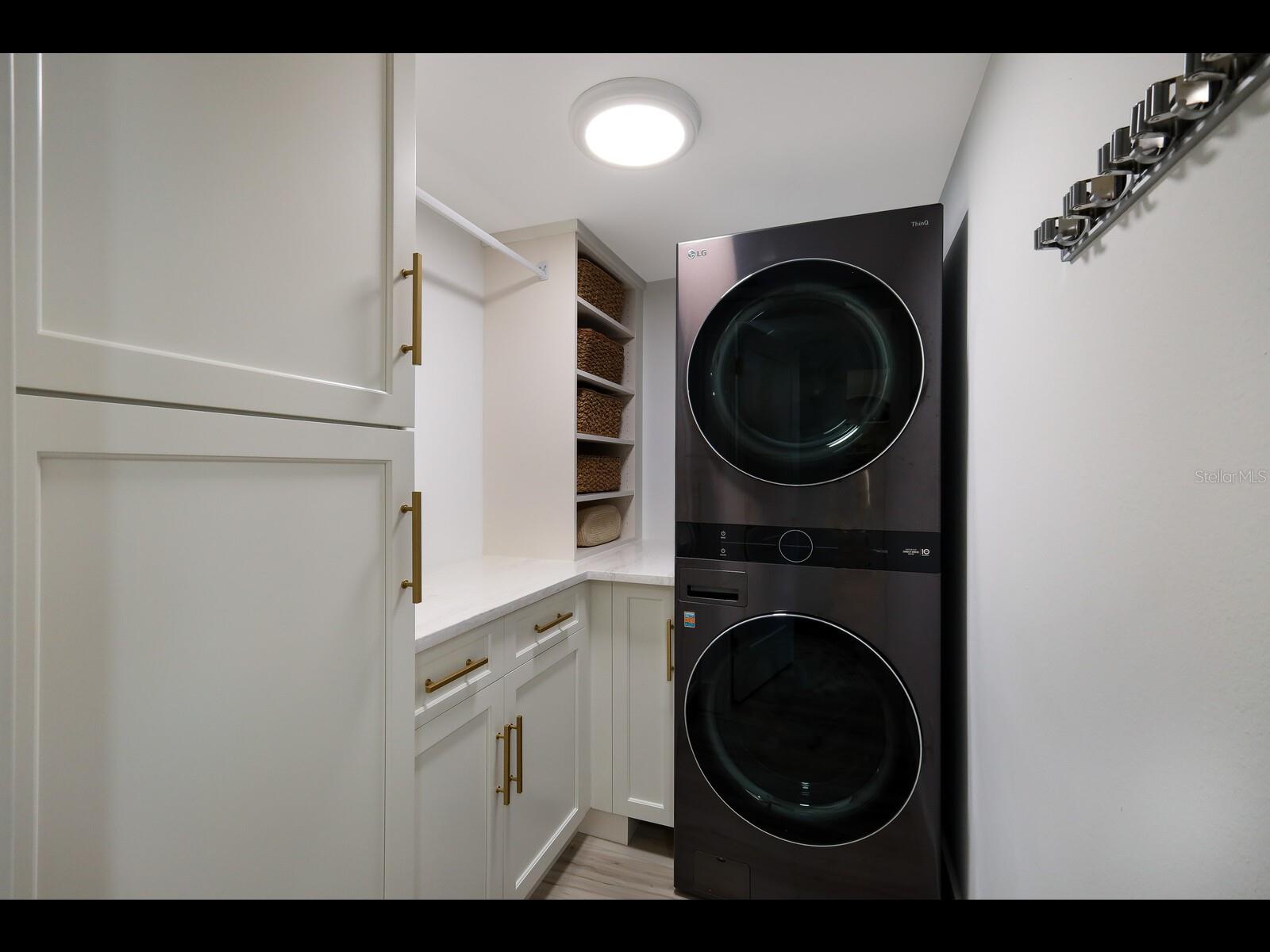 Fully RE-DESIGNED and RENOVATED 2-bedroom, 2-bath condo in Seaplace with PARTIAL GULF VIEWS. Completed in 2023, this residence showcases over $200K in UPSCALE UPGRADES AND FINISHES. Crafted for both elegance and durability, the home features HURRICANE IMPACT-rated windows and sliding glass doors, providing enhanced storm protection, improved energy efficiency, and year-round peace of mind. The spacious QUARTZ KITCHEN ISLAND serves as both a functional hub and an artistic focal point, anchoring the open-concept living area with style and intention. The island includes seating and additional storage underneath. The kitchen is outfitted with HIGH-END GE Café Series APPLIANCES, including a dual oven, refrigerator with beverage drawer and flex zones, dishwasher, microwave, and wine fridge. Locally crafted CUSTOM SHAKER CABINETRY with soft-close drawers, a subway tile backsplash, Falmec hood, and designer gold plumbing fixtures and cabinet pulls complete the space. A thoughtfully crafted ENTERTAINMENT BAR with floating shelves, glass-front cabinets, and a built-in WINE FRIG adds flair and functionality—an efficient and elegant use of space.The spacious screened lanai, fitted with no-see-um proof screens, offers Gulf views and ample room for dining and relaxation.The primary suite is designed as a private retreat, with a spa-like bathroom featuring dual vanities, a Toto toilet, and a frameless glass shower with smooth pebblestone flooring, in-line drains, and a built-in bench seat.Custom tray ceilings in the living room and bedrooms add architectural interest, complemented by modern ceiling fans and enhanced LED lighting. All closets and the fully equipped laundry room are customized by Closets by Design for optimal storage. LG ThinQ smart washer and dryer included. Throughout the home, you’ll find luxury waterproof vinyl flooring and electric room-darkening shades in both bedrooms. A dedicated covered parking spot under the building—a rare and valuable feature—comes with the unit. Seaplace association has approved BRAND NEW front doors for each residence, which once installed will modernize the look of the complex as well as allow more light to filter into the unit through translucent impact glass panels. Seaplace residents enjoy a half-mile of private beachfront with beach chairs and umbrellas, two swimming pools, two spas, a kiddie pool, three Har-Tru tennis courts, a playground, and a one-mile walking trail. The updated clubhouse includes a fitness center, sauna, library, catering kitchen, AV lounge, and a Gulf-front patio with multiple grills.With effortless access to fine dining, shopping, and Sarasota’s world-class arts and culture, this Seaplace condo offers a rare opportunity for refined island living.