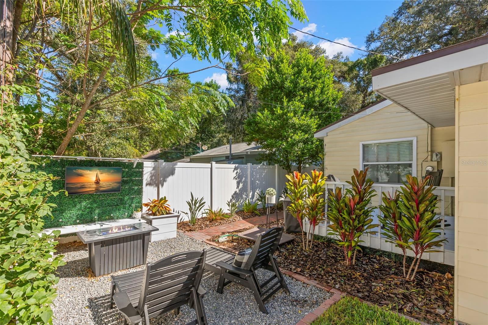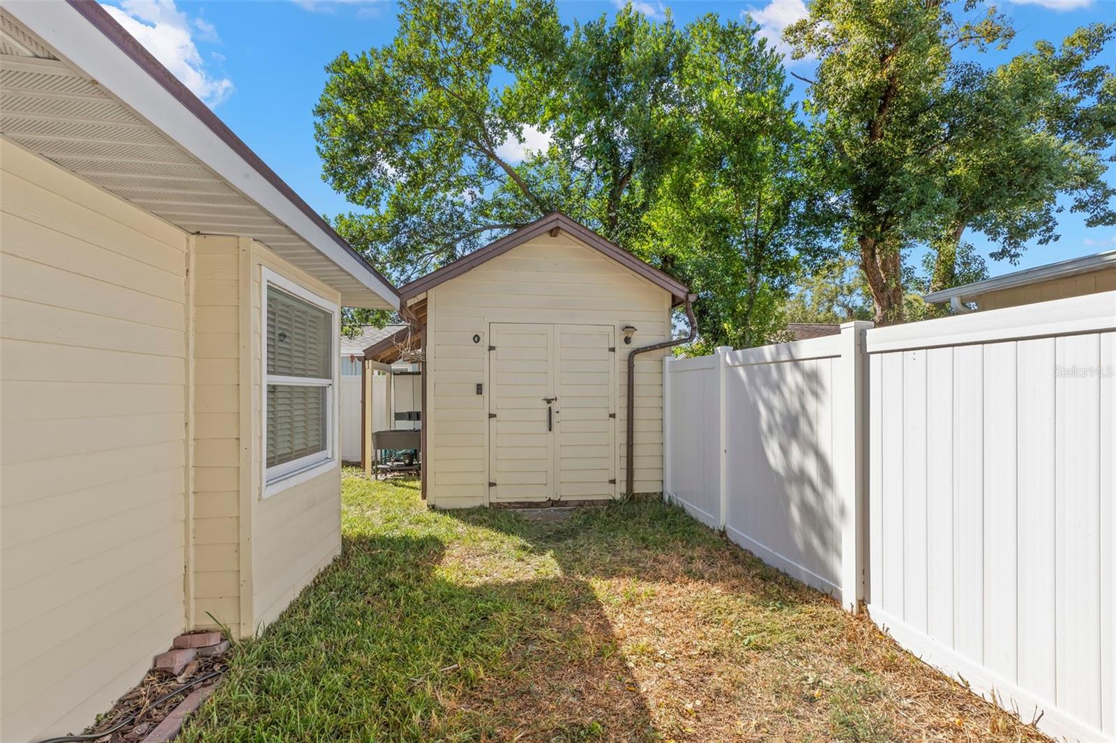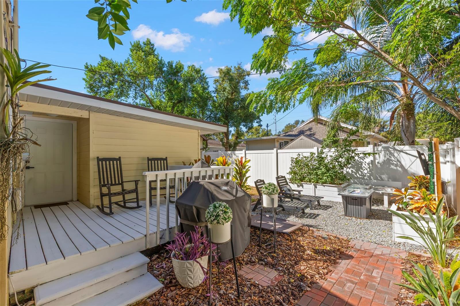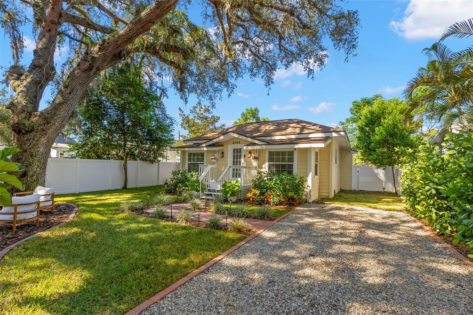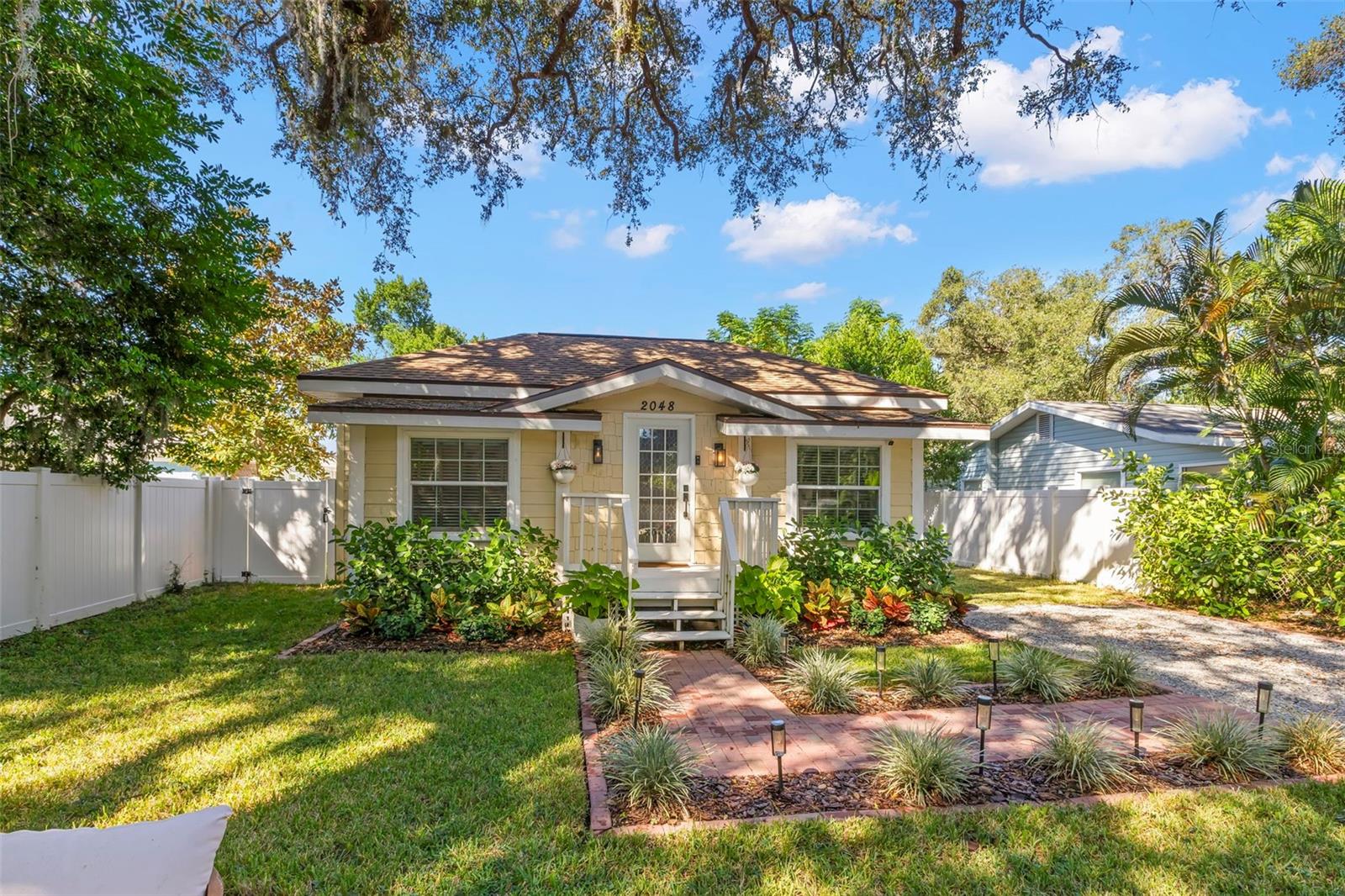Under contract-accepting backup offers. NO HOA AND NON-FLOOD ZONE! HUGE STORAGE SHED INCLUDED! LOCATED ONE BLOCK FROM DUNEDIN and only 5 MINUTES TO VIBRANT DOWNTOWN DUNEDIN, this FULLY UPGRADED 3-bedroom / 2-bath 1930's BUNGALOW perfectly blends HISTORIC CHARM with modern comforts. Tucked quietly at the end of the street, this home’s curb appeal shines with a BRICK PAVERED WALKWAY accented by landscape lighting, and a spacious front yard with classic wrought-iron fence separating the front yard from the street. Mature shade trees with vines create a storybook setting with room for outdoor seating and even a tree swing. A welcoming front porch and decorative glass front door set the tone. Inside, an inviting OPEN FLOOR PLAN filled with warmth and character showcases gorgeous TEXTURED WIDE-PLANK LAMINATE WOOD FLOORING throughout the main living areas. Timeless WOOD-TRIMMED WINDOW CASINGS on all windows add character and window blinds are installed throughout. The UPGRADED EAT-IN KITCHEN features MULTI-LEVEL WOOD CABINETRY, STAINLESS STEEL APPLIANCES and a pantry. The primary bedroom suite includes a BUILT-IN CLOSET SYSTEM with drawers and shelves and a modern EN SUITE BATH with a tiled step-in shower. Two additional bedrooms share a beautifully updated full bath with DECORATIVE WAINSCOTING, a tub/shower combo, and linen storage. The 3rd bedroom stands out with CROWN MOLDING, WAINSCOTING and a COZY WINDOW BENCH making the perfect reading nook! EVERY CLOSET THROUGHOUT THE HOME HAS BEEN THOUGHTFULLY CUSTOMIZED WITH BUILT-IN SHELVING for maximum organization. The OVERSIZED INTERIOR LAUNDRY ROOM (WITH FULL-SIZE WASHER AND DRYER INCLUDED) offers extra space that can EASILY DOUBLE AS AN OFFICE/DEN, extra storage or additional closet. Step outside to a VINYL FENCED PRIVATE BACKYARD OASIS partially XERISCAPED with LUSH LANDSCAPING, BRICK PAVERED WALKWAYS, wooden benches, planters, and a huge detached storage shed with tall ceilings — perfect for bikes, tools, hobbies, or recreational gear. ADDITIONAL UPGRADES INCLUDE: NEW VINYL FENCE (2024), NEWER DOUBLE PANE WINDOWS, NEWER HVAC (2020), NEW TANKLESS WATER HEATER, NEW STAINLESS DISHWASHER & FRIDGE (2023), CUSTOM BUILT SHELVES IN GUEST BEDROOM CLOSETS, LINEN CLOSETS AND PANTRY, NEW SUBFLOOR IN PRIMARY SUITE, NEW TOILETS IN BATHROOMS, RESEALED TUB IN GUEST BATH, SIX-PANEL INTERIOR DOORS THROUGHOUT, RECESSED LIGHTING, WINDOW BLINDS THROUGHOUT, NEW PLUSH CARPETS IN BEDROOMS, NEWER WASHER & DRYER (2023), NEW TILE FLOOR IN LAUNDRY ROOM and ROOF ONLY 6 YEARS OLD (2019)! TRANSFERRABLE TERMITE BOND WITH TERMINIX INCLUDED! Enjoy the Florida lifestyle JUST A COUPLE MINUTES FROM THE PINELLAS TRAIL and the WATERFRONT EDGEWATER DRIVE for DOLPHIN WATCHING and BREATHTAKING SUNSETS! 5 MINUTES TO DOWNTOWN DUNEDIN to enjoy SHOPS, RESTAURANTS and EVENTS! 15 MINUTES TO THE BEAUTIFUL GULF BEACHES OF HONEYMOON ISLAND AND CLEARWATER BEACH! This home checks every box — location, charm, upgrades, and outdoor living — all wrapped in the heart of Dunedin’s coastal community. Welcome home!