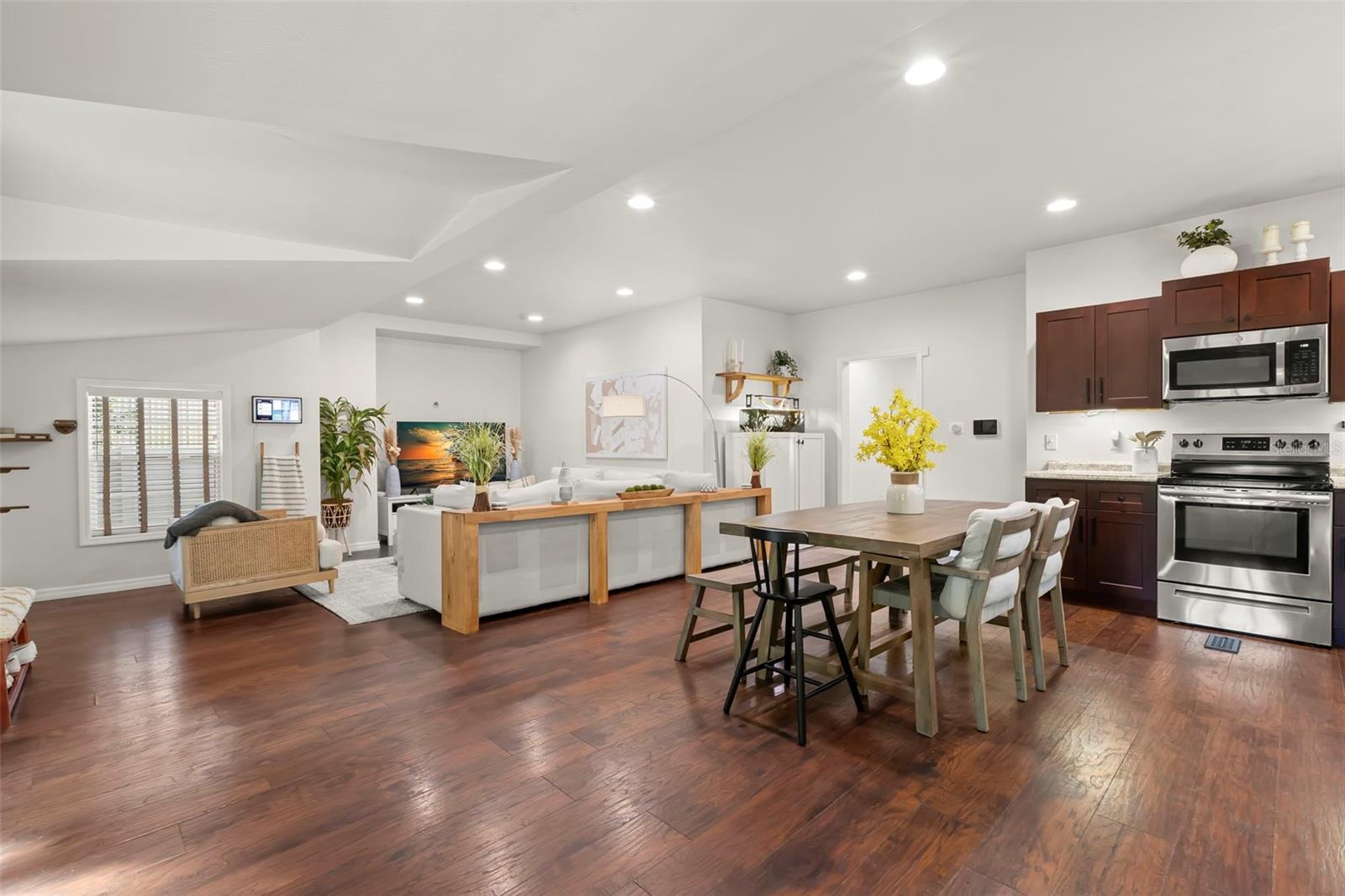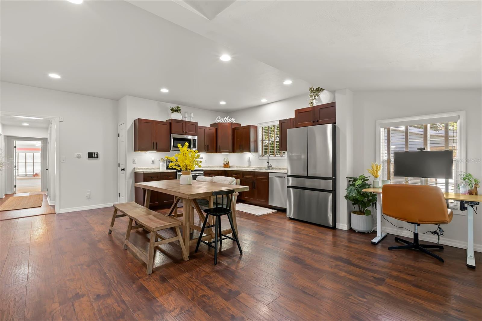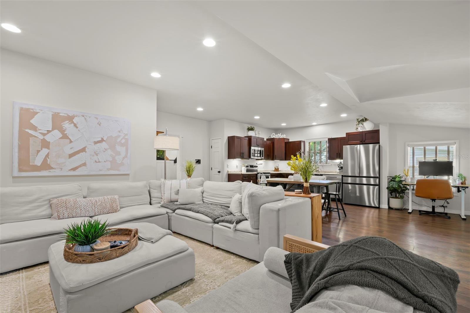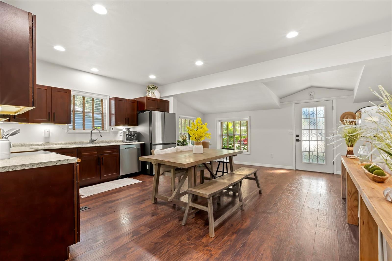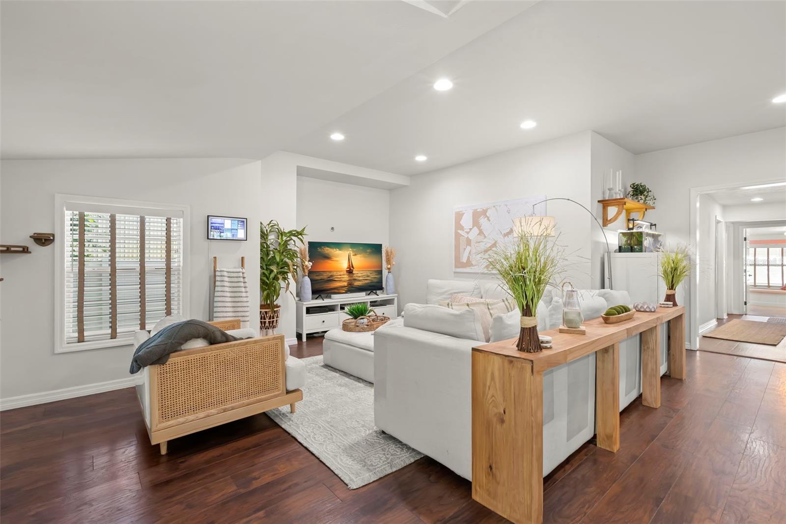 Under contract-accepting backup offers. NO HOA AND NON-FLOOD ZONE! HUGE STORAGE SHED INCLUDED! LOCATED ONE BLOCK FROM DUNEDIN and only 5 MINUTES TO VIBRANT DOWNTOWN DUNEDIN, this FULLY UPGRADED 3-bedroom / 2-bath 1930's BUNGALOW perfectly blends HISTORIC CHARM with modern comforts. Tucked quietly at the end of the street, this home’s curb appeal shines with a BRICK PAVERED WALKWAY accented by landscape lighting, and a spacious front yard with classic wrought-iron fence separating the front yard from the street. Mature shade trees with vines create a storybook setting with room for outdoor seating and even a tree swing. A welcoming front porch and decorative glass front door set the tone. Inside, an inviting OPEN FLOOR PLAN filled with warmth and character showcases gorgeous TEXTURED WIDE-PLANK LAMINATE WOOD FLOORING throughout the main living areas. Timeless WOOD-TRIMMED WINDOW CASINGS on all windows add character and window blinds are installed throughout. The UPGRADED EAT-IN KITCHEN features MULTI-LEVEL WOOD CABINETRY, STAINLESS STEEL APPLIANCES and a pantry. The primary bedroom suite includes a BUILT-IN CLOSET SYSTEM with drawers and shelves and a modern EN SUITE BATH with a tiled step-in shower. Two additional bedrooms share a beautifully updated full bath with DECORATIVE WAINSCOTING, a tub/shower combo, and linen storage. The 3rd bedroom stands out with CROWN MOLDING, WAINSCOTING and a COZY WINDOW BENCH making the perfect reading nook! EVERY CLOSET THROUGHOUT THE HOME HAS BEEN THOUGHTFULLY CUSTOMIZED WITH BUILT-IN SHELVING for maximum organization. The OVERSIZED INTERIOR LAUNDRY ROOM (WITH FULL-SIZE WASHER AND DRYER INCLUDED) offers extra space that can EASILY DOUBLE AS AN OFFICE/DEN, extra storage or additional closet. Step outside to a VINYL FENCED PRIVATE BACKYARD OASIS partially XERISCAPED with LUSH LANDSCAPING, BRICK PAVERED WALKWAYS, wooden benches, planters, and a huge detached storage shed with tall ceilings — perfect for bikes, tools, hobbies, or recreational gear. ADDITIONAL UPGRADES INCLUDE: NEW VINYL FENCE (2024), NEWER DOUBLE PANE WINDOWS, NEWER HVAC (2020), NEW TANKLESS WATER HEATER, NEW STAINLESS DISHWASHER & FRIDGE (2023), CUSTOM BUILT SHELVES IN GUEST BEDROOM CLOSETS, LINEN CLOSETS AND PANTRY, NEW SUBFLOOR IN PRIMARY SUITE, NEW TOILETS IN BATHROOMS, RESEALED TUB IN GUEST BATH, SIX-PANEL INTERIOR DOORS THROUGHOUT, RECESSED LIGHTING, WINDOW BLINDS THROUGHOUT, NEW PLUSH CARPETS IN BEDROOMS, NEWER WASHER & DRYER (2023), NEW TILE FLOOR IN LAUNDRY ROOM and ROOF ONLY 6 YEARS OLD (2019)! TRANSFERRABLE TERMITE BOND WITH TERMINIX INCLUDED! Enjoy the Florida lifestyle JUST A COUPLE MINUTES FROM THE PINELLAS TRAIL and the WATERFRONT EDGEWATER DRIVE for DOLPHIN WATCHING and BREATHTAKING SUNSETS! 5 MINUTES TO DOWNTOWN DUNEDIN to enjoy SHOPS, RESTAURANTS and EVENTS! 15 MINUTES TO THE BEAUTIFUL GULF BEACHES OF HONEYMOON ISLAND AND CLEARWATER BEACH! This home checks every box — location, charm, upgrades, and outdoor living — all wrapped in the heart of Dunedin’s coastal community. Welcome home!