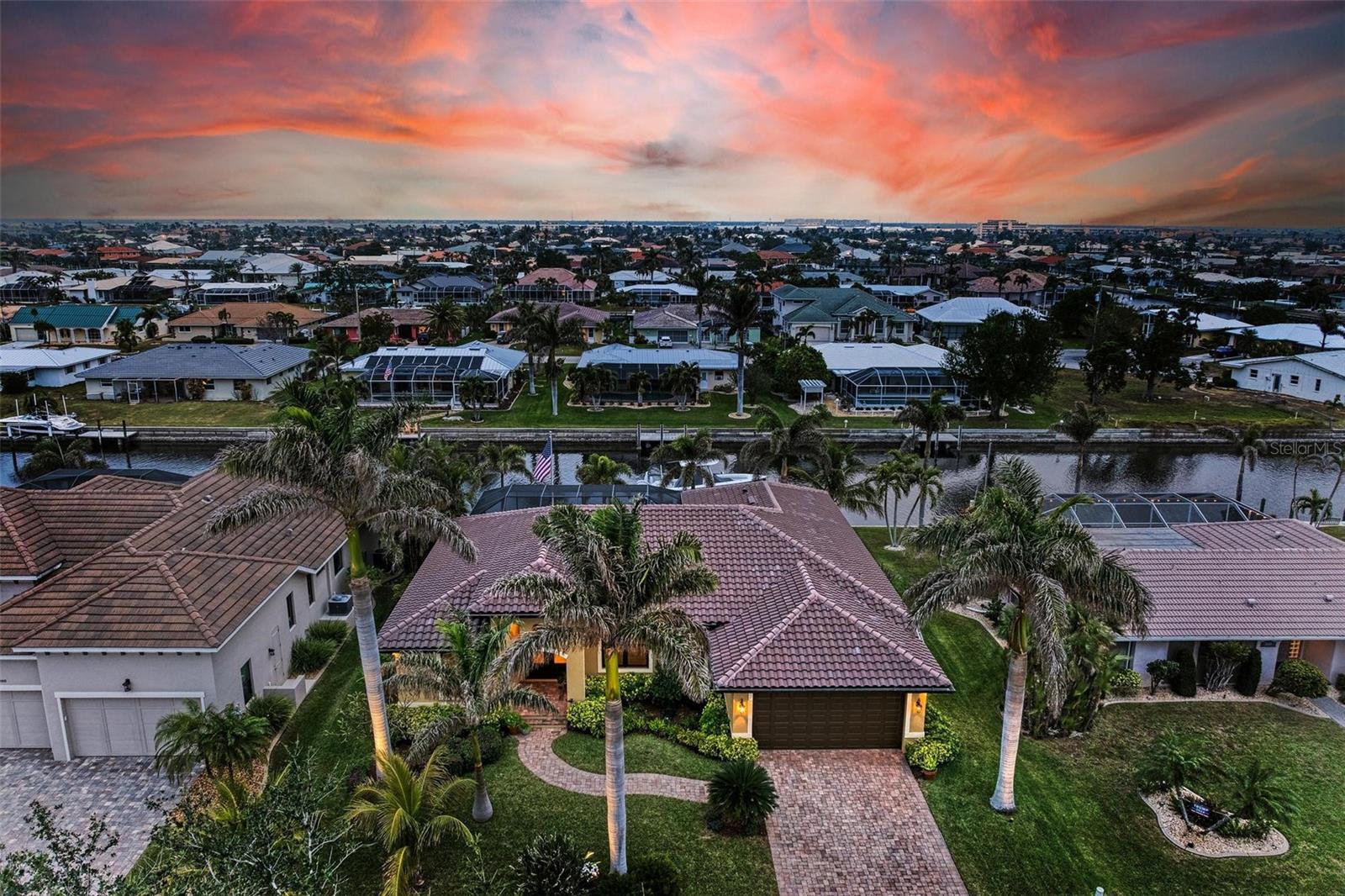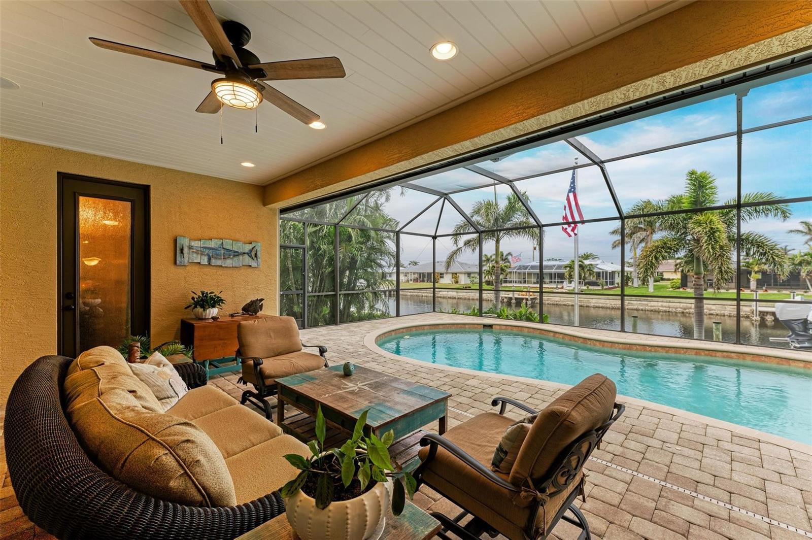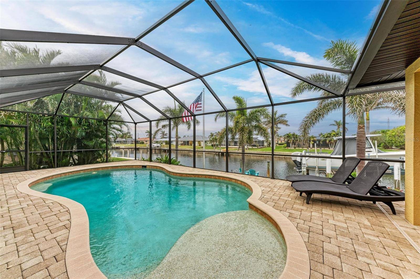 WATERFRONT LUXURY AWAITS at this gorgeous 2013 built custom POOL HOME with incredible and unique features! This 3-bedroom, 3 full bath –2, 205 sqft air conditioned / 3, 260 sqft total home on an 85’ x 120’ oversized lot has an oversized two car garage with a large climate-controlled storage room, a NEW cement tile roof with double underlayment, new soffit and 7” gutters, a refurbished cage, new garage epoxy flooring, all completed in 2024. Inside, enjoy two guest bedrooms, each with their own bathroom on the left side of the home, an open concept design including the dining room, spacious great room, kitchen and dinette all open to the outdoors via six - 8’ tall sliders that create indoor/outdoor spaces with wonderful views of the water and pool, a beautiful primary suite with dual walk-in closets and an en-suite bathroom with separate tub and walk-in shower, and upgraded dual vanities. Additional features include a large inside laundry room with extra storage, a commercial grade flagpole, upgraded landscaping, audio speakers in main living area and outside porches, Impact windows and Storm Smart hurricane shutters for lanai, 20” porcelain tile flooring throughout, tongue and groove ceilings in main living area and outside porches, a huge walk-in pantry large enough for a deep freeze off the beautiful gourmet kitchen, an amazing outdoor kitchen and bar with propane grill and additional two burner cooktop, a heated saltwater gunite pool that is 7’ deep, landscape decorative lighting, a fabulous 35' concrete dock with 20, 000 lb lift, shore power, and 2 hose spigots. This home also is GENERATOR READY with a plugin adaptor for home power. Nearby to great shopping, restaurants, marinas, golf, parks and more, you will not want to miss this! BE SURE TO CLICK THE FULL VIRTUAL TOUR LINKS FOR DETAILS!