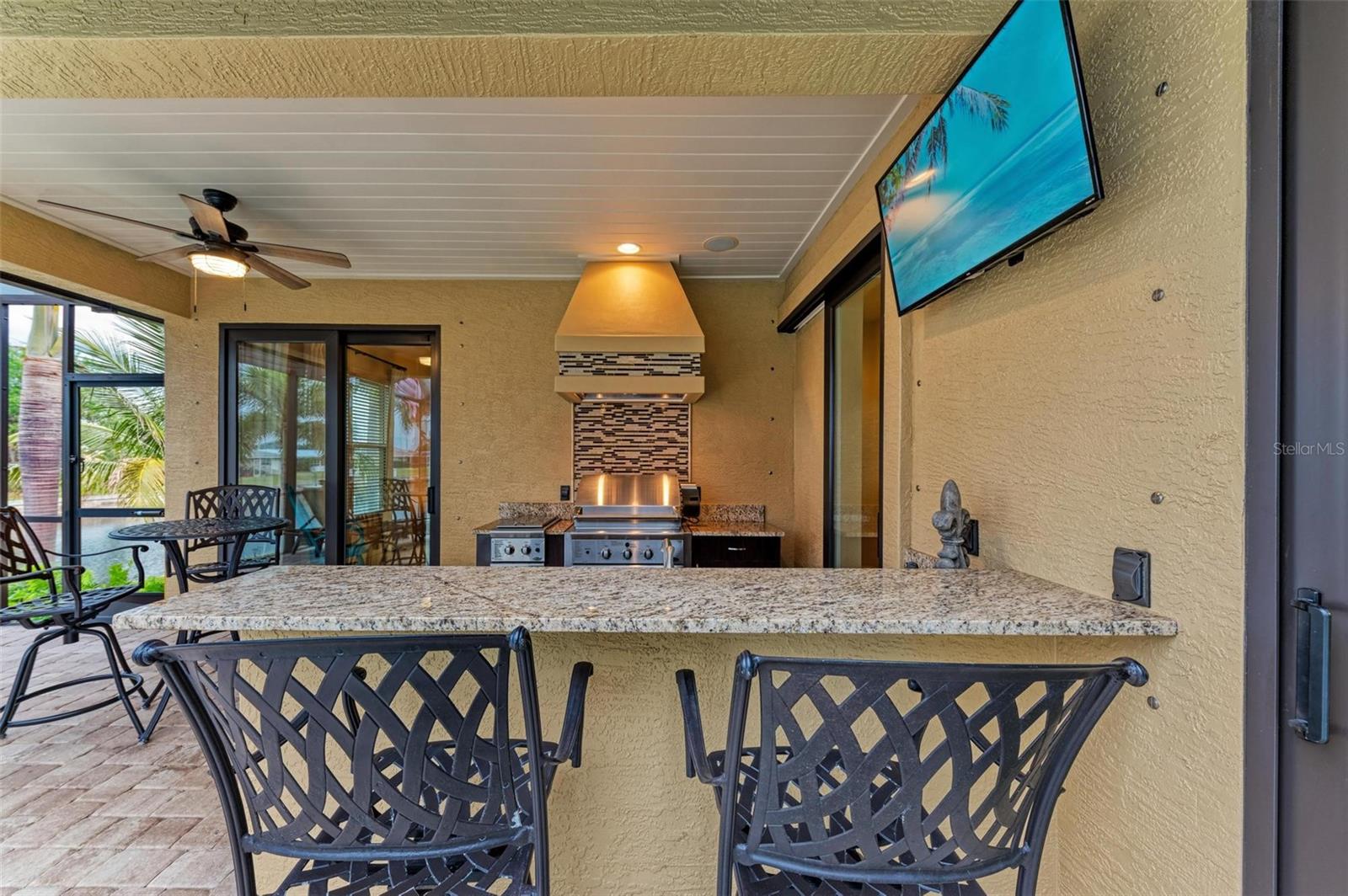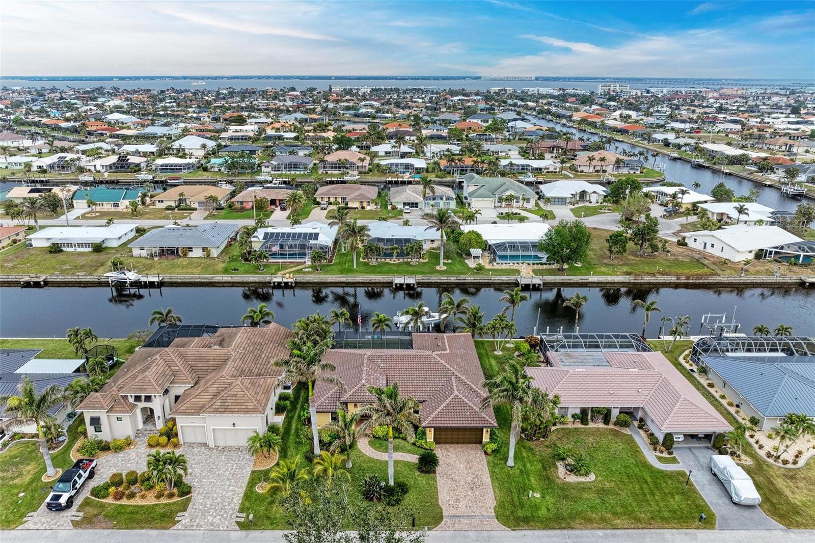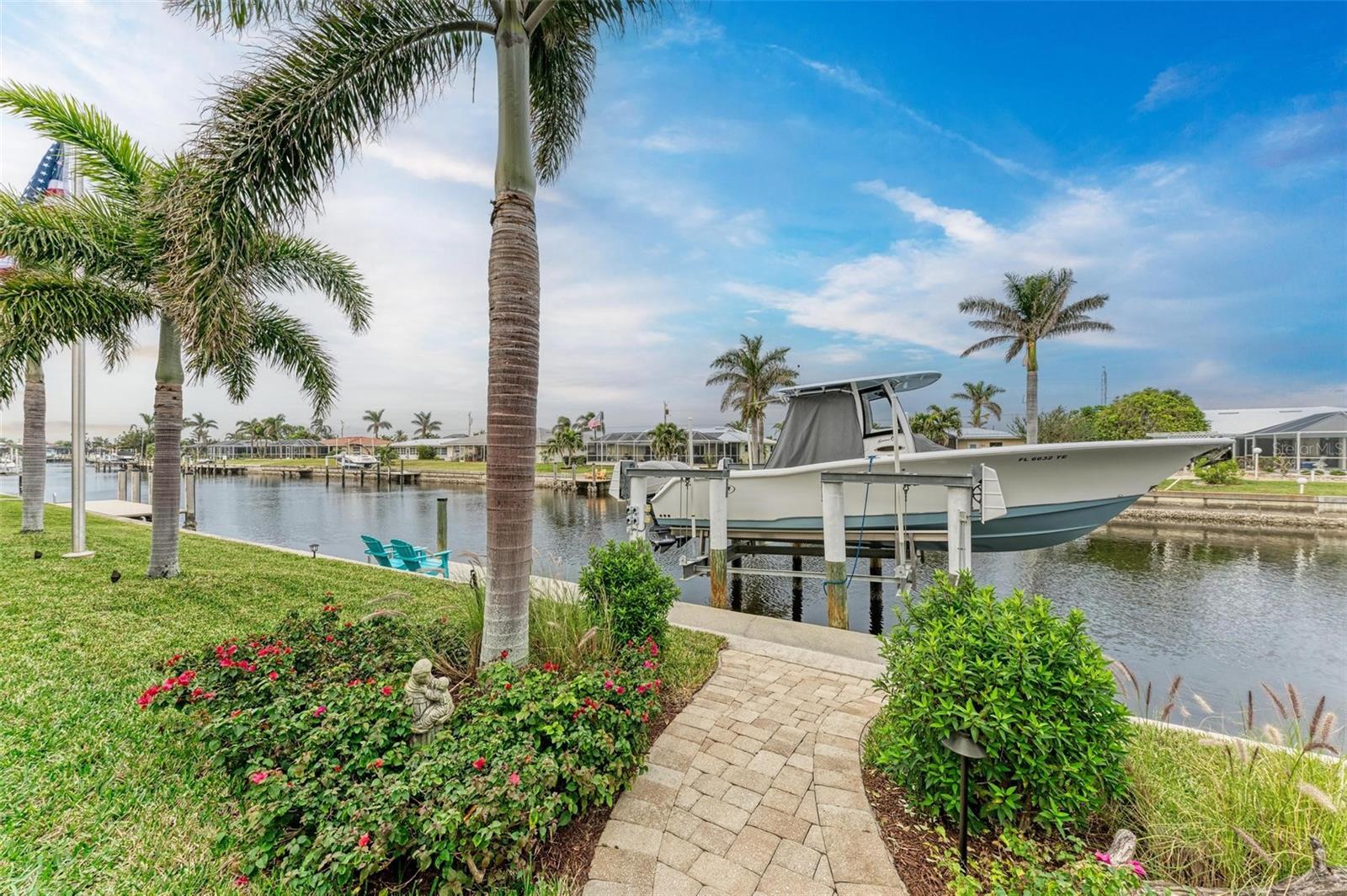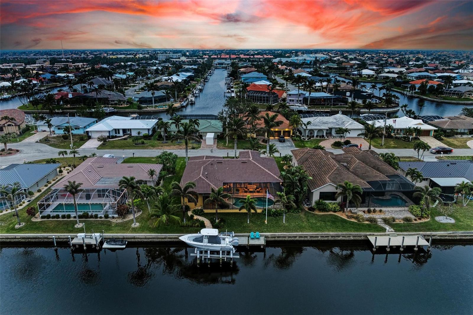 WATERFRONT LUXURY AWAITS at this gorgeous 2013 built custom POOL HOME with incredible and unique features! This 3-bedroom, 3 full bath –2, 205 sqft air conditioned / 3, 260 sqft total home on an 85’ x 120’ oversized lot has an oversized two car garage with a large climate-controlled storage room, a NEW cement tile roof with double underlayment, new soffit and 7” gutters, a refurbished cage, new garage epoxy flooring, all completed in 2024. Inside, enjoy two guest bedrooms, each with their own bathroom on the left side of the home, an open concept design including the dining room, spacious great room, kitchen and dinette all open to the outdoors via six - 8’ tall sliders that create indoor/outdoor spaces with wonderful views of the water and pool, a beautiful primary suite with dual walk-in closets and an en-suite bathroom with separate tub and walk-in shower, and upgraded dual vanities. Additional features include a large inside laundry room with extra storage, a commercial grade flagpole, upgraded landscaping, audio speakers in main living area and outside porches, Impact windows and Storm Smart hurricane shutters for lanai, 20” porcelain tile flooring throughout, tongue and groove ceilings in main living area and outside porches, a huge walk-in pantry large enough for a deep freeze off the beautiful gourmet kitchen, an amazing outdoor kitchen and bar with propane grill and additional two burner cooktop, a heated saltwater gunite pool that is 7’ deep, landscape decorative lighting, a fabulous 35' concrete dock with 20, 000 lb lift, shore power, and 2 hose spigots. This home also is GENERATOR READY with a plugin adaptor for home power. Nearby to great shopping, restaurants, marinas, golf, parks and more, you will not want to miss this! BE SURE TO CLICK THE FULL VIRTUAL TOUR LINKS FOR DETAILS!