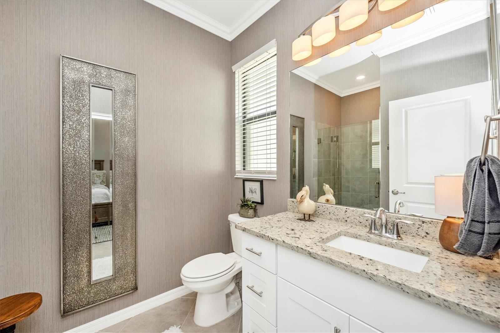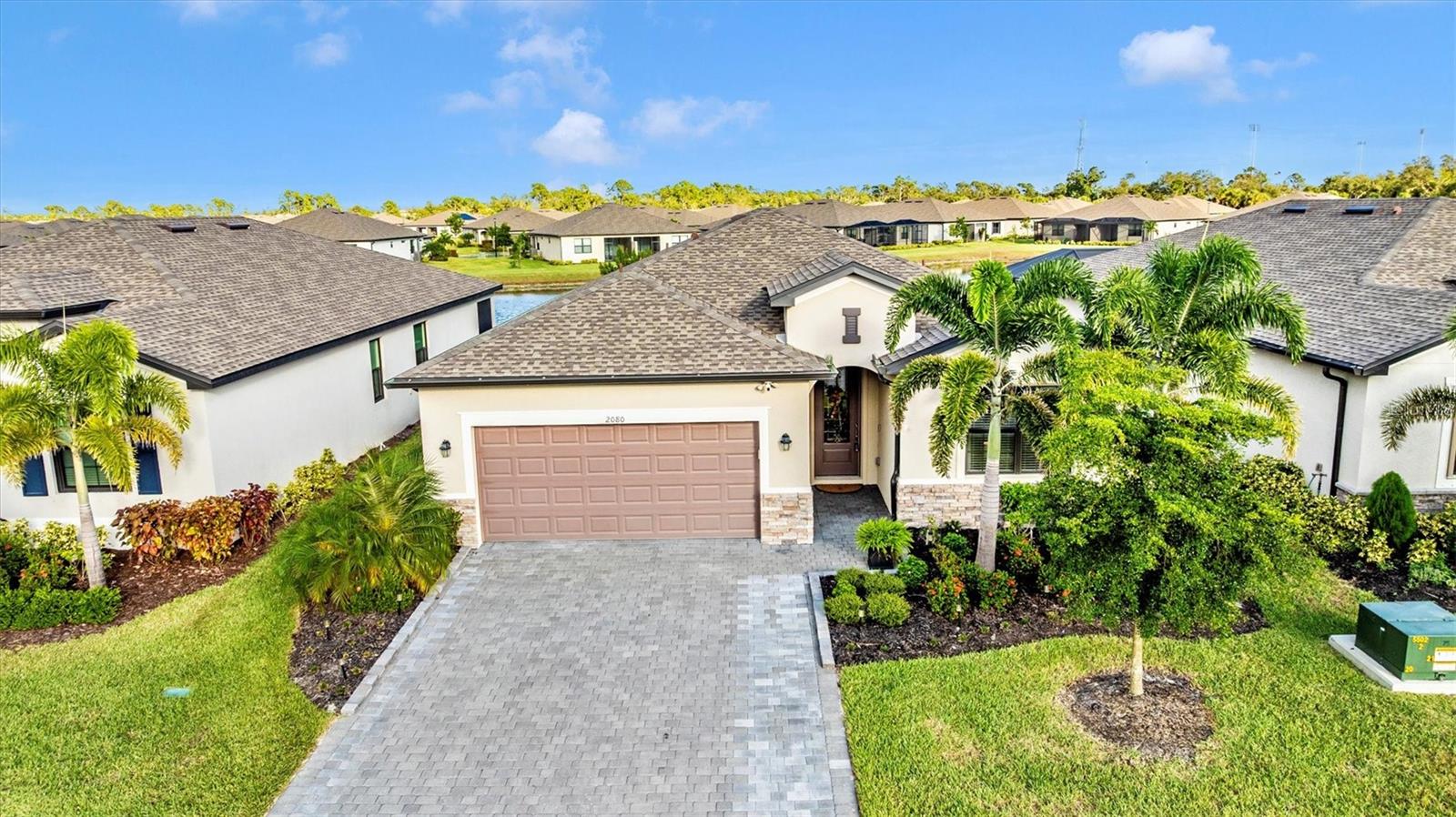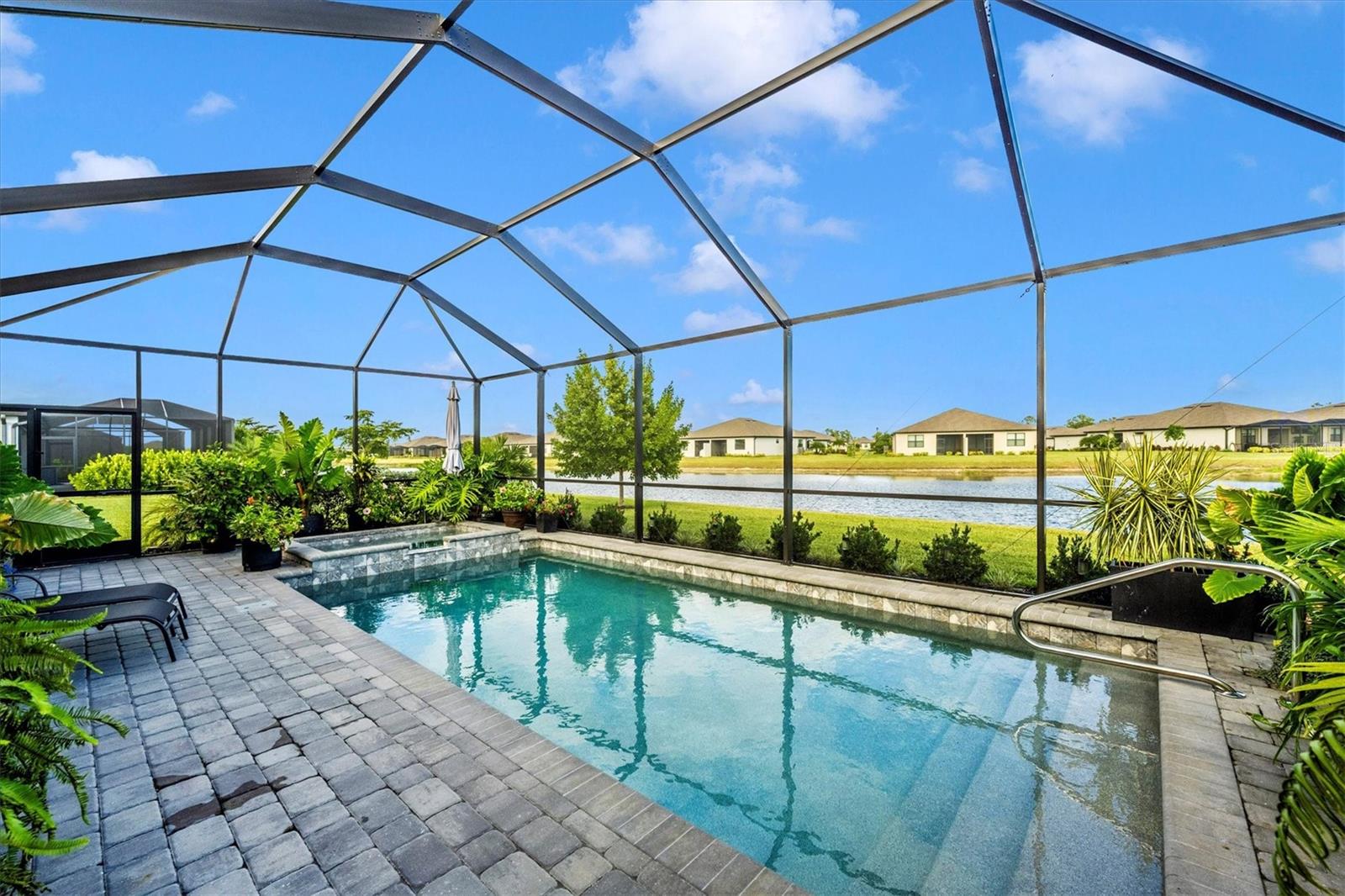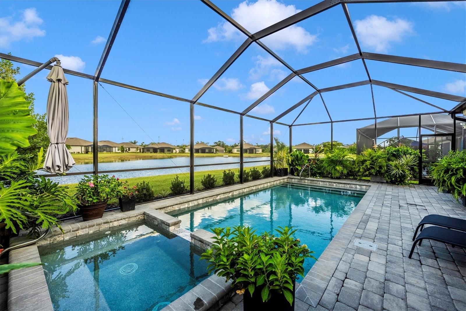 Under contract-accepting backup offers. This stunning home truly shows like a model and is perfectly situated on one of the premier lots in the neighborhood—backing to the widest part of the lake for exceptional views and privacy. Inside, a thoughtfully designed open floor plan welcomes you, with guest suites toward the front and a serene primary retreat tucked in the back. While just three years young, this home has been extensively enhanced with features the builder never offered. A leaded glass front door and upgraded porch lighting set the tone. The reimagined kitchen showcases striking quartz countertops, white shaker cabinetry with soft-close drawers, decorative glass doors on the butler’s pantry, a gorgeous stone backsplash, and all-new stainless steel appliances—including an on-demand hot water system beneath the sink. The family room impresses with a custom stacked-stone electric fireplace, built-in shelving, and a remote-controlled shade for the sliding doors. Both guest baths have been updated with sleek standing showers and gliding glass doors, while the primary suite boasts lighted mirrors, a custom walk-in shower, and a relaxing garden tub. Crown molding graces the entire home, and every builder-grade light fixture has been replaced with stylish, designer-selected lighting. Exterior upgrades include a widened driveway, full gutters, Storm Smart shutters, and a remote-controlled lanai shade—perfect for extra storm protection or everyday comfort. The saltwater pool and spa are enhanced by a tranquil custom water fountain, creating the ultimate backyard oasis. Enjoy low-maintenance living in this gated community, where the HOA covers lawn care, trimming, cable, internet, and trash service. Residents also enjoy an active social calendar, fitness center, pickleball courts, and more! Ideally located close to shopping, dining, Englewood Beach, and the lively Dearborn Street nightlife—this home offers the best of Florida living!