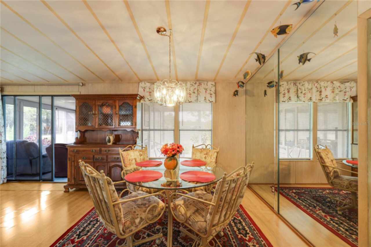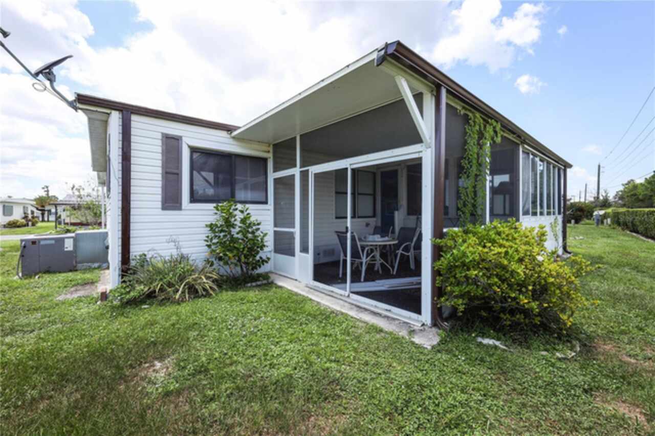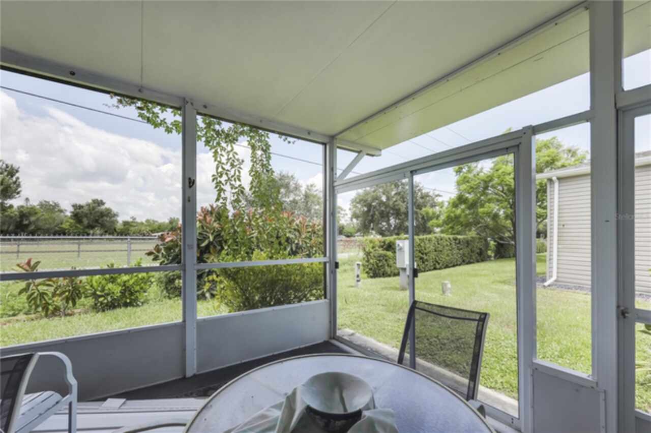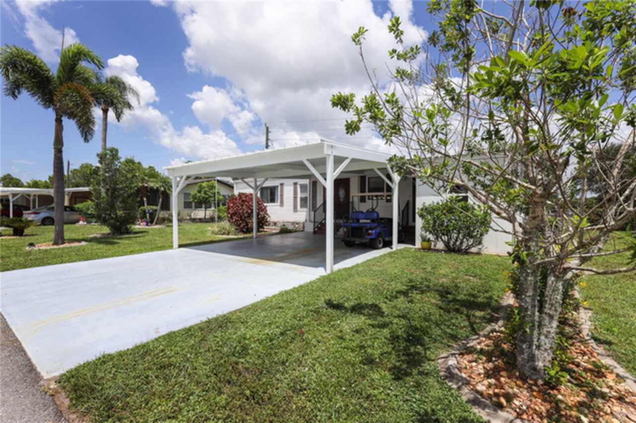 This 1986 Three bedroom Jacobsen built home is sure to please. Located on the back east side of the community on a perimeter lot with a horse paddock view. The 23 foot wide driveway is perfect for those with more than one vehicle. Interior laundry for added convenience. The split bedroom floor plan is perfect for entertaining overnight guests with primary bedroom suite on one side the home and guest rooms on the other. The two guest bedrooms share the second bathroom. On the exterior, 80sq ft storage shed and spacious 168sq ft lanai and 156sq ft screened and covered patio. AC and duct work replaced 2017, new carport 2023. Home being sold furnished. ***Be sure to check out the two virtual tours for video walk through and 3-D virtual*** Maple Leaf is a resident owned 55+ community with an active resort lifestyle. Activities include award winning par 62, 18 hole golf course, 4 heated swimming pools, 5 tennis courts, bocce, lawn bowling, 2 shuffleboard court centers, 2 hot tubs, sauna, fitness center, woodworkers shop, pottery studio, 4 pickleball courts, two restaurants, full service bar, tiki hut with bar and over 75 clubs and activities. Price of home includes membership certificate.