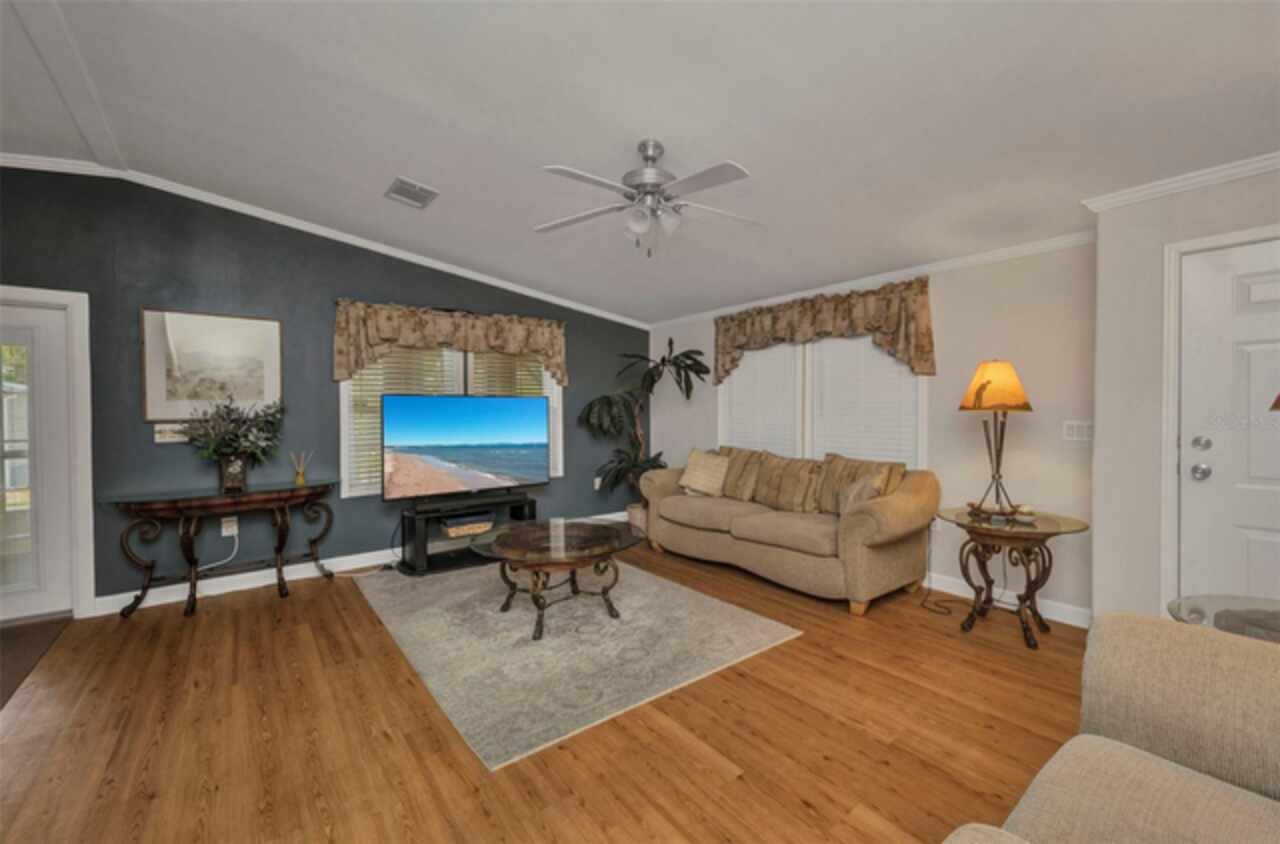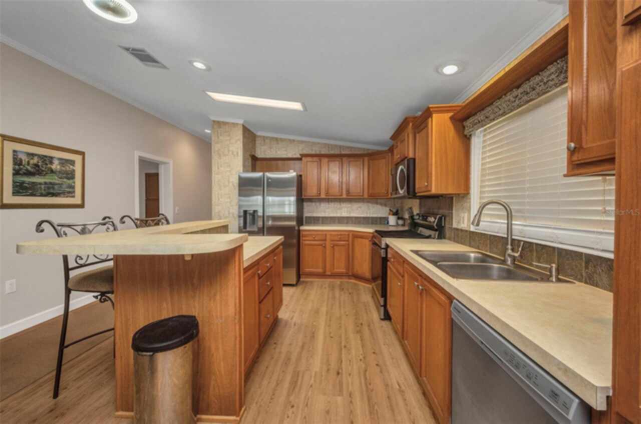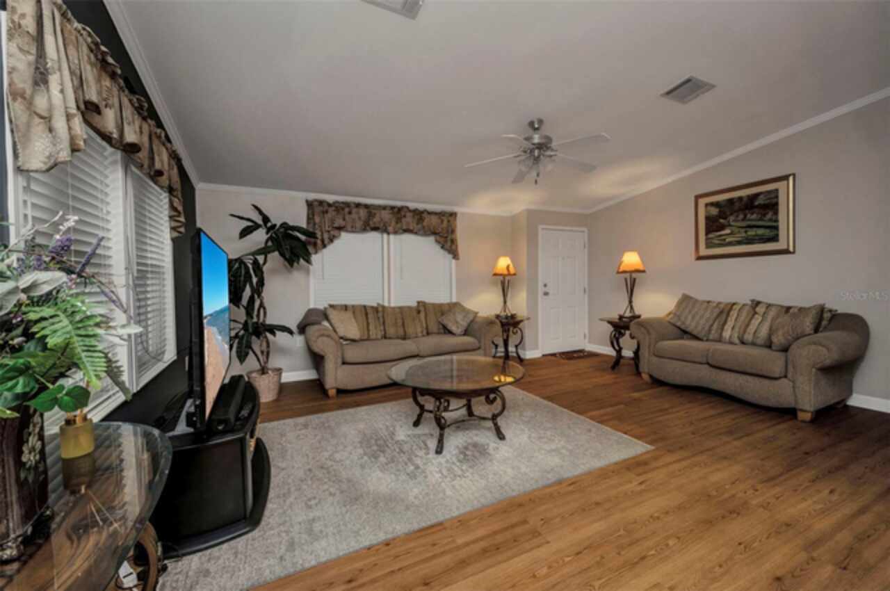 DOG APPROVED LOCATION 3 Bed 2 Bath with many upgrades! This True Three Bed Two Bath home in Gated Golf Course community features Large Living room that is open concept to your Dining area and Large Kitchen with Island that offers you addition eat-in kitchen bar area. Home features many high-end custom design updates such as drywall, rounded corners, high ceilings and Crown molding! The home updates include Newer Windows, Roof 2022, Microwave, Fridge, Dishwasher 2024 and Solid surface range. The French doors open to your large screened in lanai with custom privacy screens. Each Bedroom has nice sized closets including a walk-in closet in your Primary Suite. The Laundry/Storage room has ample closet space with a nice sink with counter space. Looking to have a Side-Side Two Car Carport, well this is it! It's an oversized carport with additional room for your golf cart. This is a Perimeter home, lowest HOA Fee. You will not want to miss this Fantastic 55+ Resident-Owned 18 Hole Executive Gated Golf Course Amenity-Rich Community has lighted Tennis Courts, Pickleball Courts, Fitness Room, Heated Swimming Pools, Clubhouses, Fishing Lakes, Bocce Ball, Lawn Bowling, Mini-Putt, Horseshoes, Many Special Clubs, Arts & Crafts, Cards, Bingo, Woodworking Shop, Ceramics and Computer Club. Enjoy the On-Site Restaurant/Bar for Dinners, Music & Entertainment! Maple Leaf Golf & Country Club is a Resident Owned community. Price Includes Membership Certificate. The membership certificate (stock certificate) is evidence of ownership of a fractional interest of the corporation, Maple Leaf Estates Homeowners' Corporation.