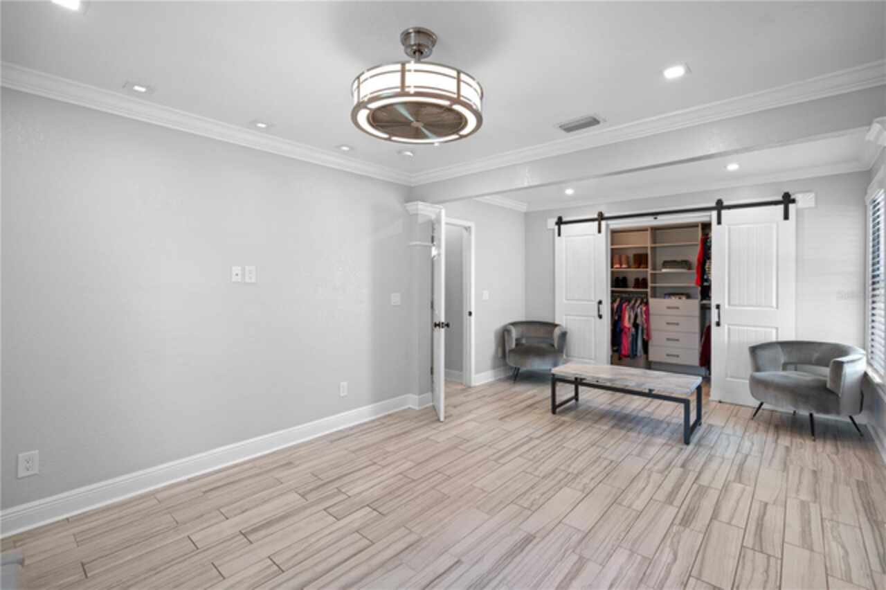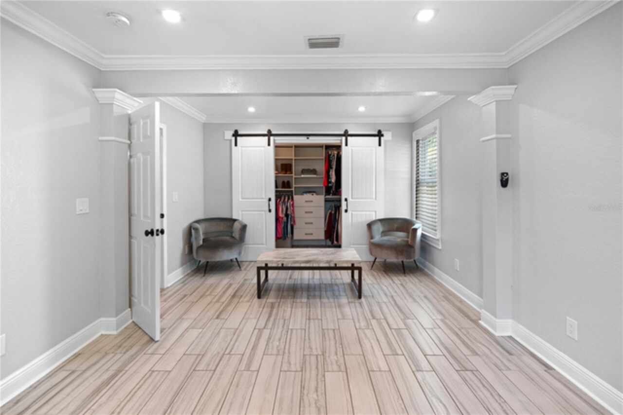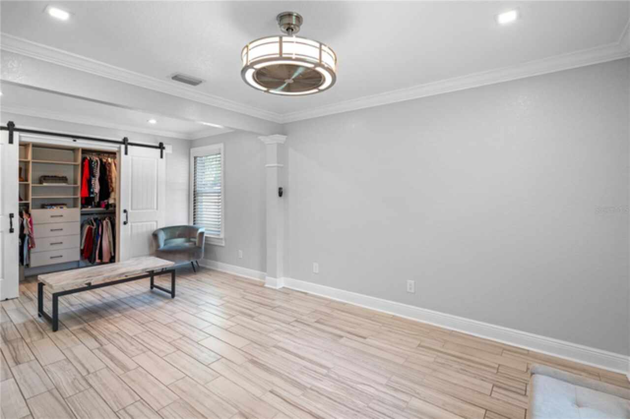 Built-in Features, Ceiling Fans(s), Crown Molding, Dry Bar, Open Floorplan, Primary Bedroom Main Floor, Thermostat, Walk-In Closet(s), Window Treatments