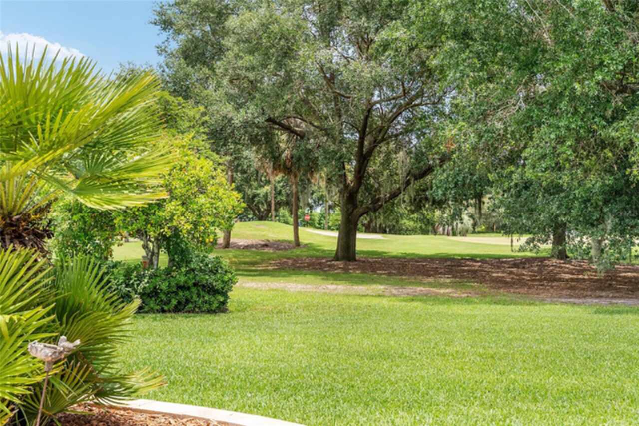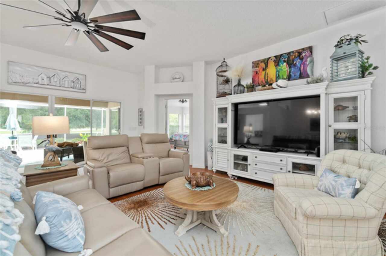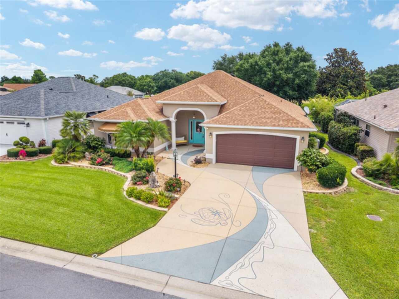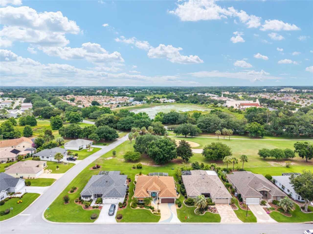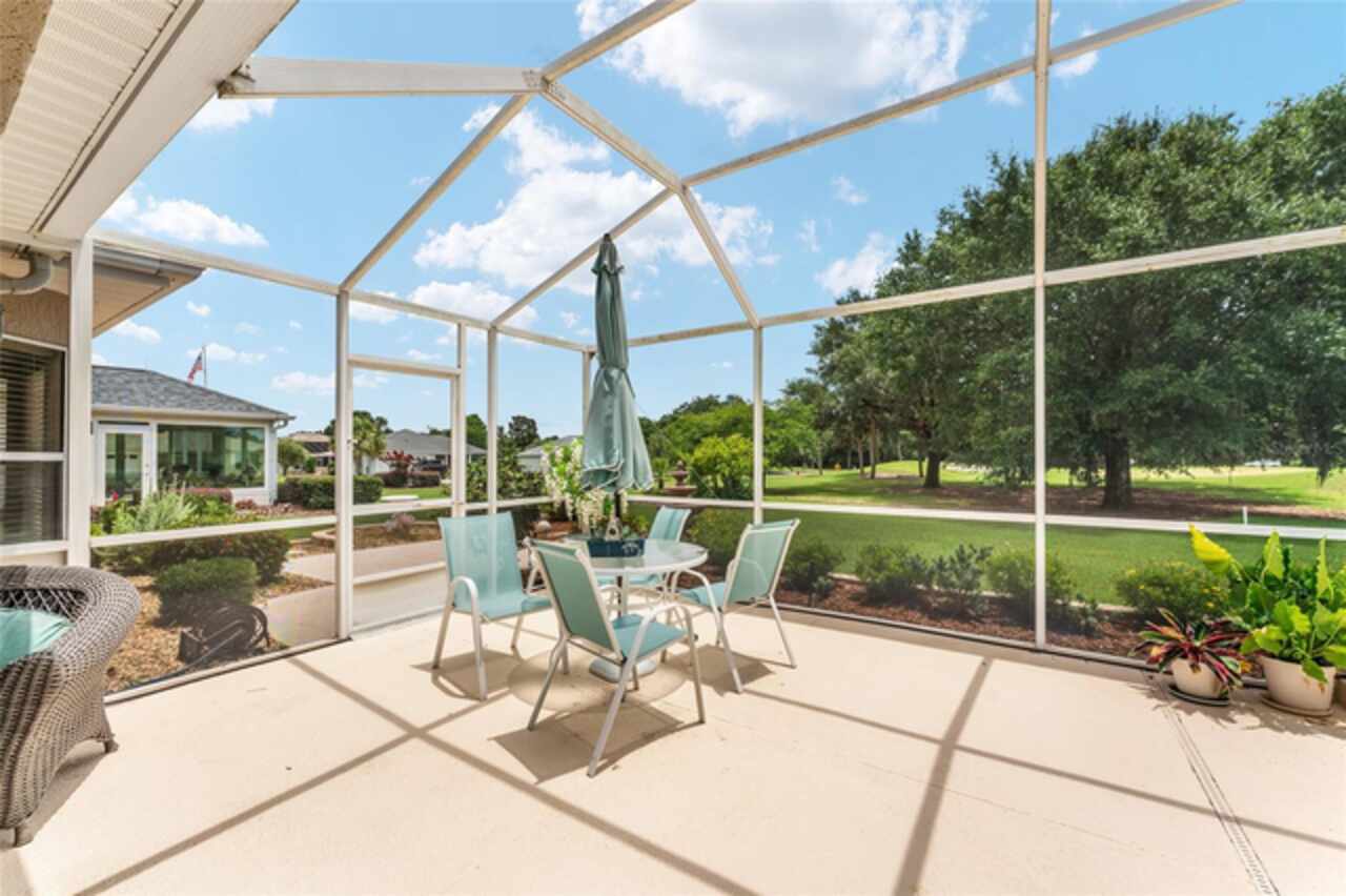 This stylish and desirable 3/2, 1831sf Sierra Model home is located near the 15th hole of the Tierra del Sol golf course. PRIVATE VIEW OF THE GOLF COURSE W/ NO CART PATH IN SITE! It has a SPLIT PLAN which allows guests their own private bath and bedroom area. The kitchen is bright and spacious with STAINLESS STEEL APPLIANCES, BREAKFAST BAR, WHITE CABINETS, GRANITE COUNTERS/ BACKSPLASH, and a space for a dining table that overlooks the greens. NEUTRAL Interior paint. Great bedroom sizes. Large screened-in lanai and birdcage with OUTDOOR SINK and in-ground hot tub. Elevated PROFESSIONALLY LANDSCAPED and the exterior is BLOCK & STUCCO. TANKLESS H20 HTR, NEW ROOF, NEW WASHER/ DRYER, NEW DECORATIVE DRIVEWAY, EPOXY garage floor. HIGH END WHOLE HOUSE FILTRATION and WATER SOFTENING SYSTEM. NO BOND. Some of the lovely furnishings are available separately. Superior location, just minutes from 466 shopping, restaurants, banks, pools and Rec areas. SHORT CART RIDE to Sumter Lndg. This home is unique and beautiful so don’t miss the opportunity to see it.