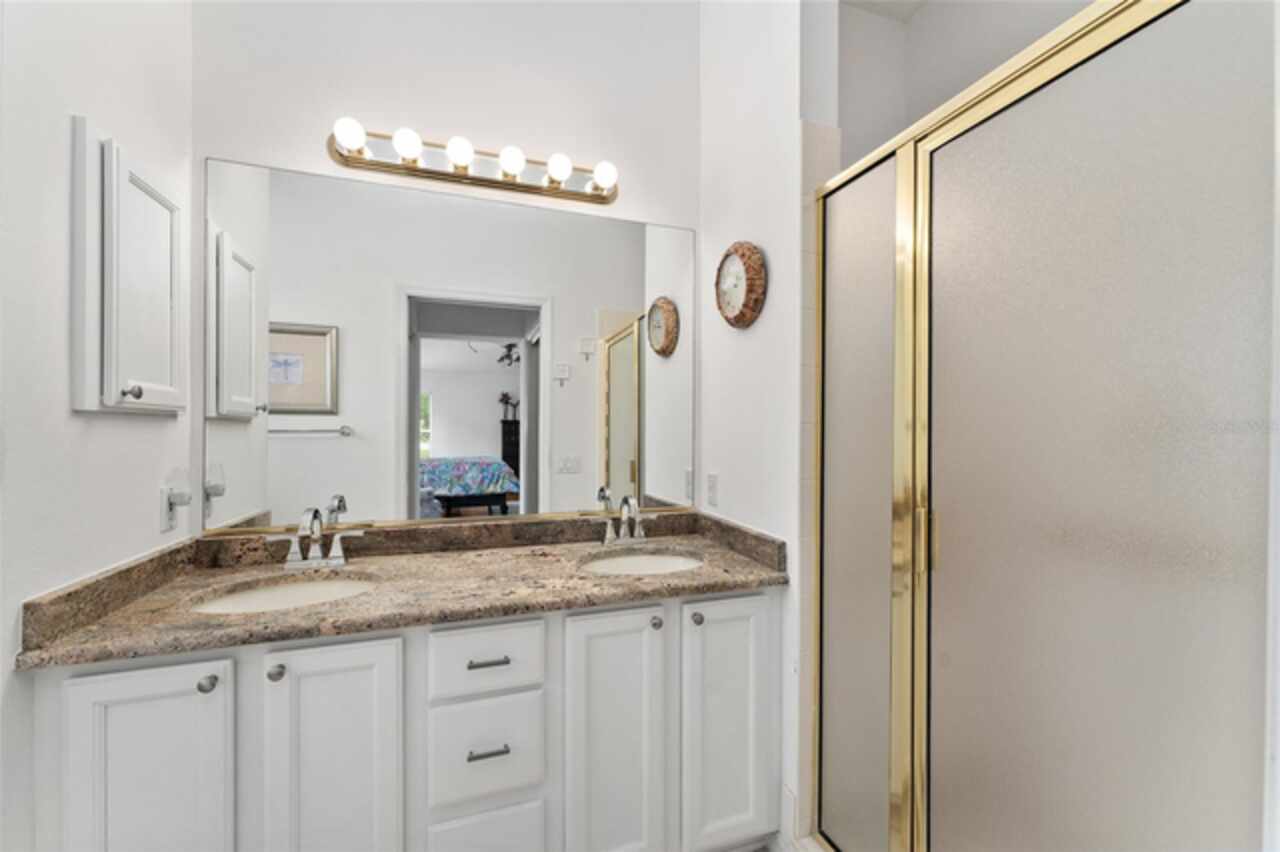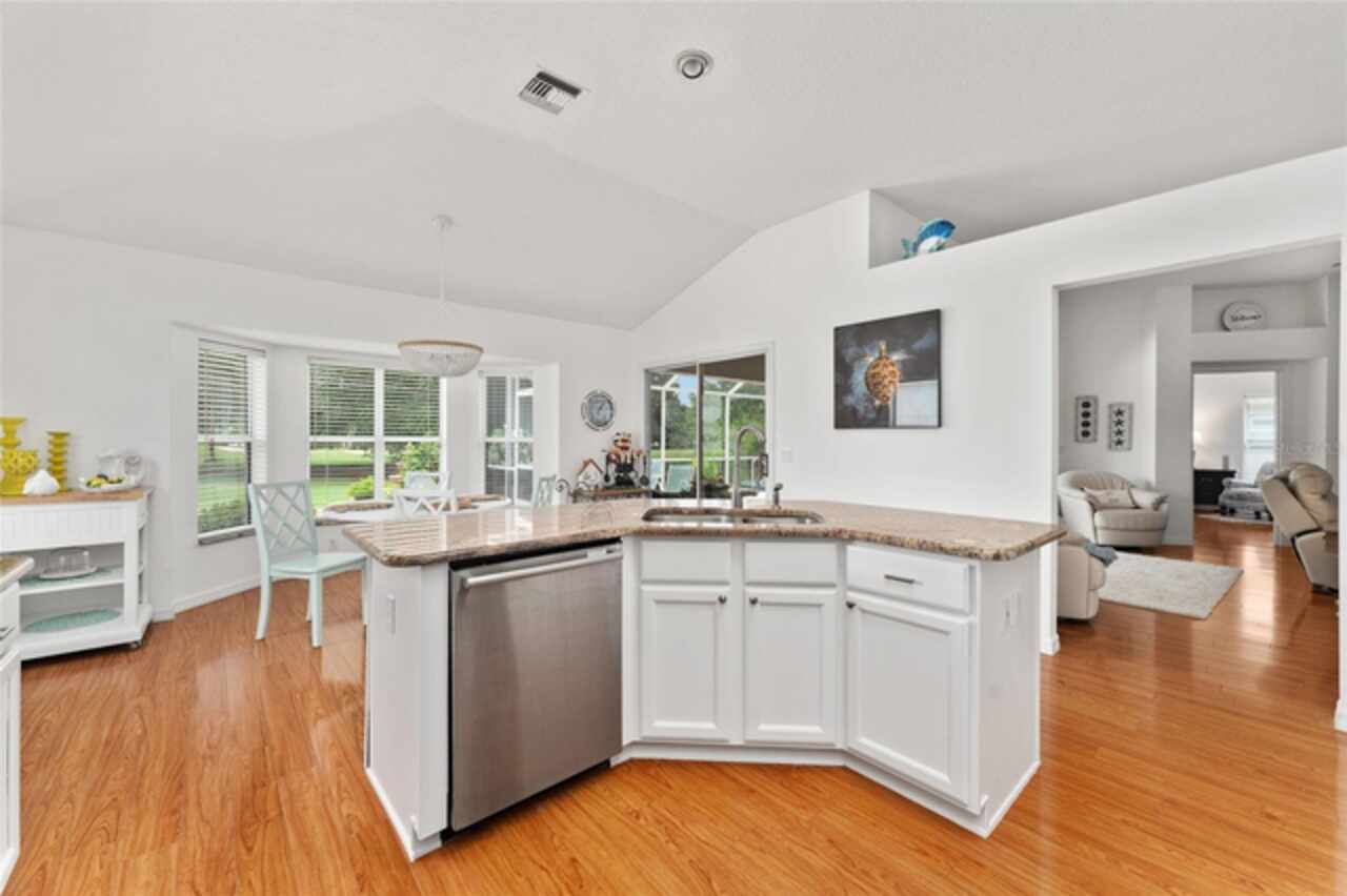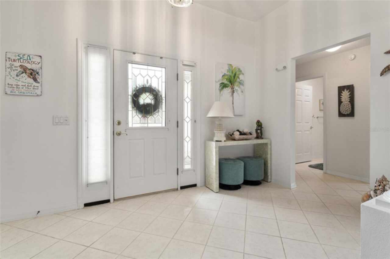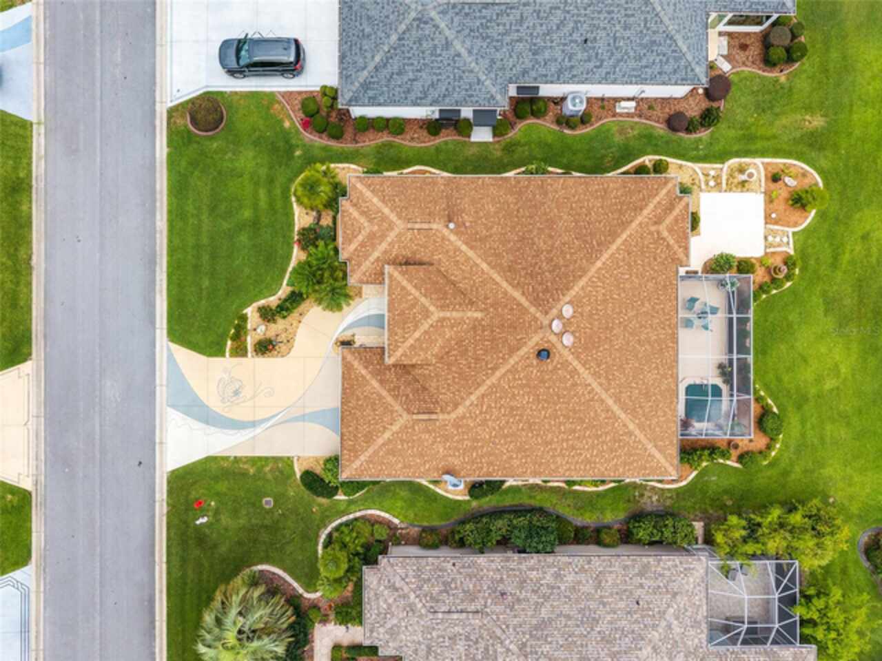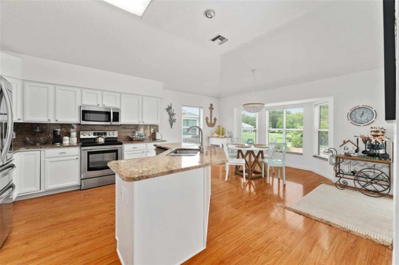 This stylish and desirable 3/2, 1831sf Sierra Model home is located near the 15th hole of the Tierra del Sol golf course. PRIVATE VIEW OF THE GOLF COURSE W/ NO CART PATH IN SITE! It has a SPLIT PLAN which allows guests their own private bath and bedroom area. The kitchen is bright and spacious with STAINLESS STEEL APPLIANCES, BREAKFAST BAR, WHITE CABINETS, GRANITE COUNTERS/ BACKSPLASH, and a space for a dining table that overlooks the greens. NEUTRAL Interior paint. Great bedroom sizes. Large screened-in lanai and birdcage with OUTDOOR SINK and in-ground hot tub. Elevated PROFESSIONALLY LANDSCAPED and the exterior is BLOCK & STUCCO. TANKLESS H20 HTR, NEW ROOF, NEW WASHER/ DRYER, NEW DECORATIVE DRIVEWAY, EPOXY garage floor. HIGH END WHOLE HOUSE FILTRATION and WATER SOFTENING SYSTEM. NO BOND. Some of the lovely furnishings are available separately. Superior location, just minutes from 466 shopping, restaurants, banks, pools and Rec areas. SHORT CART RIDE to Sumter Lndg. This home is unique and beautiful so don’t miss the opportunity to see it.