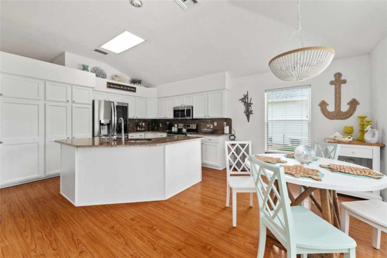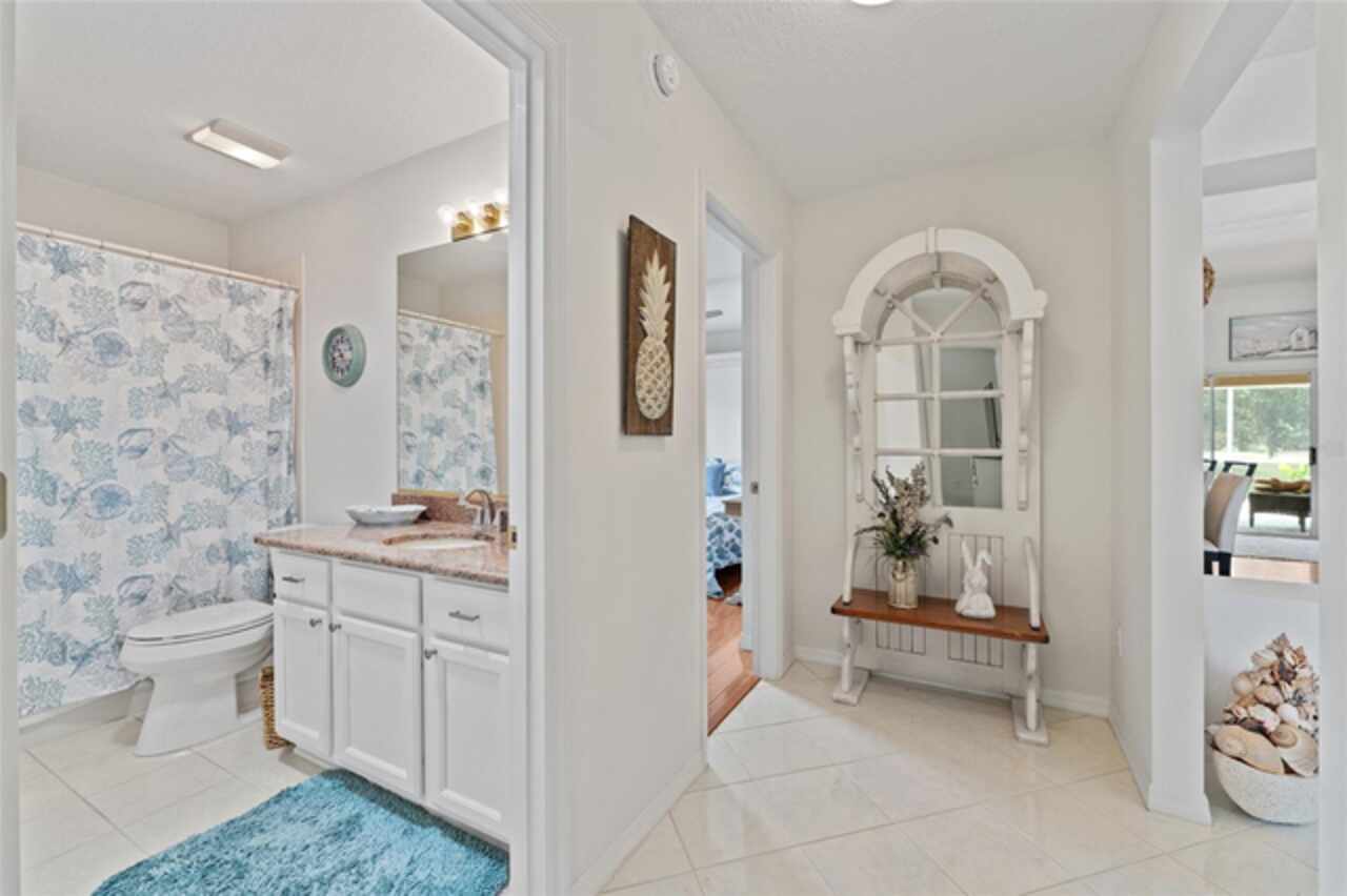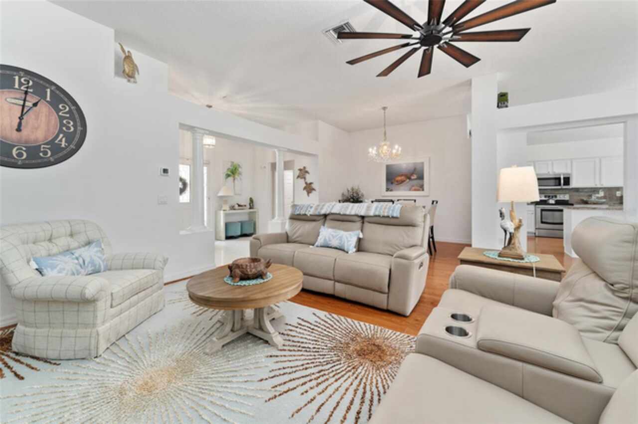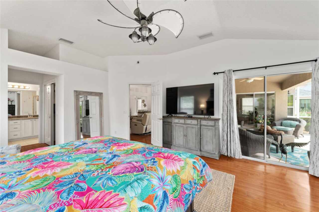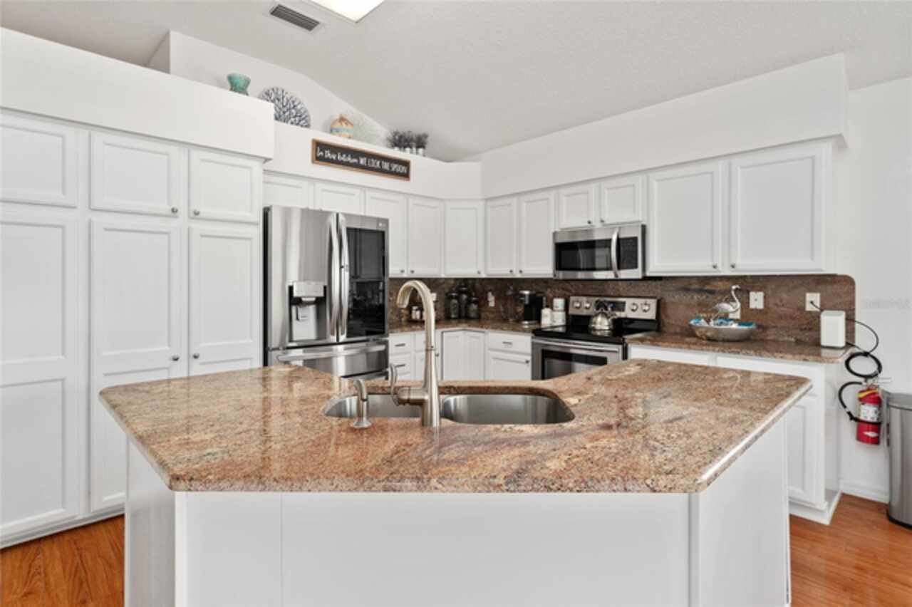 This stylish and desirable 3/2, 1831sf Sierra Model home is located near the 15th hole of the Tierra del Sol golf course. PRIVATE VIEW OF THE GOLF COURSE W/ NO CART PATH IN SITE! It has a SPLIT PLAN which allows guests their own private bath and bedroom area. The kitchen is bright and spacious with STAINLESS STEEL APPLIANCES, BREAKFAST BAR, WHITE CABINETS, GRANITE COUNTERS/ BACKSPLASH, and a space for a dining table that overlooks the greens. NEUTRAL Interior paint. Great bedroom sizes. Large screened-in lanai and birdcage with OUTDOOR SINK and in-ground hot tub. Elevated PROFESSIONALLY LANDSCAPED and the exterior is BLOCK & STUCCO. TANKLESS H20 HTR, NEW ROOF, NEW WASHER/ DRYER, NEW DECORATIVE DRIVEWAY, EPOXY garage floor. HIGH END WHOLE HOUSE FILTRATION and WATER SOFTENING SYSTEM. NO BOND. Some of the lovely furnishings are available separately. Superior location, just minutes from 466 shopping, restaurants, banks, pools and Rec areas. SHORT CART RIDE to Sumter Lndg. This home is unique and beautiful so don’t miss the opportunity to see it.
