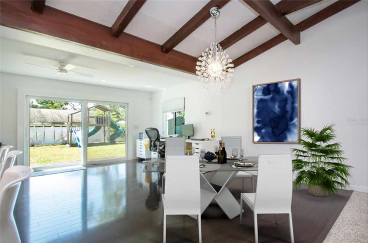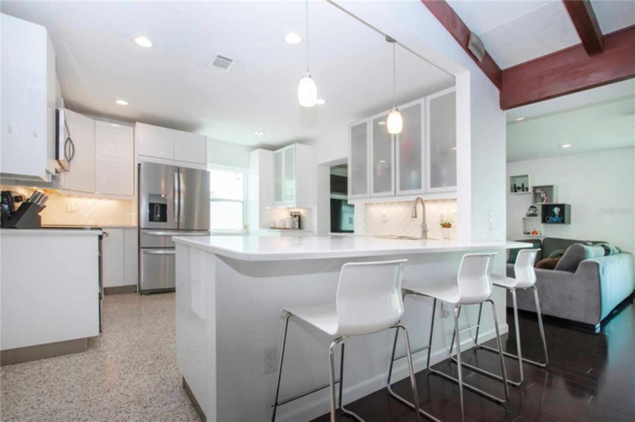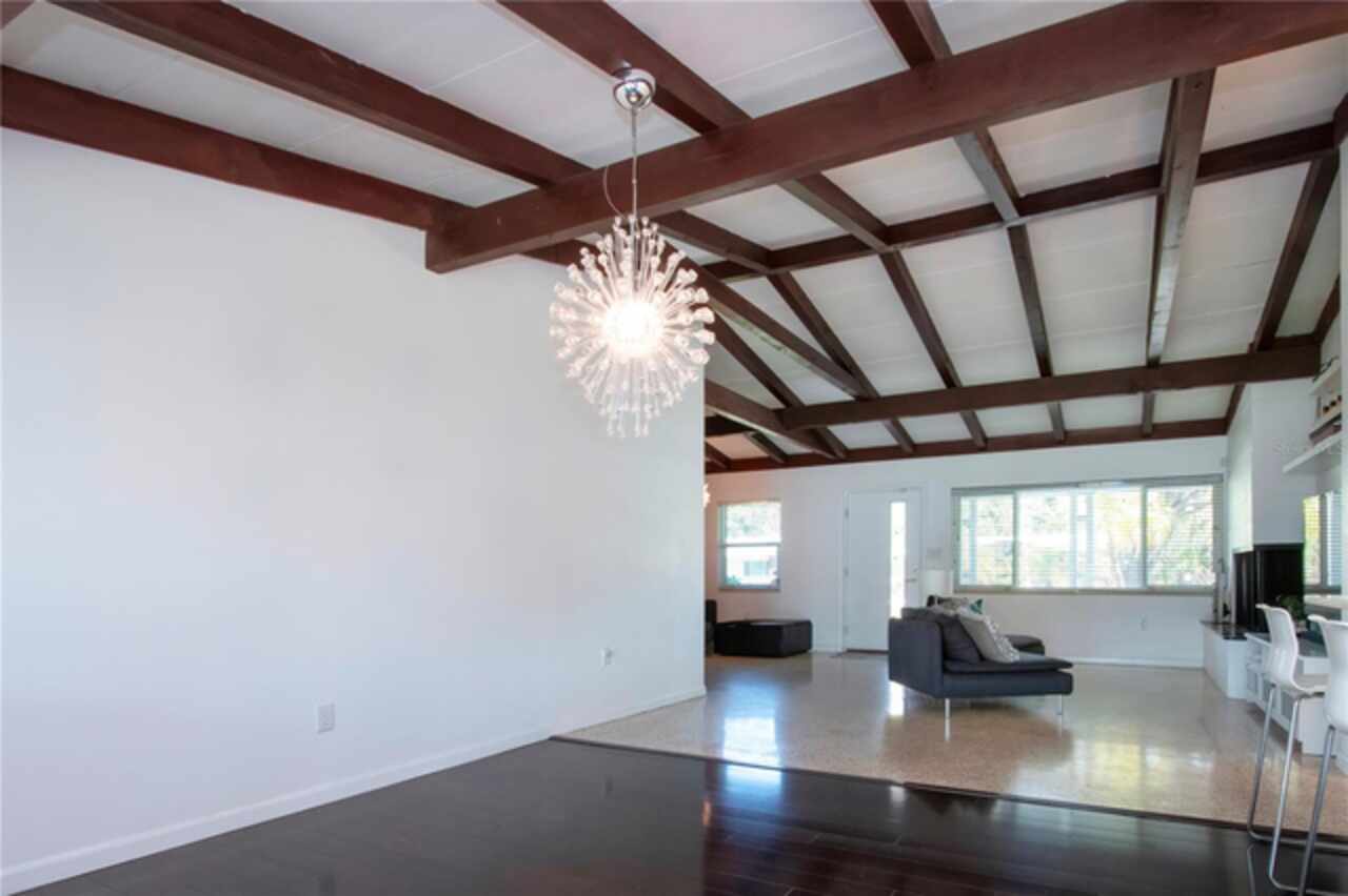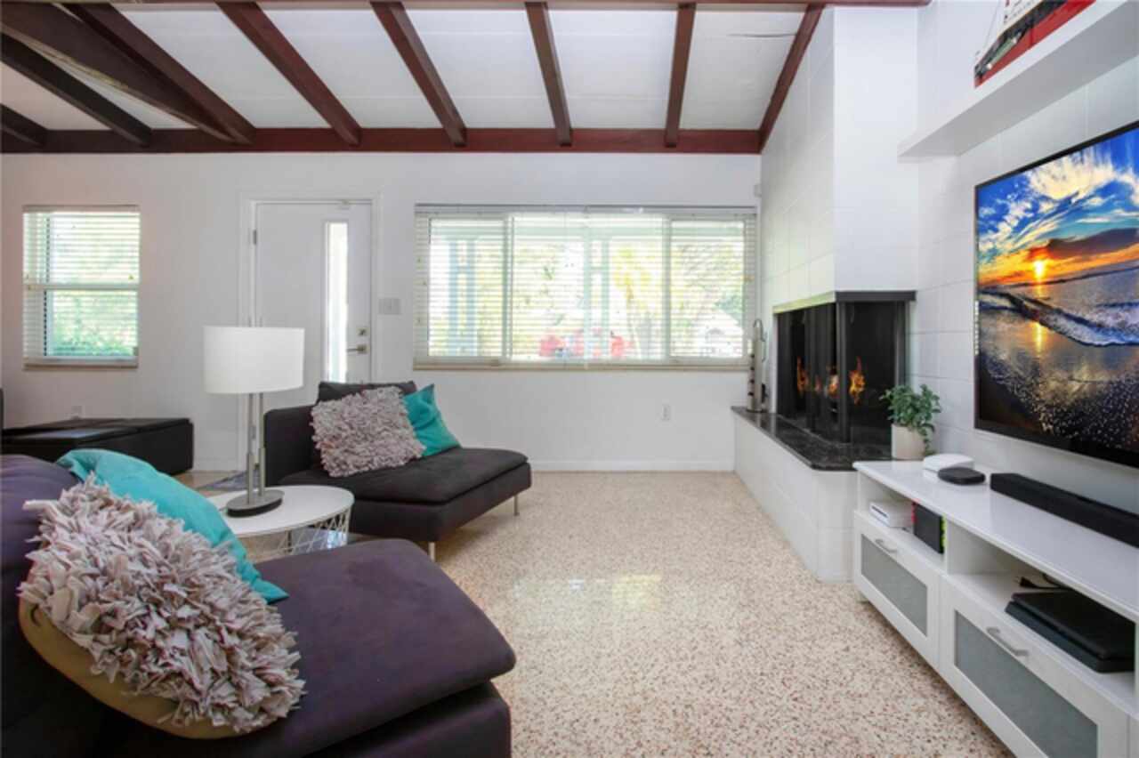 One or more photo(s) has been virtually staged. BACK ON THE MARKET WITH A SIGNIFICANT PRICE REDUCTION!!! Don't let the modest exterior fool you...the drama is inside!! This mid-century home has been completely updated both inside and out! As you enter the home, you are met with soaring cathedral ceilings with exposed beams. The spacious kitchen has been completely updated with sleek modern cabinets, backsplash and quartz counters. The large bar is the perfect spot for the family to gather. The mid century architecture continues with gleaming terrazzo floors, a cool wood-burning fireplace and built-ins in one of the two living areas. A family room addition provides plenty of casual living space as well as easy access to the large private back yard (room for a pool). This home has been made hurricane ready with NEW ROOF WITH EXTRA HURRICANE STRAPS, NEW IMPACT RESISTANCE WINDOWS AND DOORS, TWO NEW AC SYSTEMS, EXTRA ATTIC INSULATION and a SECURITY SYSTEM. Plumbing and electric upgraded in 2014... Walk to Southside School and Brookside Middle School, bike to the beach while enjoying easy access to downtown restaurants and shops.